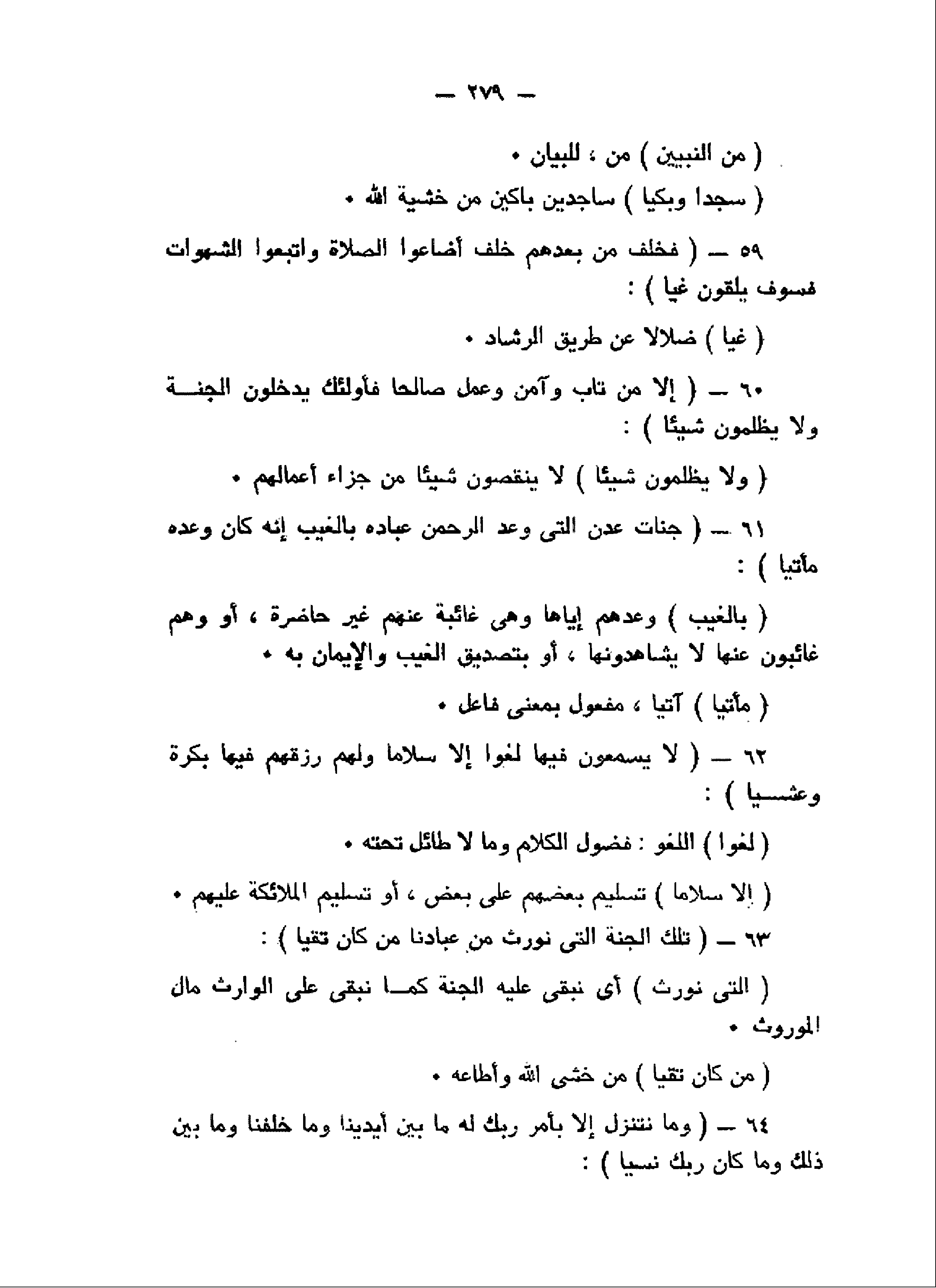 فَخَلَفَ مِنْ بَعْدِهِمْ خَلْفٌ أَضاعُوا الصَّلاةَ وَاتَّبَعُوا الشَّهَواتِ فَسَوْفَ يَلْقَوْنَ غَيًّا (59) إِلاَّ مَنْ تابَ وَآمَنَ وَعَمِلَ صالِحاً فَأُولئِكَ يَدْخُلُونَ الْجَنَّةَ وَلا يُظْلَمُونَ شَيْئاً (60) جَنَّاتِ عَدْنٍ الَّتِي وَعَدَ الرَّحْمنُ عِبادَهُ بِالْغَيْبِ إِنَّهُ كانَ وَعْدُهُ مَأْتِيًّا (61) لا يَسْمَعُونَ فِيها لَغْواً إِلاَّ سَلاماً وَلَهُمْ رِزْقُهُمْ فِيها بُكْرَةً وَعَشِيًّا (62) تِلْكَ الْجَنَّةُ الَّتِي نُورِثُ مِنْ عِبادِنا مَنْ كانَ تَقِيًّا (63)