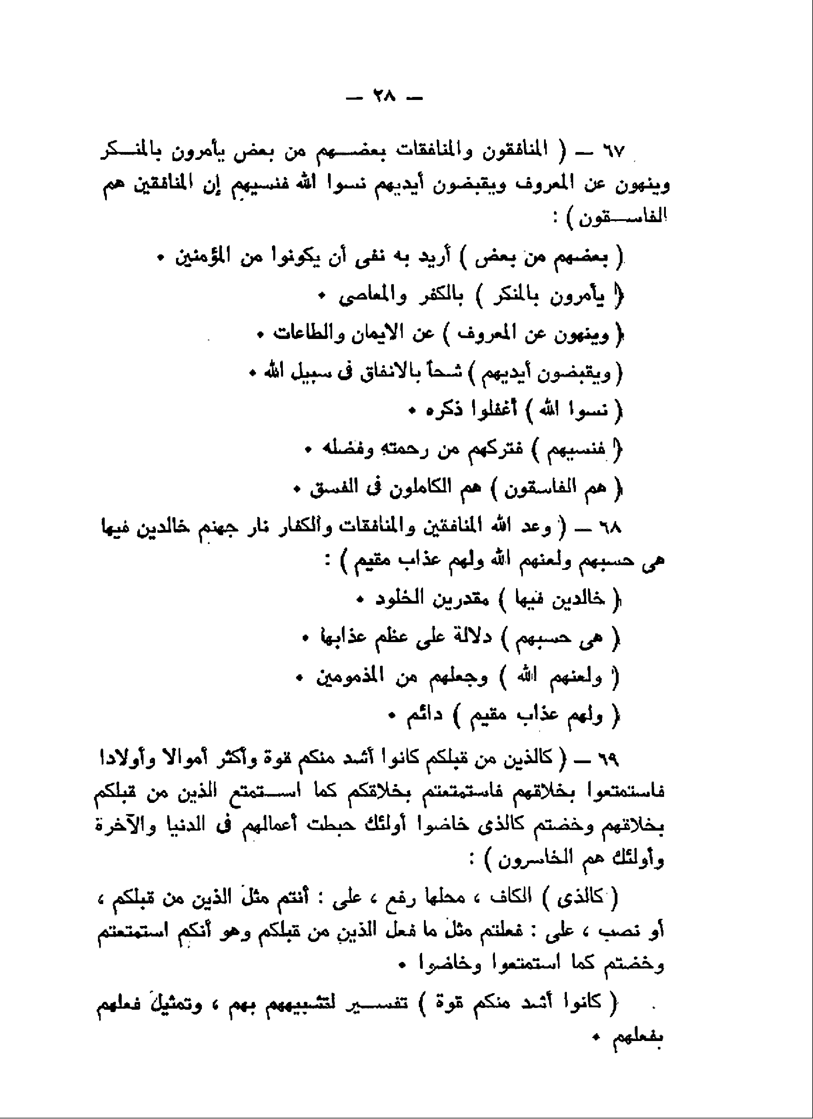 الْمُنافِقُونَ وَالْمُنافِقاتُ بَعْضُهُمْ مِنْ بَعْضٍ يَأْمُرُونَ بِالْمُنْكَرِ وَيَنْهَوْنَ عَنِ الْمَعْرُوفِ وَيَقْبِضُونَ أَيْدِيَهُمْ نَسُوا اللَّهَ فَنَسِيَهُمْ إِنَّ الْمُنافِقِينَ هُمُ الْفاسِقُونَ (67) وَعَدَ اللَّهُ الْمُنافِقِينَ وَالْمُنافِقاتِ وَالْكُفَّارَ نارَ جَهَنَّمَ خالِدِينَ فِيها هِيَ حَسْبُهُمْ وَلَعَنَهُمُ اللَّهُ وَلَهُمْ عَذابٌ مُقِيمٌ (68) كَالَّذِينَ مِنْ قَبْلِكُمْ كانُوا أَشَدَّ مِنْكُمْ قُوَّةً وَأَكْثَرَ أَمْوالاً وَأَوْلاداً فَاسْتَمْتَعُوا بِخَلاقِهِمْ فَاسْتَمْتَعْتُمْ بِخَلاقِكُمْ كَمَا اسْتَمْتَعَ الَّذِينَ مِنْ قَبْلِكُمْ بِخَلاقِهِمْ وَخُضْتُمْ كَالَّذِي خاضُوا أُولئِكَ حَبِطَتْ أَعْمالُهُمْ فِي الدُّنْيا وَالْآخِرَةِ وَأُولئِكَ هُمُ الْخاسِرُونَ (69)