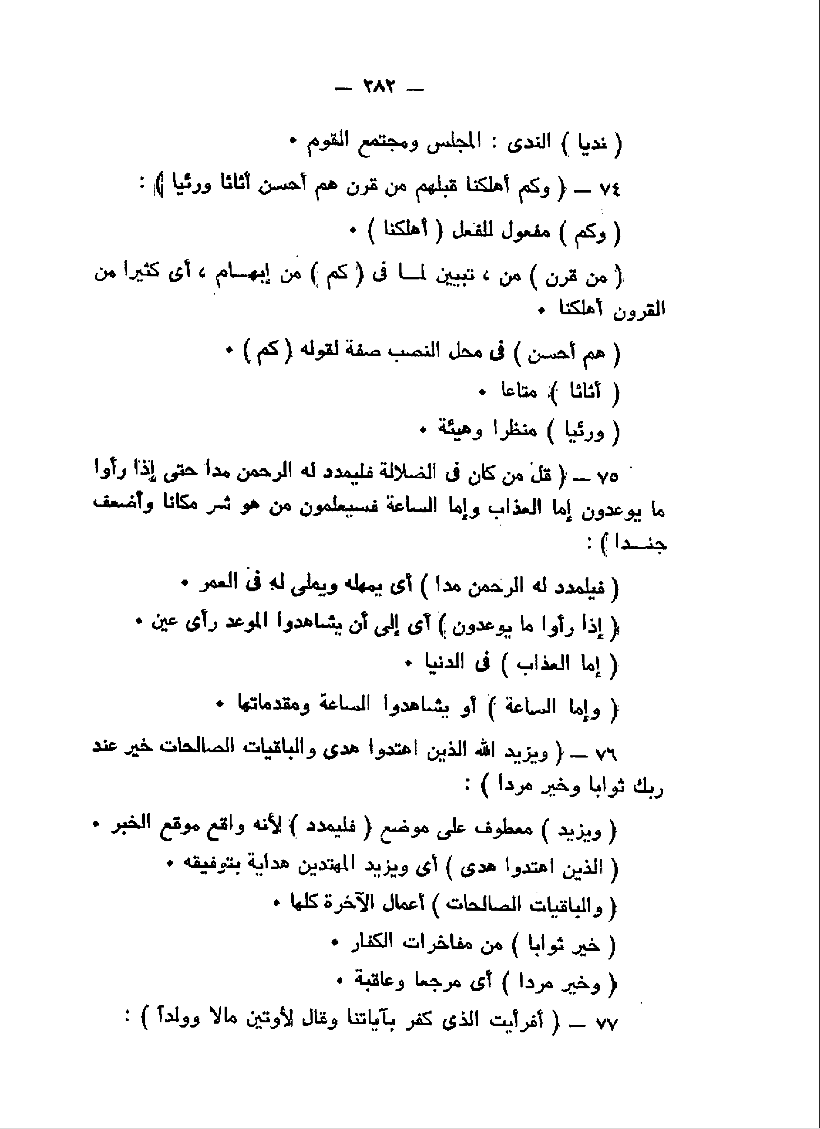 وَكَمْ أَهْلَكْنا قَبْلَهُمْ مِنْ قَرْنٍ هُمْ أَحْسَنُ أَثاثاً وَرِءْياً (74) قُلْ مَنْ كانَ فِي الضَّلالَةِ فَلْيَمْدُدْ لَهُ الرَّحْمنُ مَدًّا حَتَّى إِذا رَأَوْا ما يُوعَدُونَ إِمَّا الْعَذابَ وَإِمَّا السَّاعَةَ فَسَيَعْلَمُونَ مَنْ هُوَ شَرٌّ مَكاناً وَأَضْعَفُ جُنْداً (75) وَيَزِيدُ اللَّهُ الَّذِينَ اهْتَدَوْا هُدىً وَالْباقِياتُ الصَّالِحاتُ خَيْرٌ عِنْدَ رَبِّكَ ثَواباً وَخَيْرٌ مَرَدًّا (76) أَفَرَأَيْتَ الَّذِي كَفَرَ بِآياتِنا وَقالَ لَأُوتَيَنَّ مالاً وَوَلَداً (77)