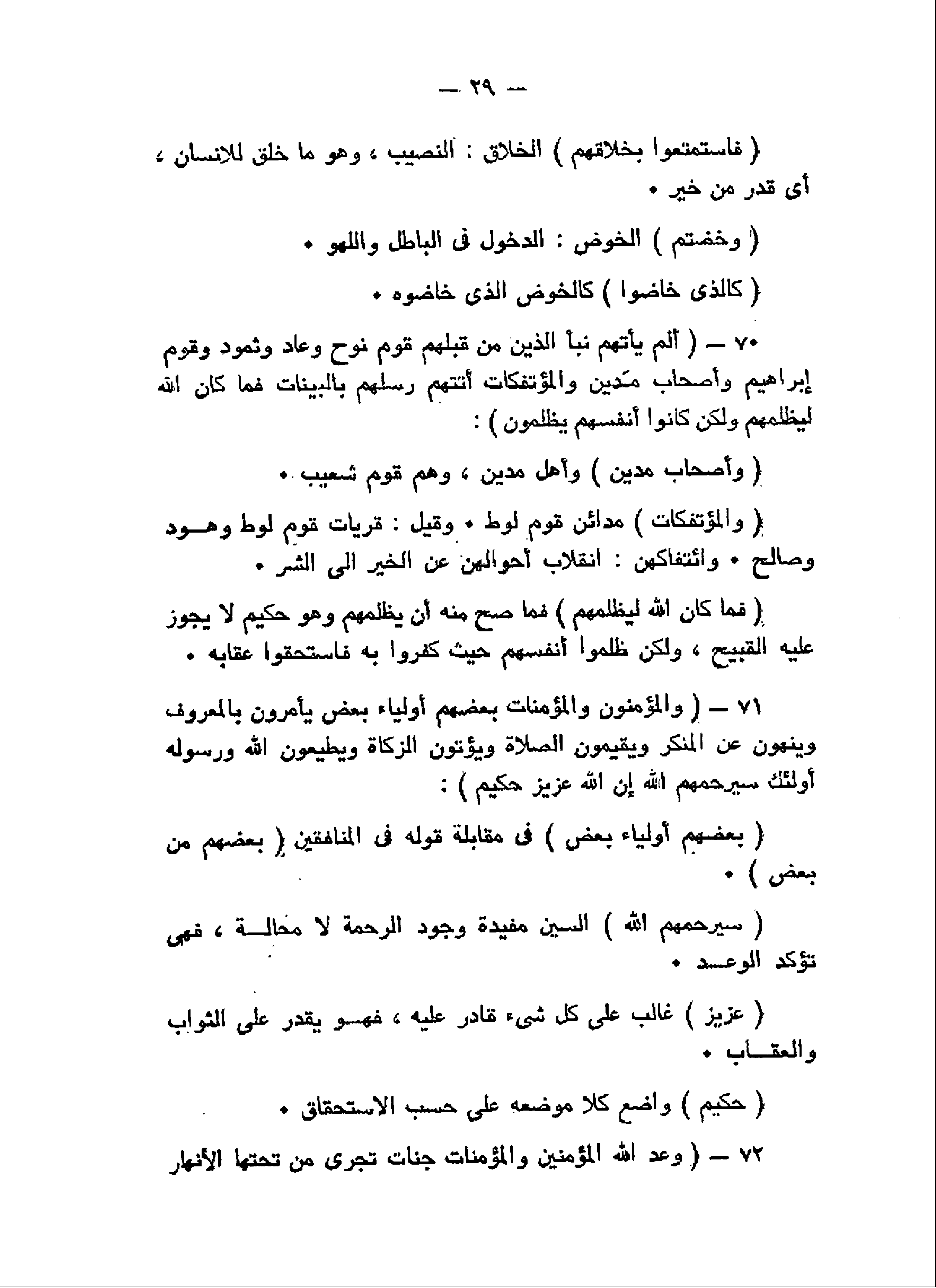 أَلَمْ يَأْتِهِمْ نَبَأُ الَّذِينَ مِنْ قَبْلِهِمْ قَوْمِ نُوحٍ وَعادٍ وَثَمُودَ وَقَوْمِ إِبْراهِيمَ وَأَصْحابِ مَدْيَنَ وَالْمُؤْتَفِكاتِ أَتَتْهُمْ رُسُلُهُمْ بِالْبَيِّناتِ فَما كانَ اللَّهُ لِيَظْلِمَهُمْ وَلكِنْ كانُوا أَنْفُسَهُمْ يَظْلِمُونَ (70) وَالْمُؤْمِنُونَ وَالْمُؤْمِناتُ بَعْضُهُمْ أَوْلِياءُ بَعْضٍ يَأْمُرُونَ بِالْمَعْرُوفِ وَيَنْهَوْنَ عَنِ الْمُنْكَرِ وَيُقِيمُونَ الصَّلاةَ وَيُؤْتُونَ الزَّكاةَ وَيُطِيعُونَ اللَّهَ وَرَسُولَهُ أُولئِكَ سَيَرْحَمُهُمُ اللَّهُ إِنَّ اللَّهَ عَزِيزٌ حَكِيمٌ (71) وَعَدَ اللَّهُ الْمُؤْمِنِينَ وَالْمُؤْمِناتِ جَنَّاتٍ تَجْرِي مِنْ تَحْتِهَا الْأَنْهارُ خالِدِينَ فِيها وَمَساكِنَ طَيِّبَةً فِي جَنَّاتِ عَدْنٍ وَرِضْوانٌ مِنَ اللَّهِ أَكْبَرُ ذلِكَ هُوَ الْفَوْزُ الْعَظِيمُ (72)