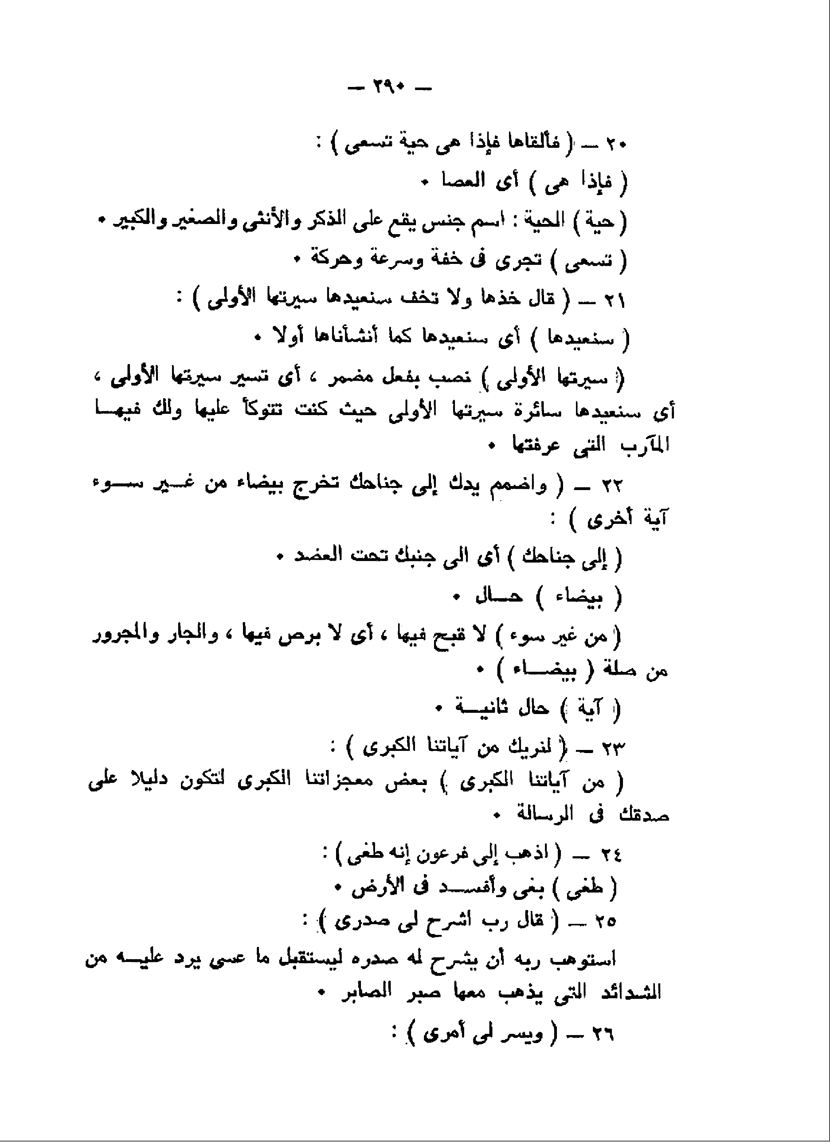 فَأَلْقاها فَإِذا هِيَ حَيَّةٌ تَسْعى (20) قالَ خُذْها وَلا تَخَفْ سَنُعِيدُها سِيرَتَهَا الْأُولى (21) وَاضْمُمْ يَدَكَ إِلى جَناحِكَ تَخْرُجْ بَيْضاءَ مِنْ غَيْرِ سُوءٍ آيَةً أُخْرى (22) لِنُرِيَكَ مِنْ آياتِنَا الْكُبْرى (23) اذْهَبْ إِلى فِرْعَوْنَ إِنَّهُ طَغى (24)