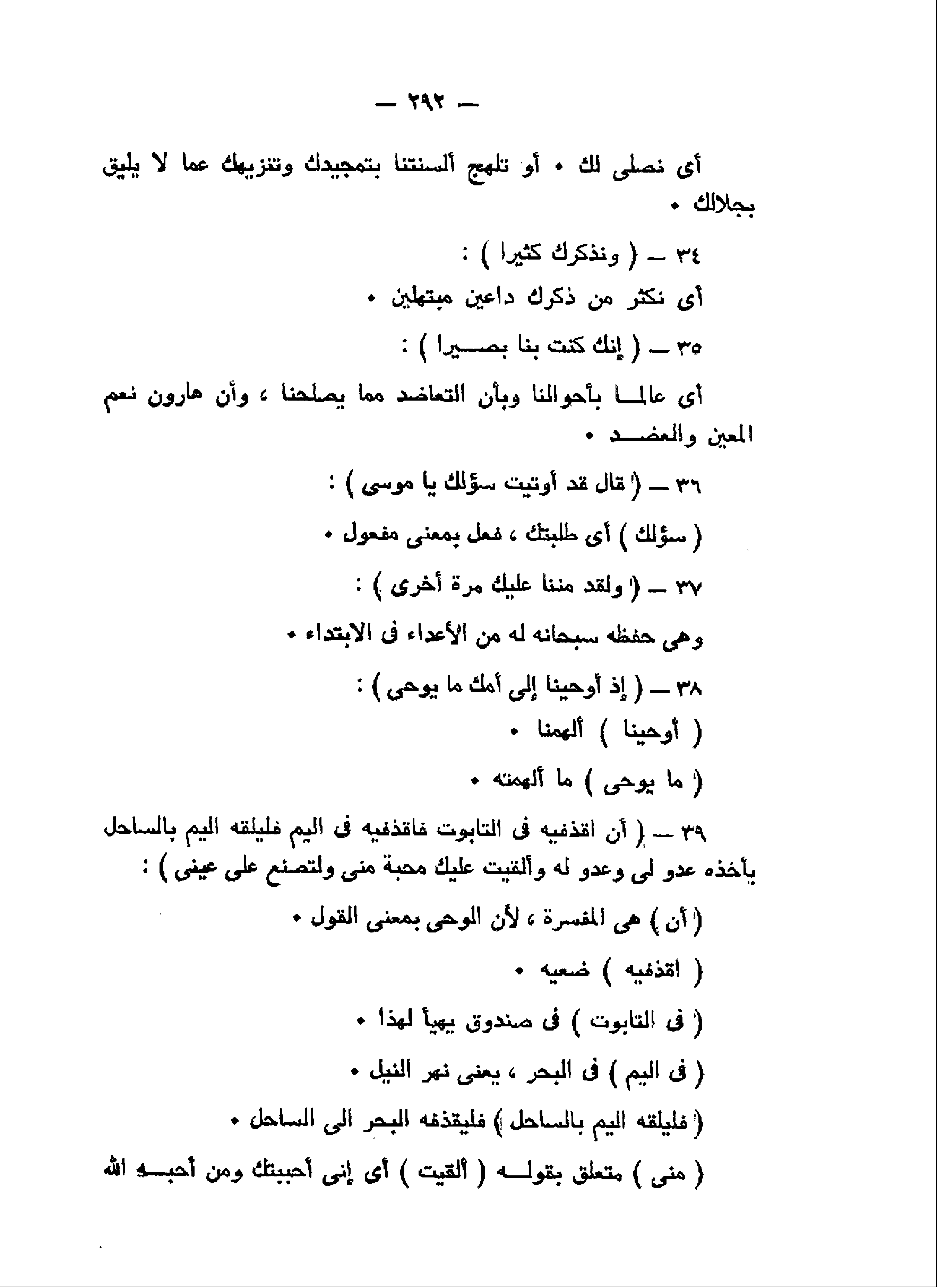 وَنَذْكُرَكَ كَثِيراً (34) إِنَّكَ كُنْتَ بِنا بَصِيراً (35) قالَ قَدْ أُوتِيتَ سُؤْلَكَ يا مُوسى (36) وَلَقَدْ مَنَنَّا عَلَيْكَ مَرَّةً أُخْرى (37) إِذْ أَوْحَيْنا إِلى أُمِّكَ ما يُوحى (38)