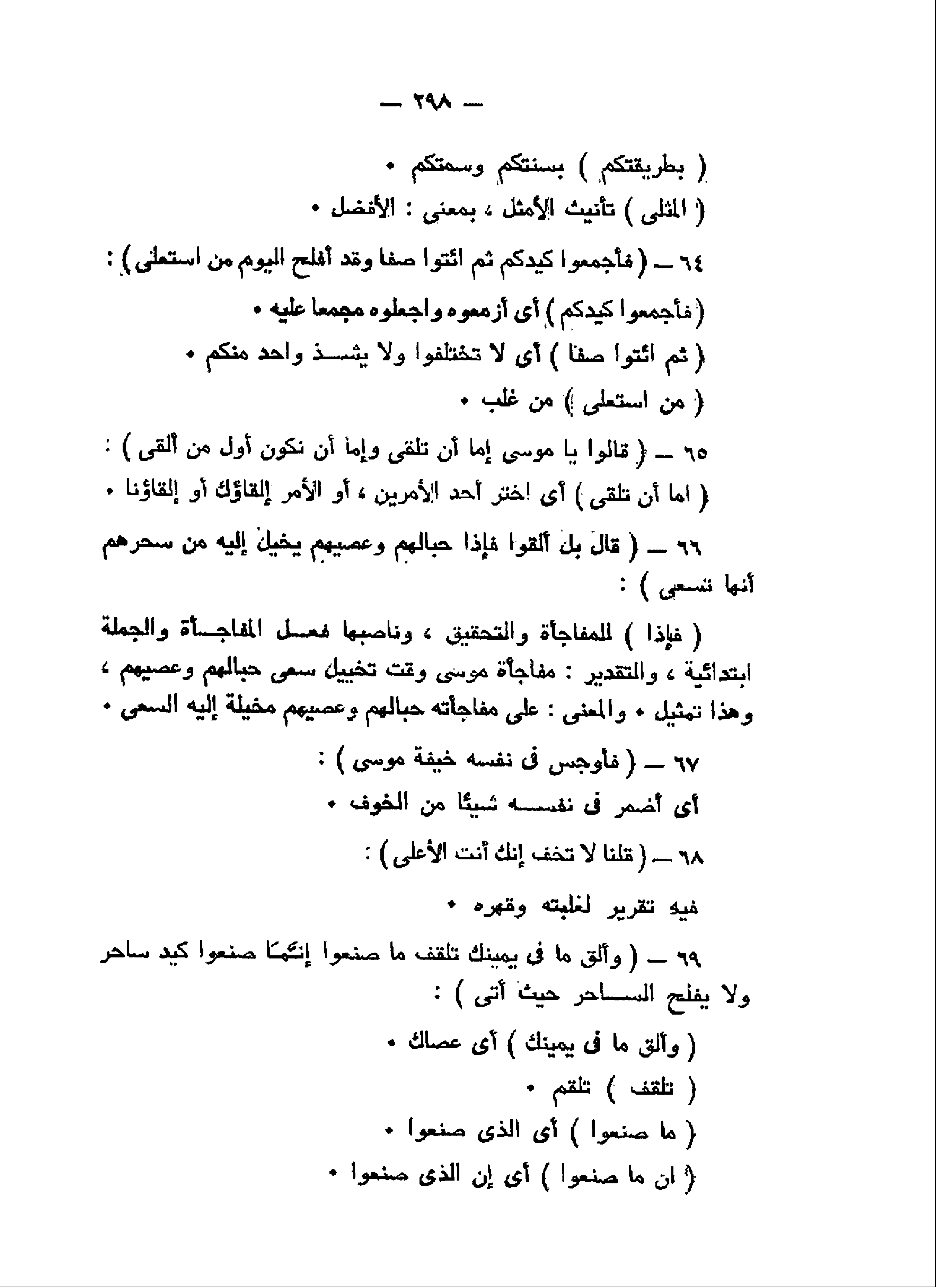 فَأَجْمِعُوا كَيْدَكُمْ ثُمَّ ائْتُوا صَفًّا وَقَدْ أَفْلَحَ الْيَوْمَ مَنِ اسْتَعْلى (64) قالُوا يا مُوسى إِمَّا أَنْ تُلْقِيَ وَإِمَّا أَنْ نَكُونَ أَوَّلَ مَنْ أَلْقى (65) قالَ بَلْ أَلْقُوا فَإِذا حِبالُهُمْ وَعِصِيُّهُمْ يُخَيَّلُ إِلَيْهِ مِنْ سِحْرِهِمْ أَنَّها تَسْعى (66) فَأَوْجَسَ فِي نَفْسِهِ خِيفَةً مُوسى (67) قُلْنا لا تَخَفْ إِنَّكَ أَنْتَ الْأَعْلى (68)