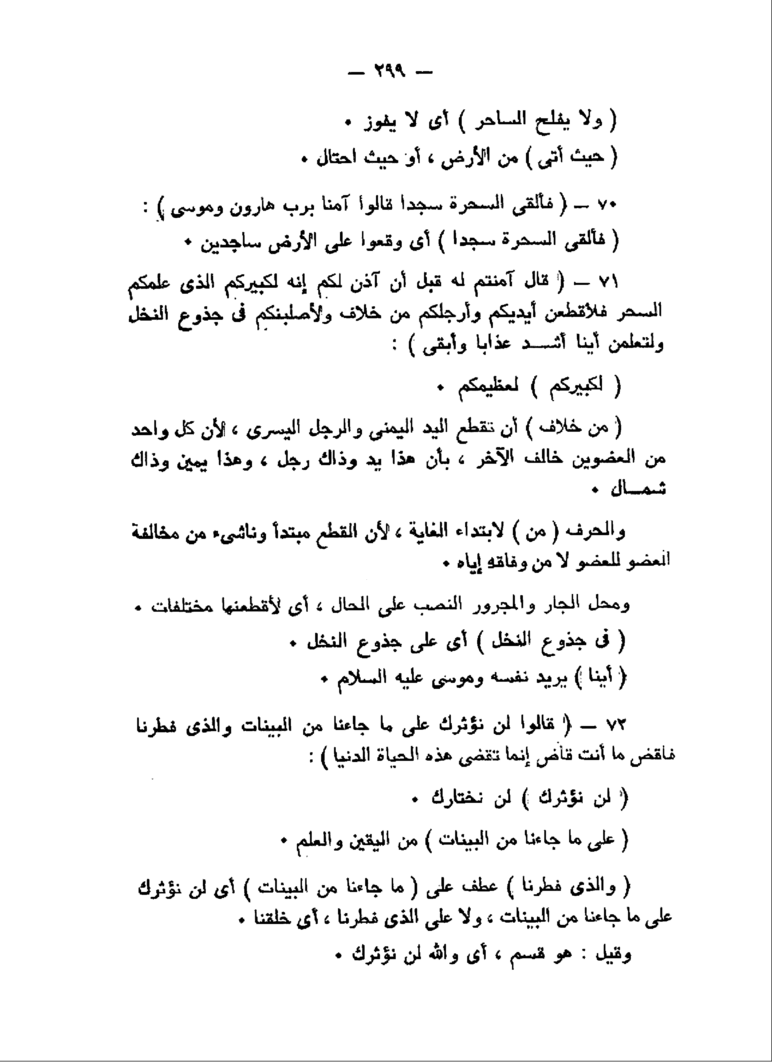 فَأُلْقِيَ السَّحَرَةُ سُجَّداً قالُوا آمَنَّا بِرَبِّ هارُونَ وَمُوسى (70) قالَ آمَنْتُمْ لَهُ قَبْلَ أَنْ آذَنَ لَكُمْ إِنَّهُ لَكَبِيرُكُمُ الَّذِي عَلَّمَكُمُ السِّحْرَ فَلَأُقَطِّعَنَّ أَيْدِيَكُمْ وَأَرْجُلَكُمْ مِنْ خِلافٍ وَلَأُصَلِّبَنَّكُمْ فِي جُذُوعِ النَّخْلِ وَلَتَعْلَمُنَّ أَيُّنا أَشَدُّ عَذاباً وَأَبْقى (71) قالُوا لَنْ نُؤْثِرَكَ عَلى ما جاءَنا مِنَ الْبَيِّناتِ وَالَّذِي فَطَرَنا فَاقْضِ ما أَنْتَ قاضٍ إِنَّما تَقْضِي هذِهِ الْحَياةَ الدُّنْيا (72)