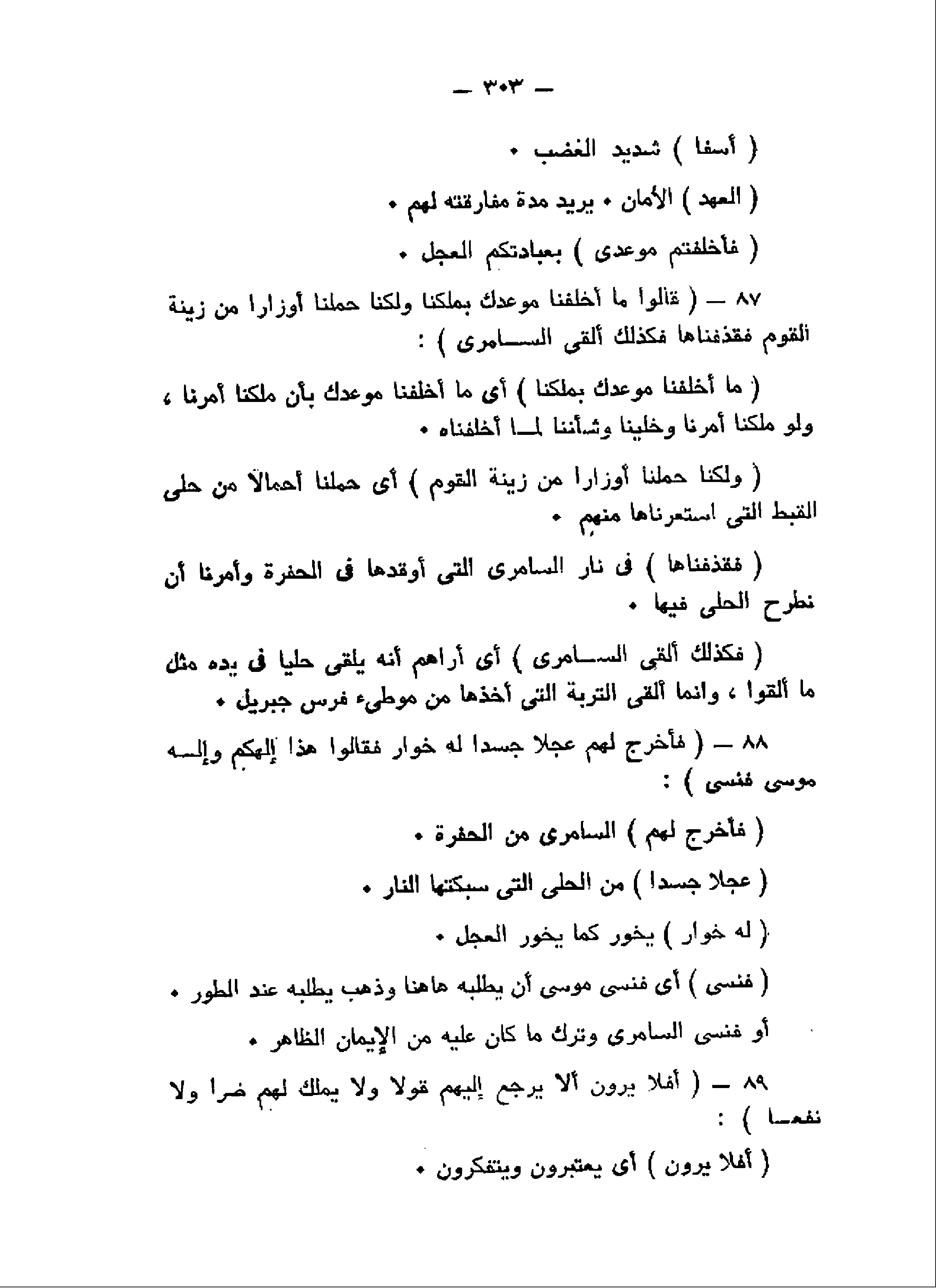 قالُوا ما أَخْلَفْنا مَوْعِدَكَ بِمَلْكِنا وَلكِنَّا حُمِّلْنا أَوْزاراً مِنْ زِينَةِ الْقَوْمِ فَقَذَفْناها فَكَذلِكَ أَلْقَى السَّامِرِيُّ (87) فَأَخْرَجَ لَهُمْ عِجْلاً جَسَداً لَهُ خُوارٌ فَقالُوا هذا إِلهُكُمْ وَإِلهُ مُوسى فَنَسِيَ (88) أَفَلا يَرَوْنَ أَلاَّ يَرْجِعُ إِلَيْهِمْ قَوْلاً وَلا يَمْلِكُ لَهُمْ ضَرًّا وَلا نَفْعاً (89)