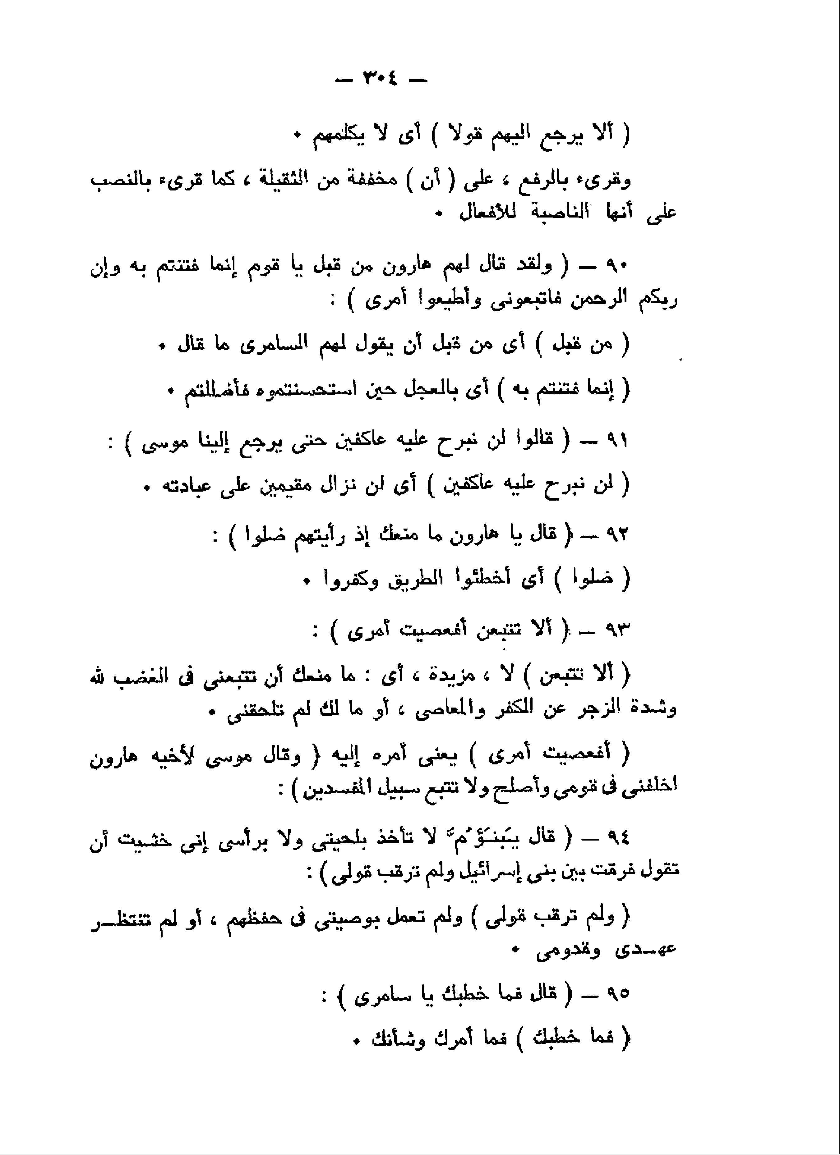 وَلَقَدْ قالَ لَهُمْ هارُونُ مِنْ قَبْلُ يا قَوْمِ إِنَّما فُتِنْتُمْ بِهِ وَإِنَّ رَبَّكُمُ الرَّحْمنُ فَاتَّبِعُونِي وَأَطِيعُوا أَمْرِي (90) قالُوا لَنْ نَبْرَحَ عَلَيْهِ عاكِفِينَ حَتَّى يَرْجِعَ إِلَيْنا مُوسى (91) قالَ يا هارُونُ ما مَنَعَكَ إِذْ رَأَيْتَهُمْ ضَلُّوا (92) أَلاَّ تَتَّبِعَنِ أَفَعَصَيْتَ أَمْرِي (93) قالَ يَا بْنَ أُمَّ لا تَأْخُذْ بِلِحْيَتِي وَلا بِرَأْسِي إِنِّي خَشِيتُ أَنْ تَقُولَ فَرَّقْتَ بَيْنَ بَنِي إِسْرائِيلَ وَلَمْ تَرْقُبْ قَوْلِي (94)