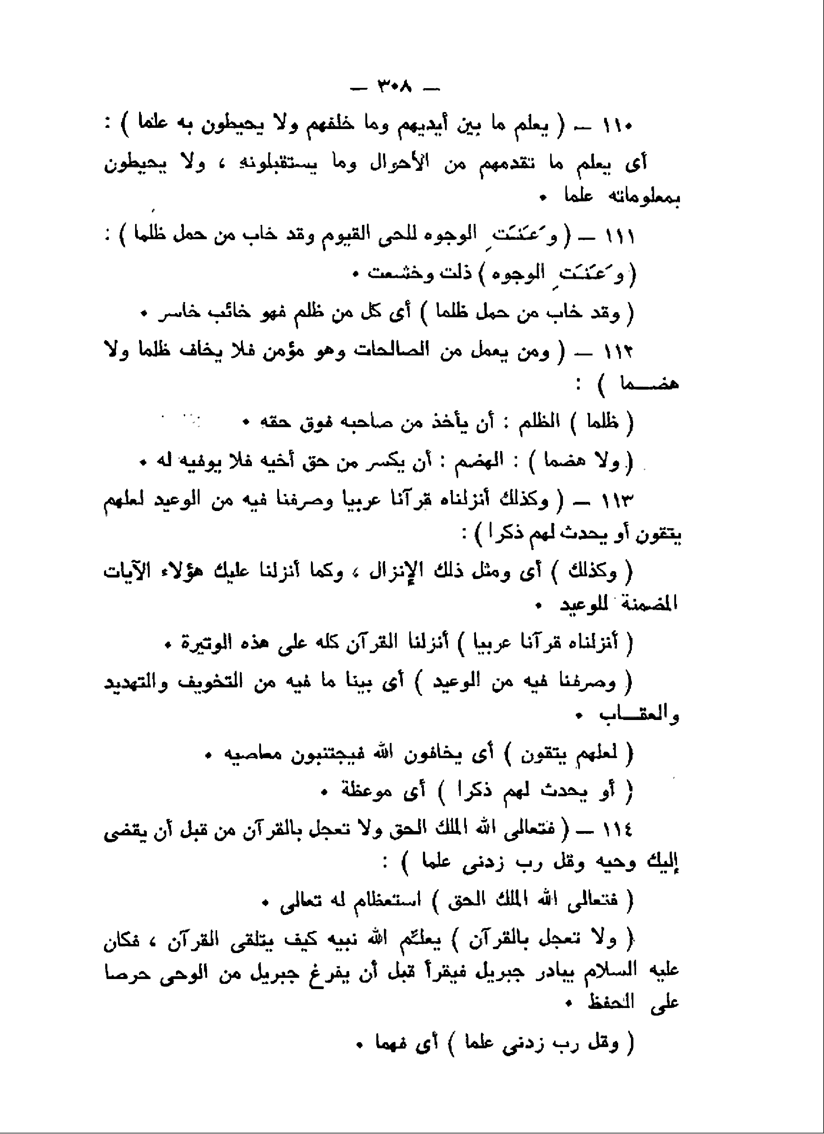 يَعْلَمُ ما بَيْنَ أَيْدِيهِمْ وَما خَلْفَهُمْ وَلا يُحِيطُونَ بِهِ عِلْماً (110) وَعَنَتِ الْوُجُوهُ لِلْحَيِّ الْقَيُّومِ وَقَدْ خابَ مَنْ حَمَلَ ظُلْماً (111) وَمَنْ يَعْمَلْ مِنَ الصَّالِحاتِ وَهُوَ مُؤْمِنٌ فَلا يَخافُ ظُلْماً وَلا هَضْماً (112) وَكَذلِكَ أَنْزَلْناهُ قُرْآناً عَرَبِيًّا وَصَرَّفْنا فِيهِ مِنَ الْوَعِيدِ لَعَلَّهُمْ يَتَّقُونَ أَوْ يُحْدِثُ لَهُمْ ذِكْراً (113) فَتَعالَى اللَّهُ الْمَلِكُ الْحَقُّ وَلا تَعْجَلْ بِالْقُرْآنِ مِنْ قَبْلِ أَنْ يُقْضى إِلَيْكَ وَحْيُهُ وَقُلْ رَبِّ زِدْنِي عِلْماً (114)