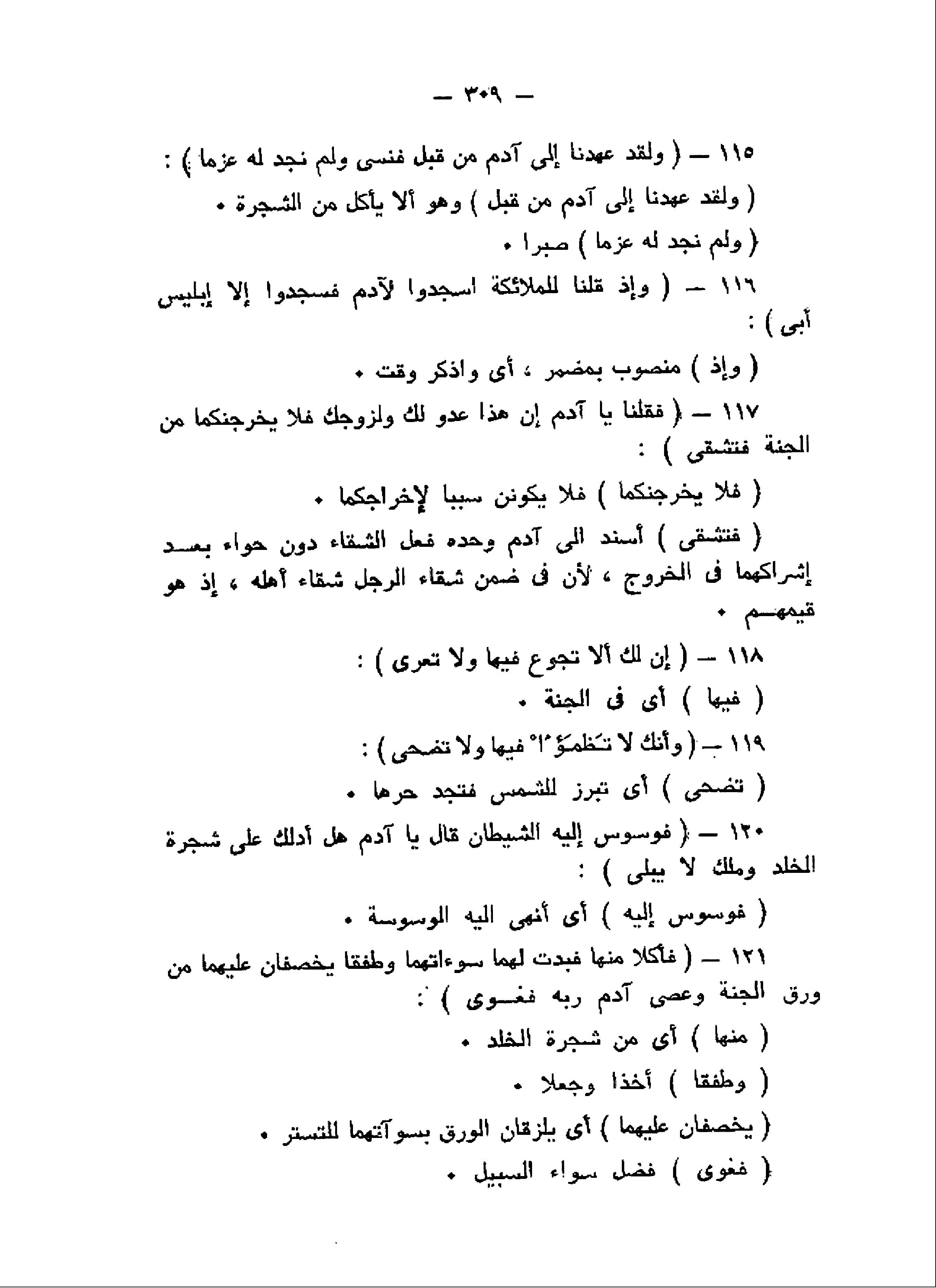 وَلَقَدْ عَهِدْنا إِلى آدَمَ مِنْ قَبْلُ فَنَسِيَ وَلَمْ نَجِدْ لَهُ عَزْماً (115) وَإِذْ قُلْنا لِلْمَلائِكَةِ اسْجُدُوا لِآدَمَ فَسَجَدُوا إِلاَّ إِبْلِيسَ أَبى (116) فَقُلْنا يا آدَمُ إِنَّ هذا عَدُوٌّ لَكَ وَلِزَوْجِكَ فَلا يُخْرِجَنَّكُما مِنَ الْجَنَّةِ فَتَشْقى (117) إِنَّ لَكَ أَلاَّ تَجُوعَ فِيها وَلا تَعْرى (118) وَأَنَّكَ لا تَظْمَؤُا فِيها وَلا تَضْحى (119)