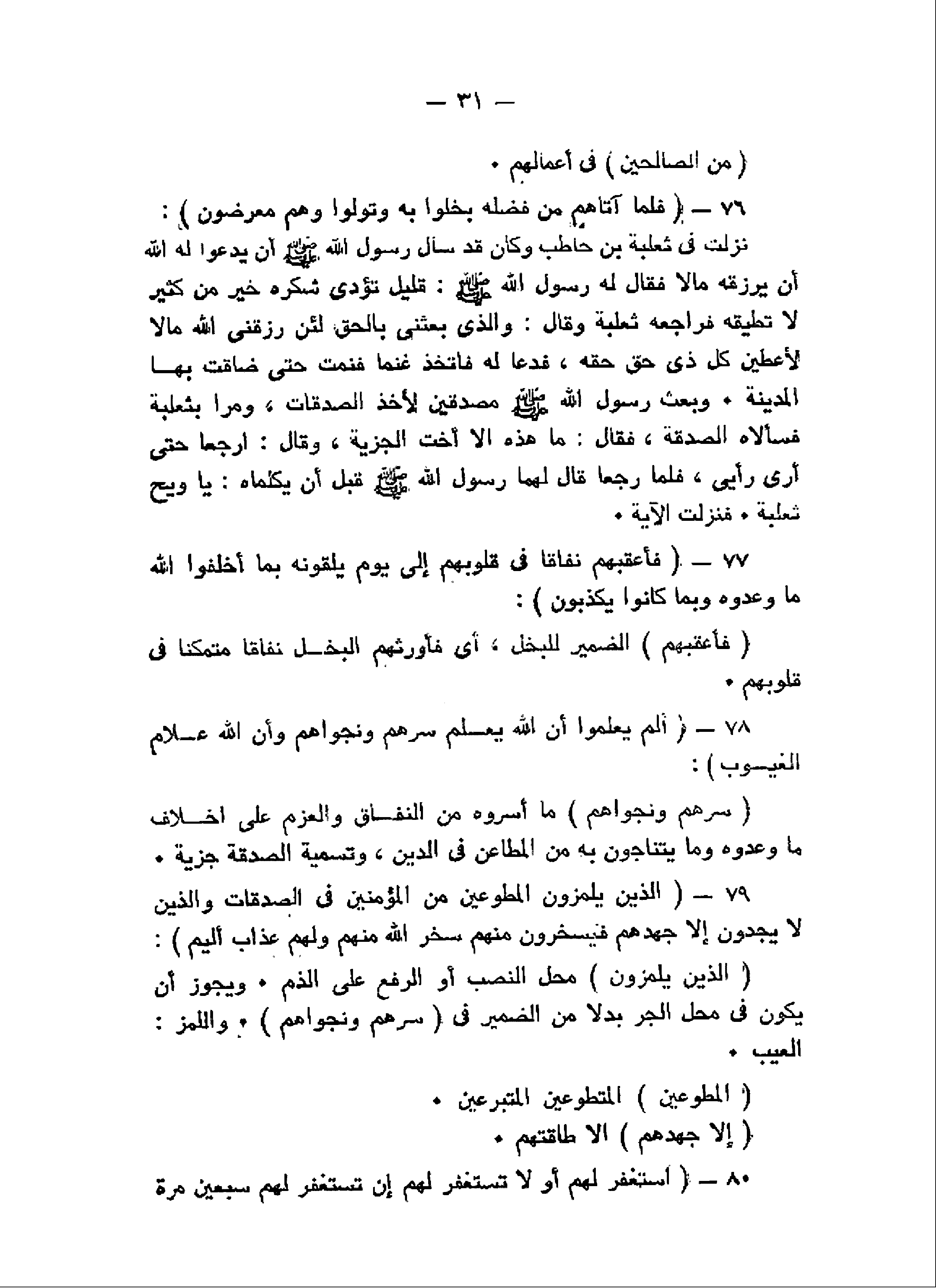 فَلَمَّا آتاهُمْ مِنْ فَضْلِهِ بَخِلُوا بِهِ وَتَوَلَّوْا وَهُمْ مُعْرِضُونَ (76) فَأَعْقَبَهُمْ نِفاقاً فِي قُلُوبِهِمْ إِلى يَوْمِ يَلْقَوْنَهُ بِما أَخْلَفُوا اللَّهَ ما وَعَدُوهُ وَبِما كانُوا يَكْذِبُونَ (77) أَلَمْ يَعْلَمُوا أَنَّ اللَّهَ يَعْلَمُ سِرَّهُمْ وَنَجْواهُمْ وَأَنَّ اللَّهَ عَلاَّمُ الْغُيُوبِ (78) الَّذِينَ يَلْمِزُونَ الْمُطَّوِّعِينَ مِنَ الْمُؤْمِنِينَ فِي الصَّدَقاتِ وَالَّذِينَ لا يَجِدُونَ إِلاَّ جُهْدَهُمْ فَيَسْخَرُونَ مِنْهُمْ سَخِرَ اللَّهُ مِنْهُمْ وَلَهُمْ عَذابٌ أَلِيمٌ (79) اسْتَغْفِرْ لَهُمْ أَوْ لا تَسْتَغْفِرْ لَهُمْ إِنْ تَسْتَغْفِرْ لَهُمْ سَبْعِينَ مَرَّةً فَلَنْ يَغْفِرَ اللَّهُ لَهُمْ ذلِكَ بِأَنَّهُمْ كَفَرُوا بِاللَّهِ وَرَسُولِهِ وَاللَّهُ لا يَهْدِي الْقَوْمَ الْفاسِقِينَ (80)
