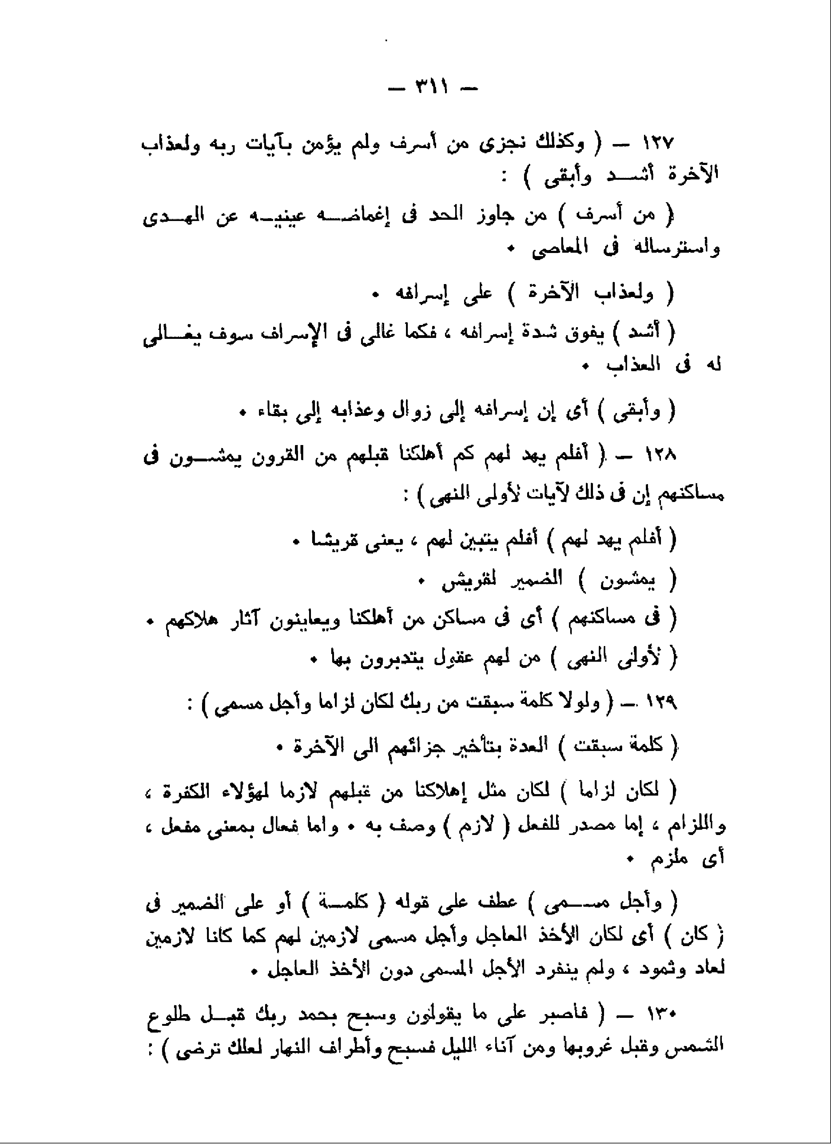 وَكَذلِكَ نَجْزِي مَنْ أَسْرَفَ وَلَمْ يُؤْمِنْ بِآياتِ رَبِّهِ وَلَعَذابُ الْآخِرَةِ أَشَدُّ وَأَبْقى (127) أَفَلَمْ يَهْدِ لَهُمْ كَمْ أَهْلَكْنا قَبْلَهُمْ مِنَ الْقُرُونِ يَمْشُونَ فِي مَساكِنِهِمْ إِنَّ فِي ذلِكَ لَآياتٍ لِأُولِي النُّهى (128) وَلَوْلا كَلِمَةٌ سَبَقَتْ مِنْ رَبِّكَ لَكانَ لِزاماً وَأَجَلٌ مُسَمًّى (129) فَاصْبِرْ عَلى ما يَقُولُونَ وَسَبِّحْ بِحَمْدِ رَبِّكَ قَبْلَ طُلُوعِ الشَّمْسِ وَقَبْلَ غُرُوبِها وَمِنْ آناءِ اللَّيْلِ فَسَبِّحْ وَأَطْرافَ النَّهارِ لَعَلَّكَ تَرْضى (130)