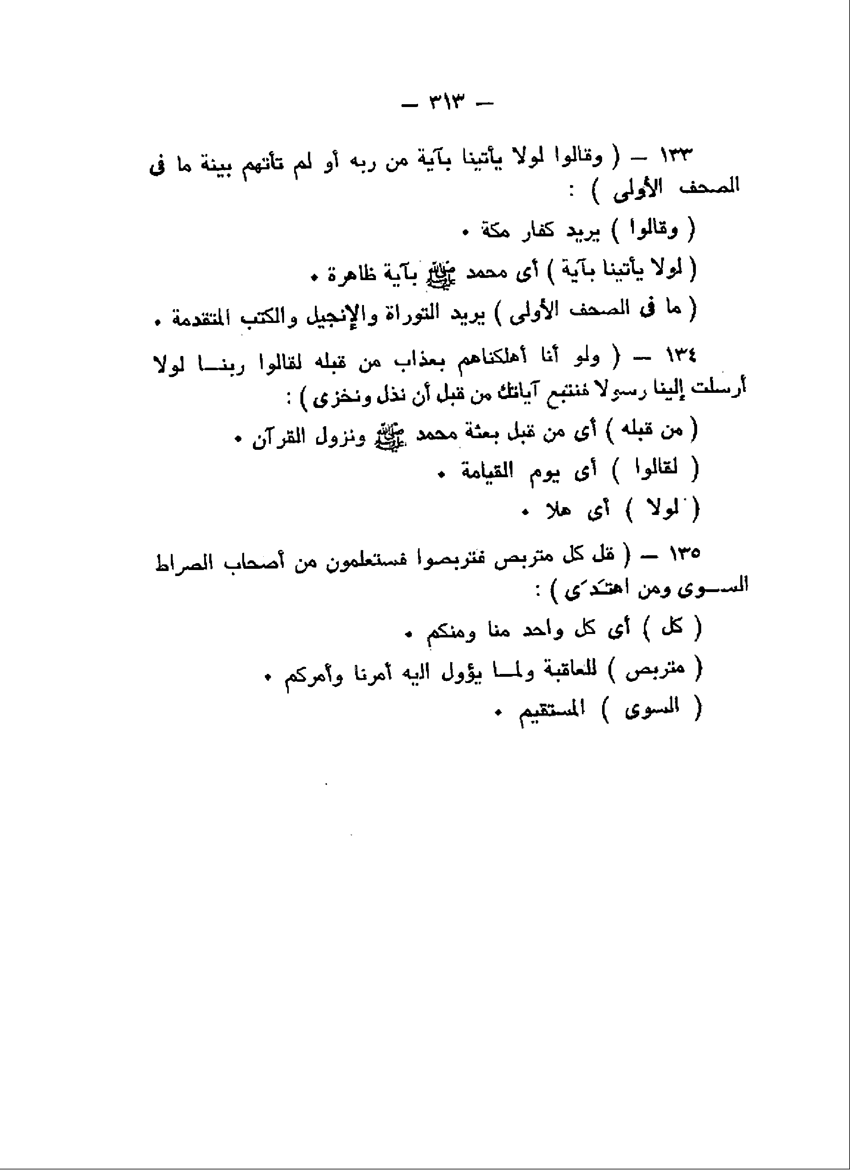 وَقالُوا لَوْلا يَأْتِينا بِآيَةٍ مِنْ رَبِّهِ أَوَلَمْ تَأْتِهِمْ بَيِّنَةُ ما فِي الصُّحُفِ الْأُولى (133) وَلَوْ أَنَّا أَهْلَكْناهُمْ بِعَذابٍ مِنْ قَبْلِهِ لَقالُوا رَبَّنا لَوْلا أَرْسَلْتَ إِلَيْنا رَسُولاً فَنَتَّبِعَ آياتِكَ مِنْ قَبْلِ أَنْ نَذِلَّ وَنَخْزى (134) قُلْ كُلٌّ مُتَرَبِّصٌ فَتَرَبَّصُوا فَسَتَعْلَمُونَ مَنْ أَصْحابُ الصِّراطِ السَّوِيِّ وَمَنِ اهْتَدى (135)