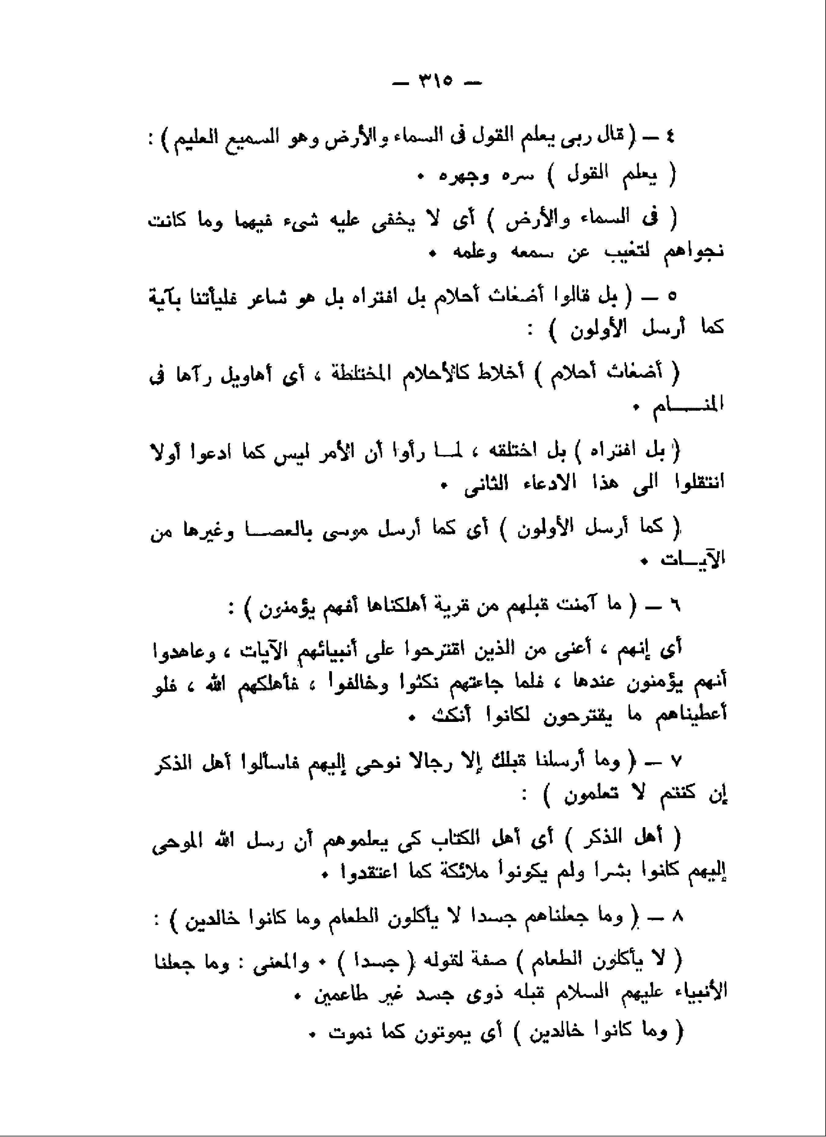 قالَ رَبِّي يَعْلَمُ الْقَوْلَ فِي السَّماءِ وَالْأَرْضِ وَهُوَ السَّمِيعُ الْعَلِيمُ (4) بَلْ قالُوا أَضْغاثُ أَحْلامٍ بَلِ افْتَراهُ بَلْ هُوَ شاعِرٌ فَلْيَأْتِنا بِآيَةٍ كَما أُرْسِلَ الْأَوَّلُونَ (5) ما آمَنَتْ قَبْلَهُمْ مِنْ قَرْيَةٍ أَهْلَكْناها أَفَهُمْ يُؤْمِنُونَ (6) وَما أَرْسَلْنا قَبْلَكَ إِلاَّ رِجالاً نُوحِي إِلَيْهِمْ فَسْئَلُوا أَهْلَ الذِّكْرِ إِنْ كُنْتُمْ لا تَعْلَمُونَ (7) وَما جَعَلْناهُمْ جَسَداً لا يَأْكُلُونَ الطَّعامَ وَما كانُوا خالِدِينَ (8)