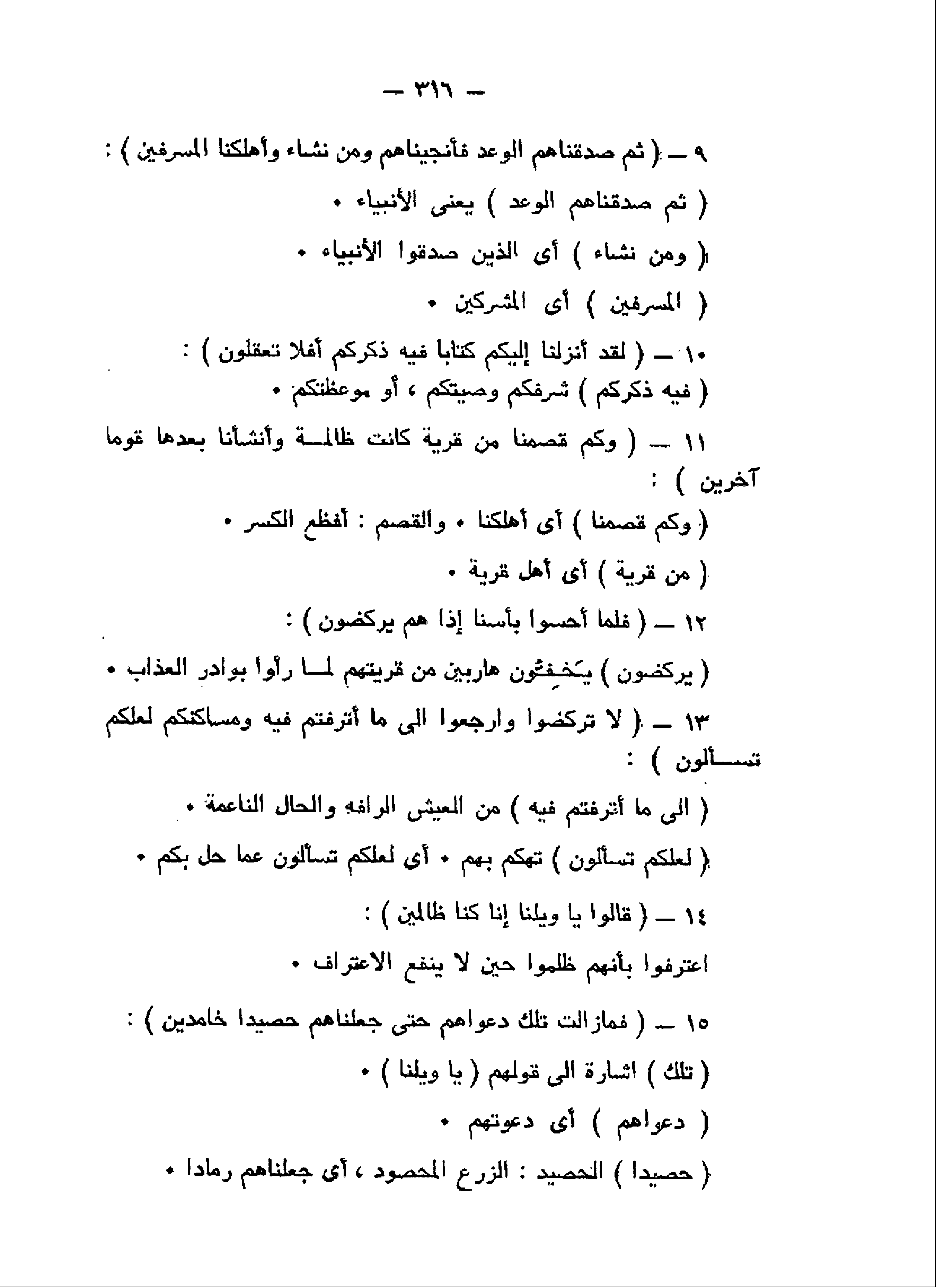 لَقَدْ أَنْزَلْنا إِلَيْكُمْ كِتاباً فِيهِ ذِكْرُكُمْ أَفَلا تَعْقِلُونَ (10) وَكَمْ قَصَمْنا مِنْ قَرْيَةٍ كانَتْ ظالِمَةً وَأَنْشَأْنا بَعْدَها قَوْماً آخَرِينَ (11) فَلَمَّا أَحَسُّوا بَأْسَنا إِذا هُمْ مِنْها يَرْكُضُونَ (12) لا تَرْكُضُوا وَارْجِعُوا إِلى ما أُتْرِفْتُمْ فِيهِ وَمَساكِنِكُمْ لَعَلَّكُمْ تُسْئَلُونَ (13) قالُوا يا وَيْلَنا إِنَّا كُنَّا ظالِمِينَ (14)