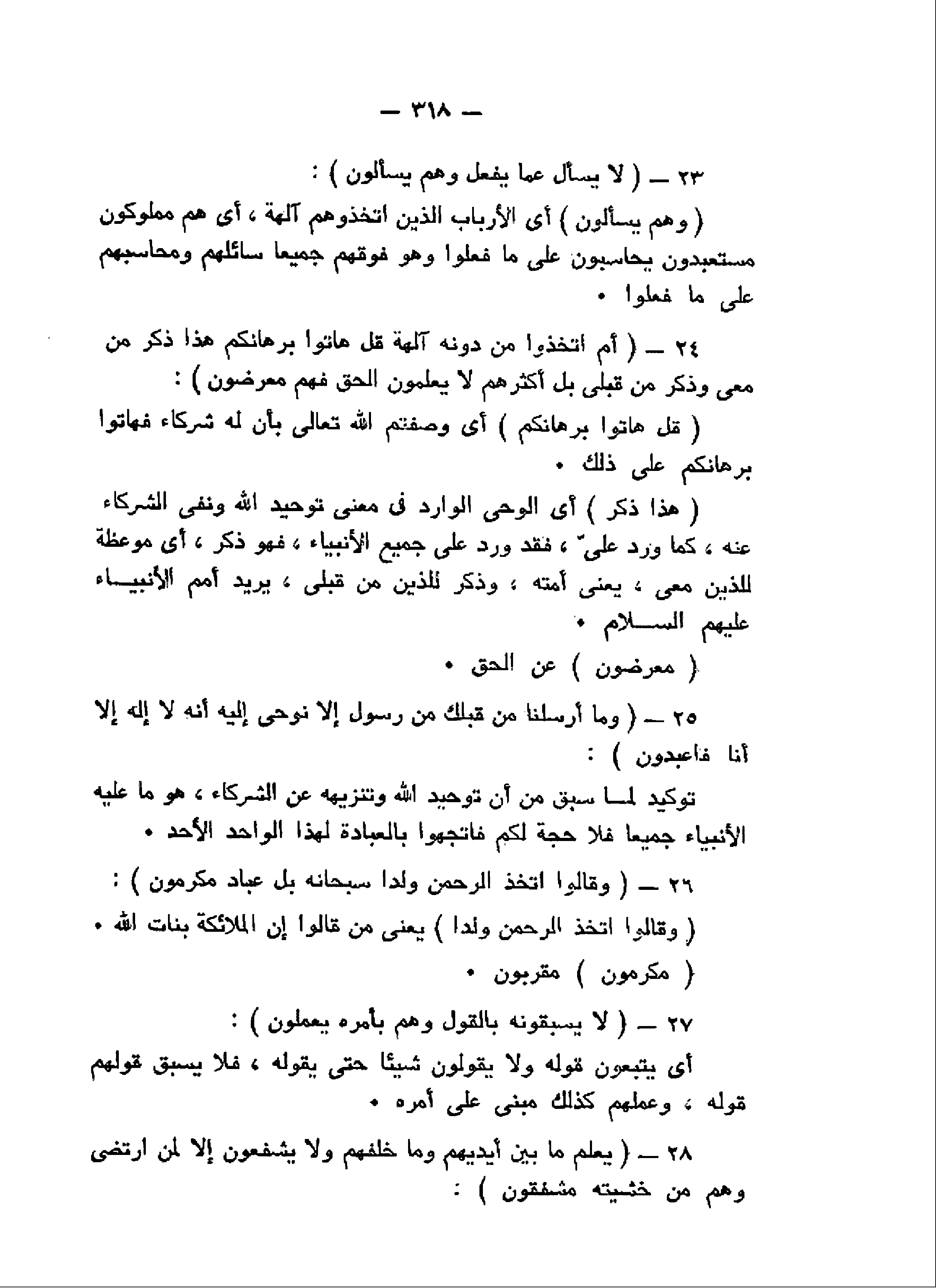 لا يُسْئَلُ عَمَّا يَفْعَلُ وَهُمْ يُسْئَلُونَ (23) أَمِ اتَّخَذُوا مِنْ دُونِهِ آلِهَةً قُلْ هاتُوا بُرْهانَكُمْ هذا ذِكْرُ مَنْ مَعِيَ وَذِكْرُ مَنْ قَبْلِي بَلْ أَكْثَرُهُمْ لا يَعْلَمُونَ الْحَقَّ فَهُمْ مُعْرِضُونَ (24) وَما أَرْسَلْنا مِنْ قَبْلِكَ مِنْ رَسُولٍ إِلاَّ نُوحِي إِلَيْهِ أَنَّهُ لا إِلهَ إِلاَّ أَنَا فَاعْبُدُونِ (25) وَقالُوا اتَّخَذَ الرَّحْمنُ وَلَداً سُبْحانَهُ بَلْ عِبادٌ مُكْرَمُونَ (26) لا يَسْبِقُونَهُ بِالْقَوْلِ وَهُمْ بِأَمْرِهِ يَعْمَلُونَ (27)