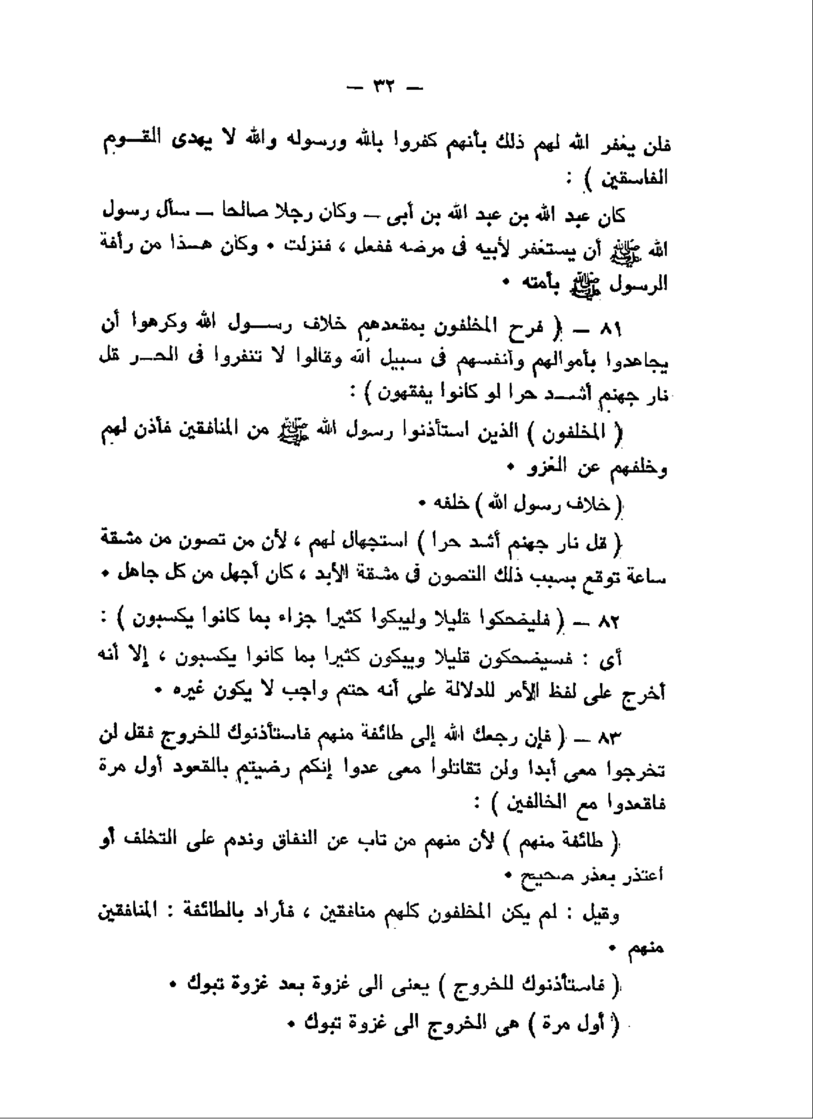 فَرِحَ الْمُخَلَّفُونَ بِمَقْعَدِهِمْ خِلافَ رَسُولِ اللَّهِ وَكَرِهُوا أَنْ يُجاهِدُوا بِأَمْوالِهِمْ وَأَنْفُسِهِمْ فِي سَبِيلِ اللَّهِ وَقالُوا لا تَنْفِرُوا فِي الْحَرِّ قُلْ نارُ جَهَنَّمَ أَشَدُّ حَرًّا لَوْ كانُوا يَفْقَهُونَ (81) فَلْيَضْحَكُوا قَلِيلاً وَلْيَبْكُوا كَثِيراً جَزاءً بِما كانُوا يَكْسِبُونَ (82) فَإِنْ رَجَعَكَ اللَّهُ إِلى طائِفَةٍ مِنْهُمْ فَاسْتَأْذَنُوكَ لِلْخُرُوجِ فَقُلْ لَنْ تَخْرُجُوا مَعِيَ أَبَداً وَلَنْ تُقاتِلُوا مَعِيَ عَدُوًّا إِنَّكُمْ رَضِيتُمْ بِالْقُعُودِ أَوَّلَ مَرَّةٍ فَاقْعُدُوا مَعَ الْخالِفِينَ (83)