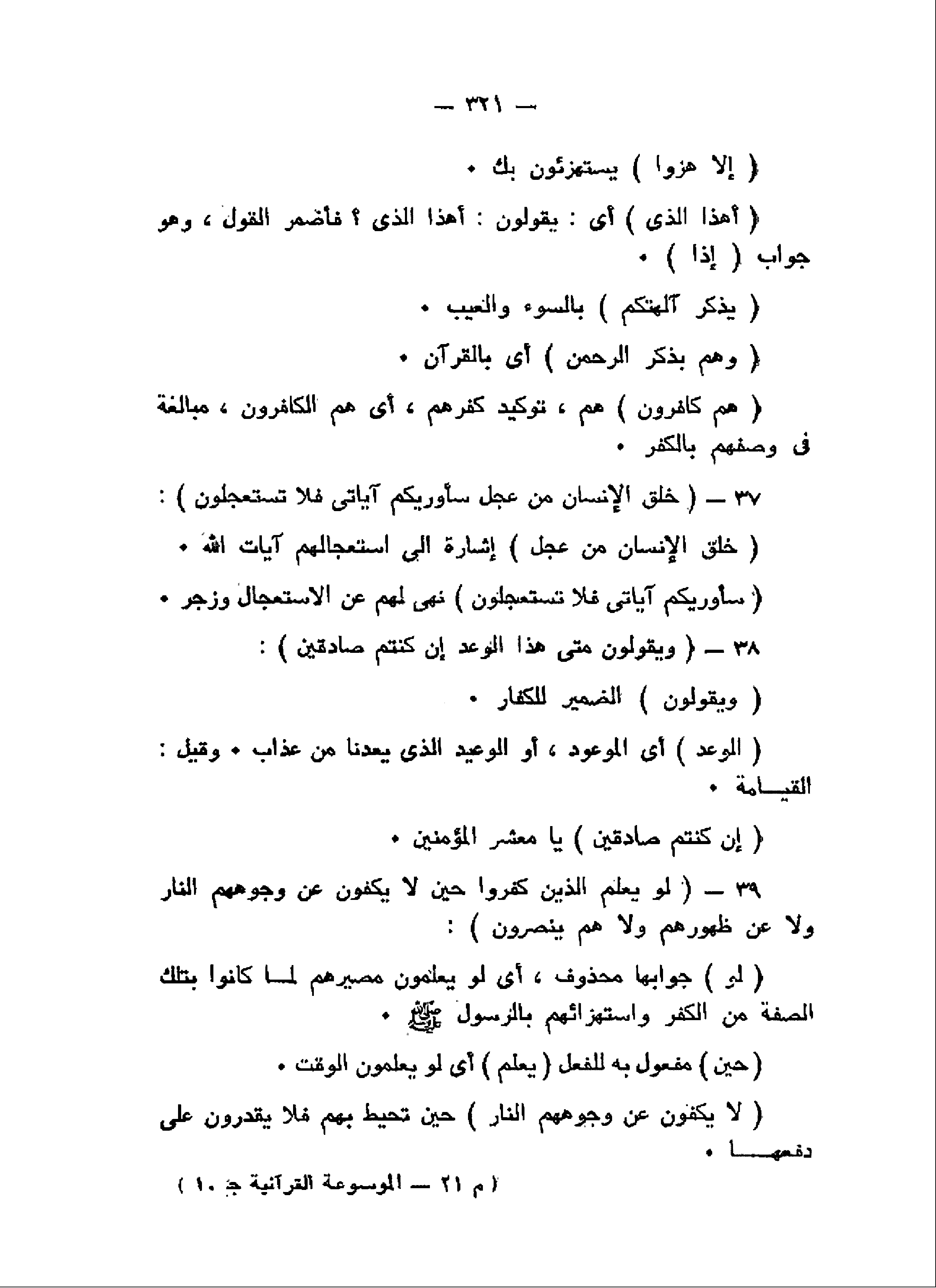 خُلِقَ الْإِنْسانُ مِنْ عَجَلٍ سَأُرِيكُمْ آياتِي فَلا تَسْتَعْجِلُونِ (37) وَيَقُولُونَ مَتى هذَا الْوَعْدُ إِنْ كُنْتُمْ صادِقِينَ (38) لَوْ يَعْلَمُ الَّذِينَ كَفَرُوا حِينَ لا يَكُفُّونَ عَنْ وُجُوهِهِمُ النَّارَ وَلا عَنْ ظُهُورِهِمْ وَلا هُمْ يُنْصَرُونَ (39)