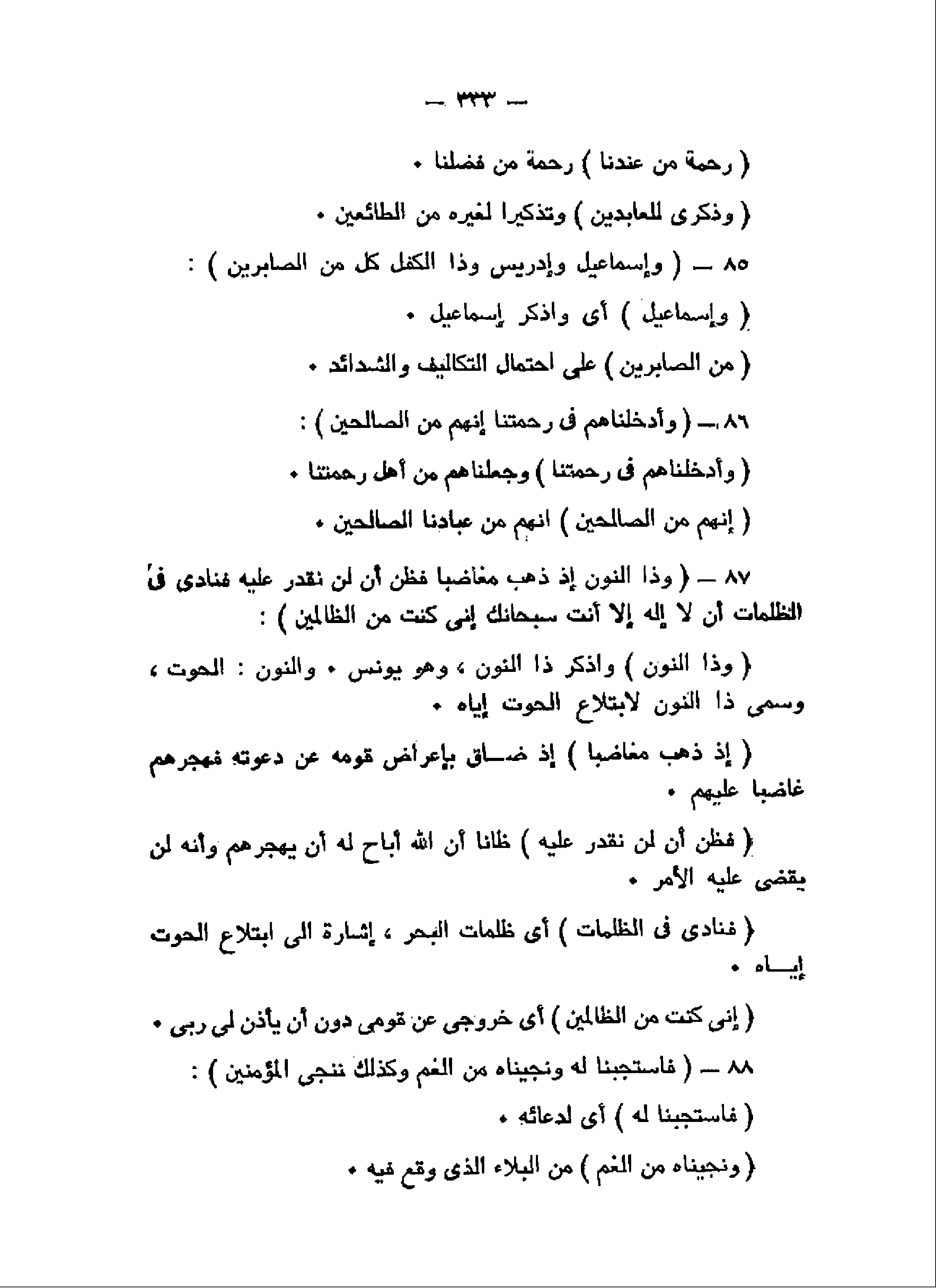 وَإِسْماعِيلَ وَإِدْرِيسَ وَذَا الْكِفْلِ كُلٌّ مِنَ الصَّابِرِينَ (85) وَأَدْخَلْناهُمْ فِي رَحْمَتِنا إِنَّهُمْ مِنَ الصَّالِحِينَ (86) وَذَا النُّونِ إِذْ ذَهَبَ مُغاضِباً فَظَنَّ أَنْ لَنْ نَقْدِرَ عَلَيْهِ فَنادى فِي الظُّلُماتِ أَنْ لا إِلهَ إِلاَّ أَنْتَ سُبْحانَكَ إِنِّي كُنْتُ مِنَ الظَّالِمِينَ (87) فَاسْتَجَبْنا لَهُ وَنَجَّيْناهُ مِنَ الْغَمِّ وَكَذلِكَ نُنْجِي الْمُؤْمِنِينَ (88)