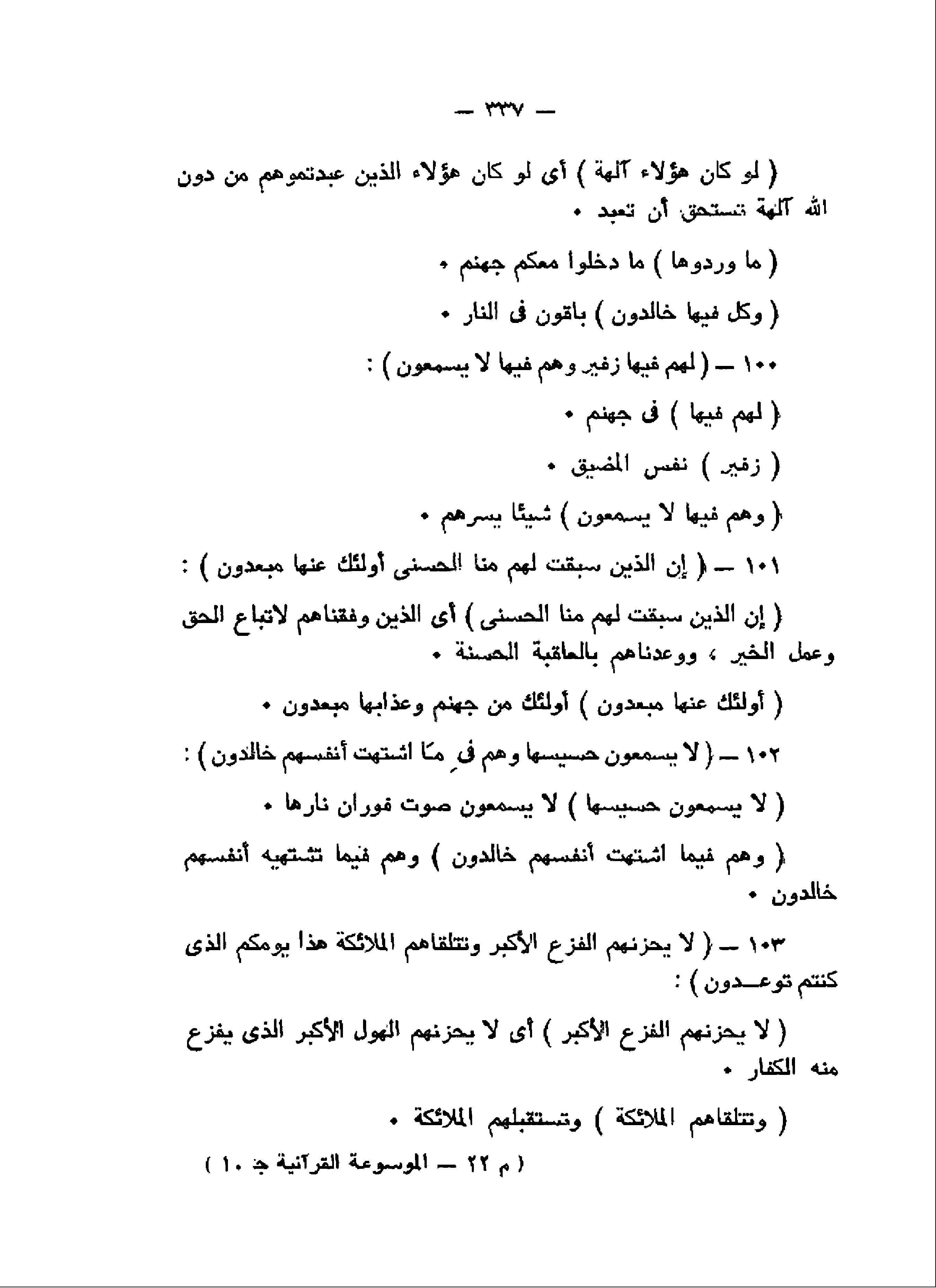 لَهُمْ فِيها زَفِيرٌ وَهُمْ فِيها لا يَسْمَعُونَ (100) إِنَّ الَّذِينَ سَبَقَتْ لَهُمْ مِنَّا الْحُسْنى أُولئِكَ عَنْها مُبْعَدُونَ (101) لا يَسْمَعُونَ حَسِيسَها وَهُمْ فِي مَا اشْتَهَتْ أَنْفُسُهُمْ خالِدُونَ (102) لا يَحْزُنُهُمُ الْفَزَعُ الْأَكْبَرُ وَتَتَلَقَّاهُمُ الْمَلائِكَةُ هذا يَوْمُكُمُ الَّذِي كُنْتُمْ تُوعَدُونَ (103)