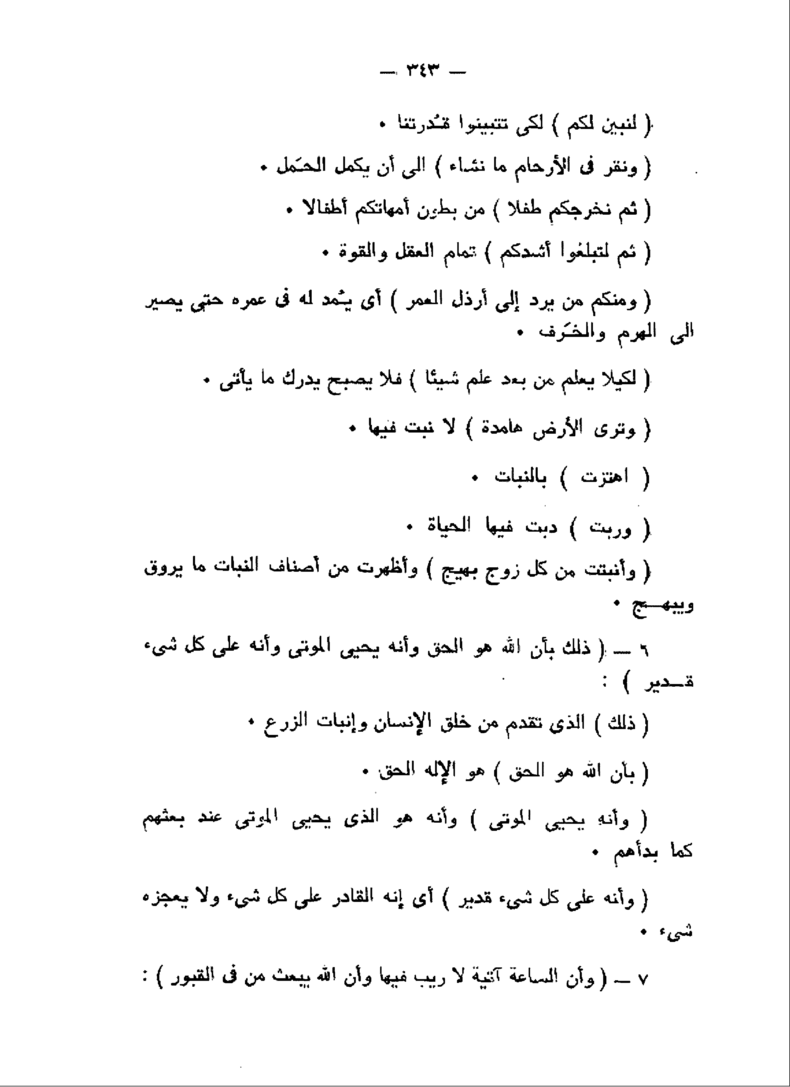 ذلِكَ بِأَنَّ اللَّهَ هُوَ الْحَقُّ وَأَنَّهُ يُحْيِ الْمَوْتى وَأَنَّهُ عَلى كُلِّ شَيْءٍ قَدِيرٌ (6) وَأَنَّ السَّاعَةَ آتِيَةٌ لا رَيْبَ فِيها وَأَنَّ اللَّهَ يَبْعَثُ مَنْ فِي الْقُبُورِ (7)
