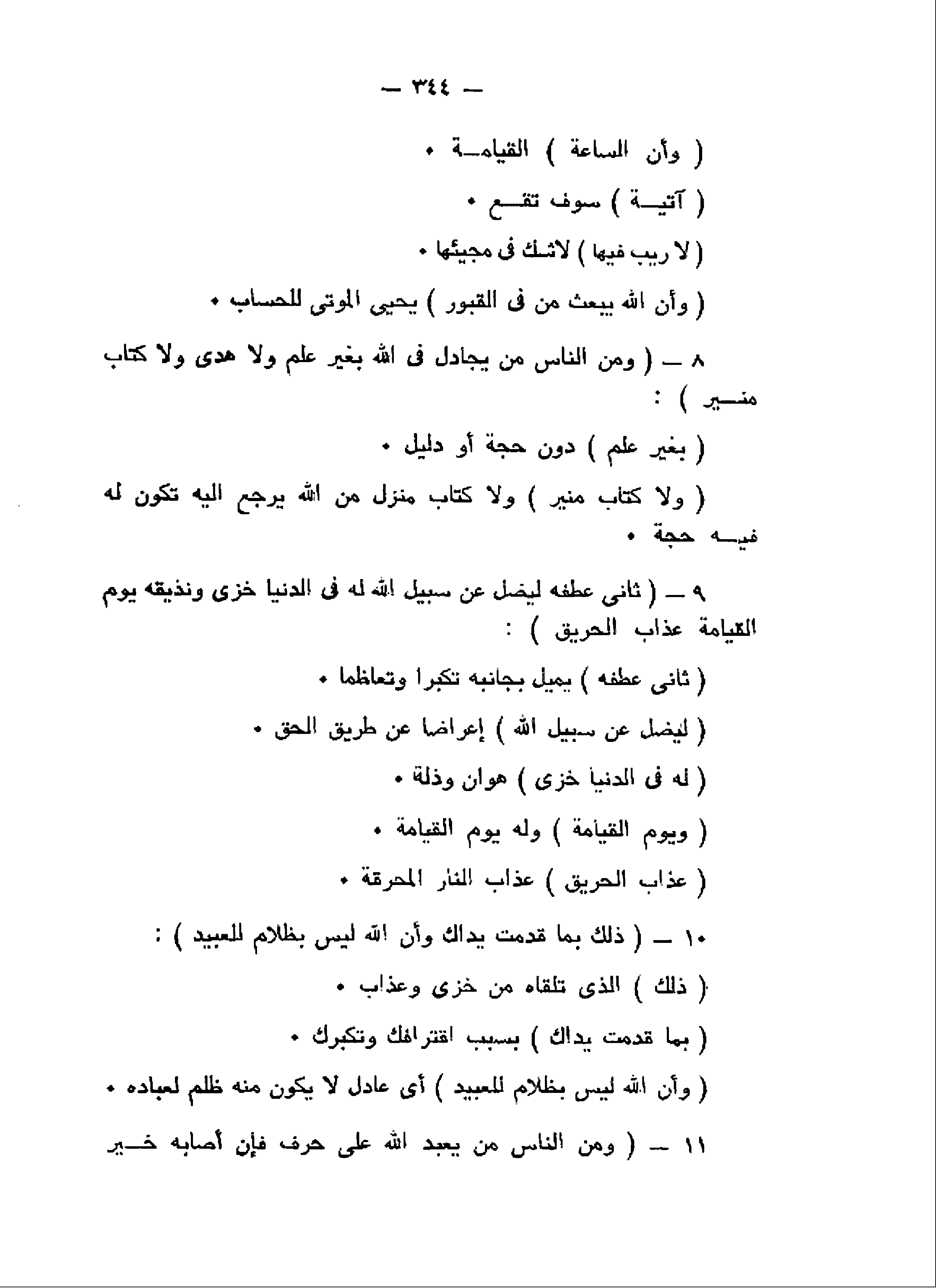 وَمِنَ النَّاسِ مَنْ يُجادِلُ فِي اللَّهِ بِغَيْرِ عِلْمٍ وَلا هُدىً وَلا كِتابٍ مُنِيرٍ (8) ثانِيَ عِطْفِهِ لِيُضِلَّ عَنْ سَبِيلِ اللَّهِ لَهُ فِي الدُّنْيا خِزْيٌ وَنُذِيقُهُ يَوْمَ الْقِيامَةِ عَذابَ الْحَرِيقِ (9)