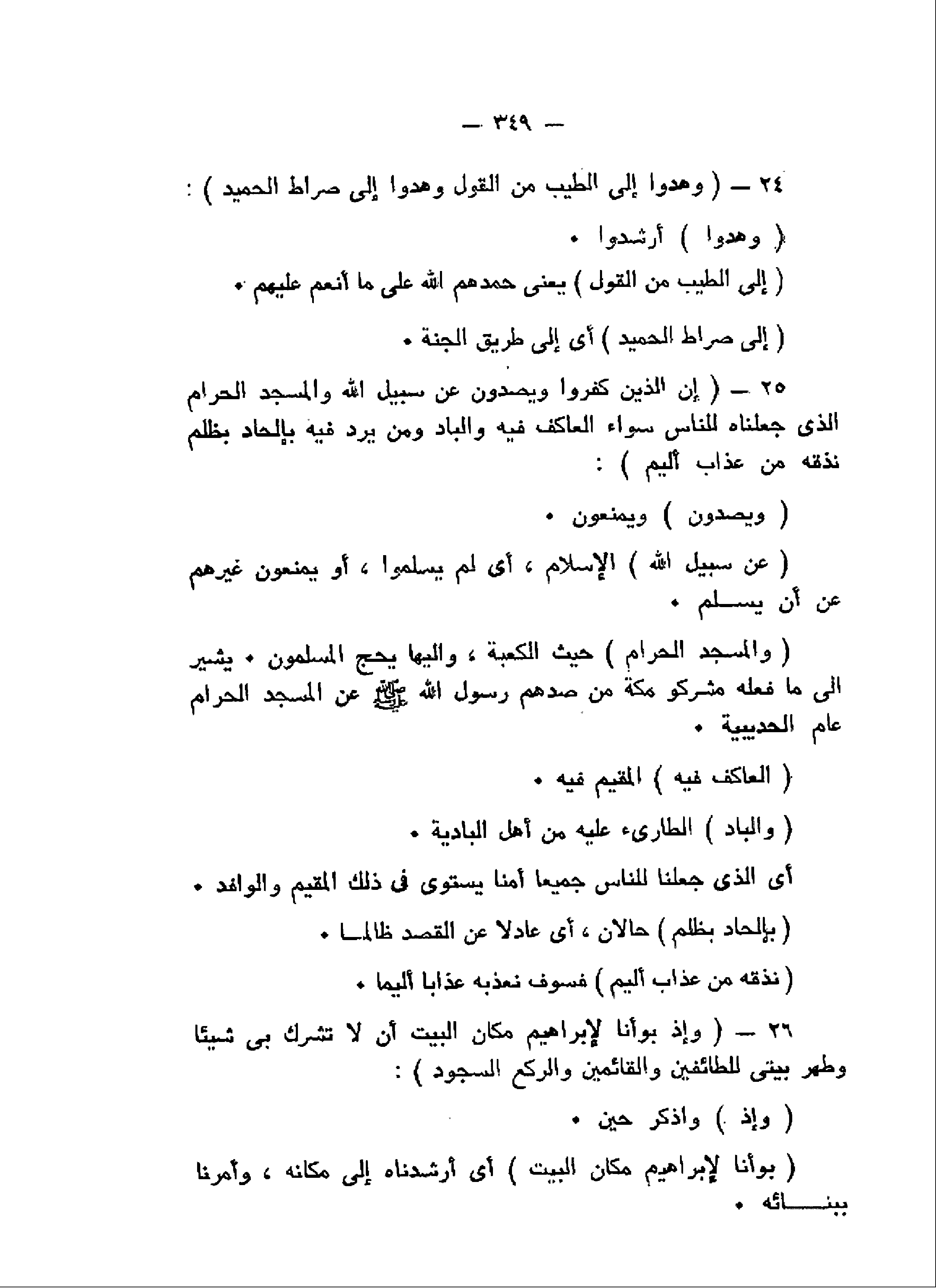 وَهُدُوا إِلَى الطَّيِّبِ مِنَ الْقَوْلِ وَهُدُوا إِلى صِراطِ الْحَمِيدِ (24) إِنَّ الَّذِينَ كَفَرُوا وَيَصُدُّونَ عَنْ سَبِيلِ اللَّهِ وَالْمَسْجِدِ الْحَرامِ الَّذِي جَعَلْناهُ لِلنَّاسِ سَواءً الْعاكِفُ فِيهِ وَالْبادِ وَمَنْ يُرِدْ فِيهِ بِإِلْحادٍ بِظُلْمٍ نُذِقْهُ مِنْ عَذابٍ أَلِيمٍ (25) وَإِذْ بَوَّأْنا لِإِبْراهِيمَ مَكانَ الْبَيْتِ أَنْ لا تُشْرِكْ بِي شَيْئاً وَطَهِّرْ بَيْتِيَ لِلطَّائِفِينَ وَالْقائِمِينَ وَالرُّكَّعِ السُّجُودِ (26)