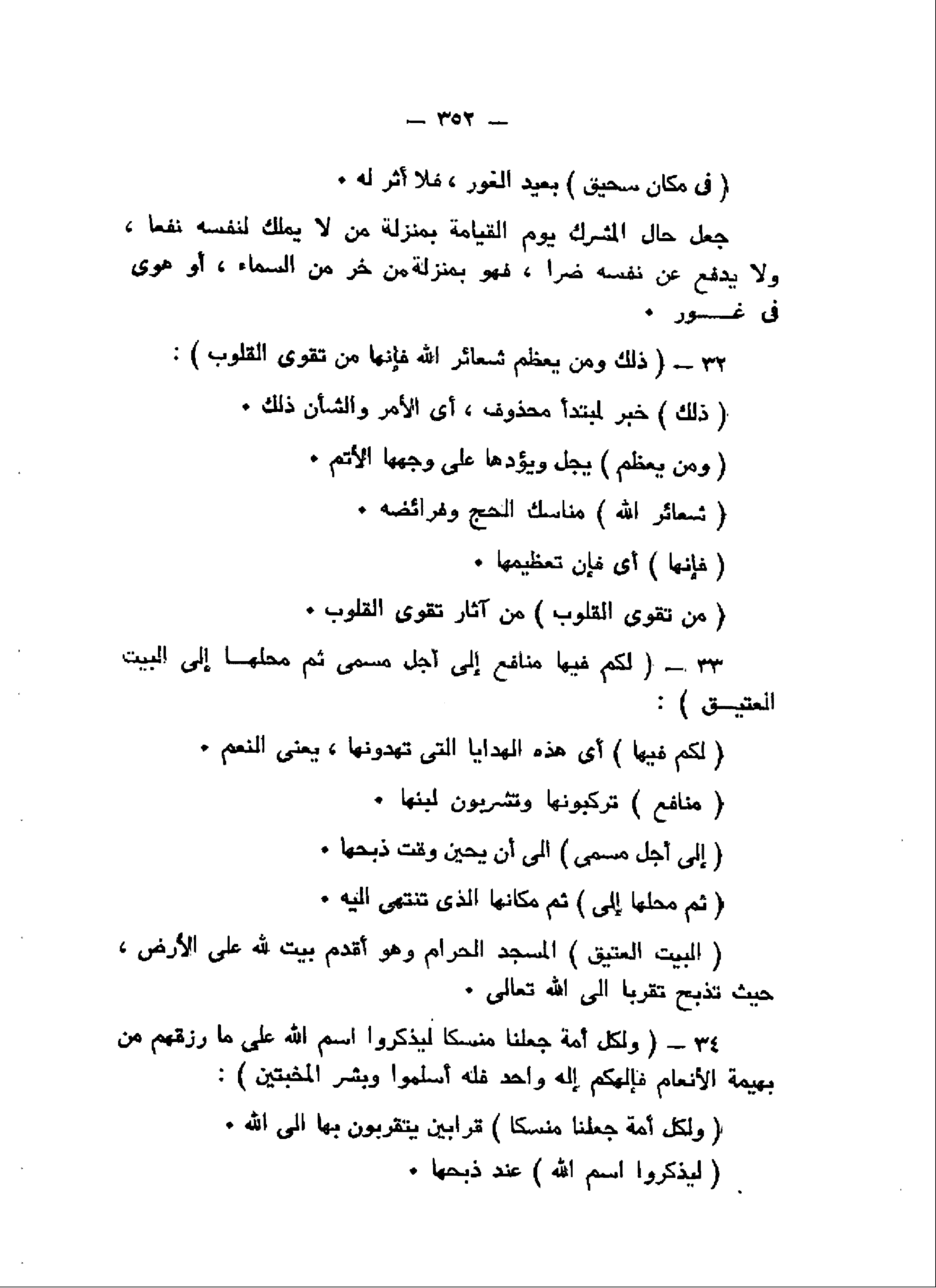 ذلِكَ وَمَنْ يُعَظِّمْ شَعائِرَ اللَّهِ فَإِنَّها مِنْ تَقْوَى الْقُلُوبِ (32) لَكُمْ فِيها مَنافِعُ إِلى أَجَلٍ مُسَمًّى ثُمَّ مَحِلُّها إِلَى الْبَيْتِ الْعَتِيقِ (33) وَلِكُلِّ أُمَّةٍ جَعَلْنا مَنْسَكاً لِيَذْكُرُوا اسْمَ اللَّهِ عَلى ما رَزَقَهُمْ مِنْ بَهِيمَةِ الْأَنْعامِ فَإِلهُكُمْ إِلهٌ واحِدٌ فَلَهُ أَسْلِمُوا وَبَشِّرِ الْمُخْبِتِينَ (34)