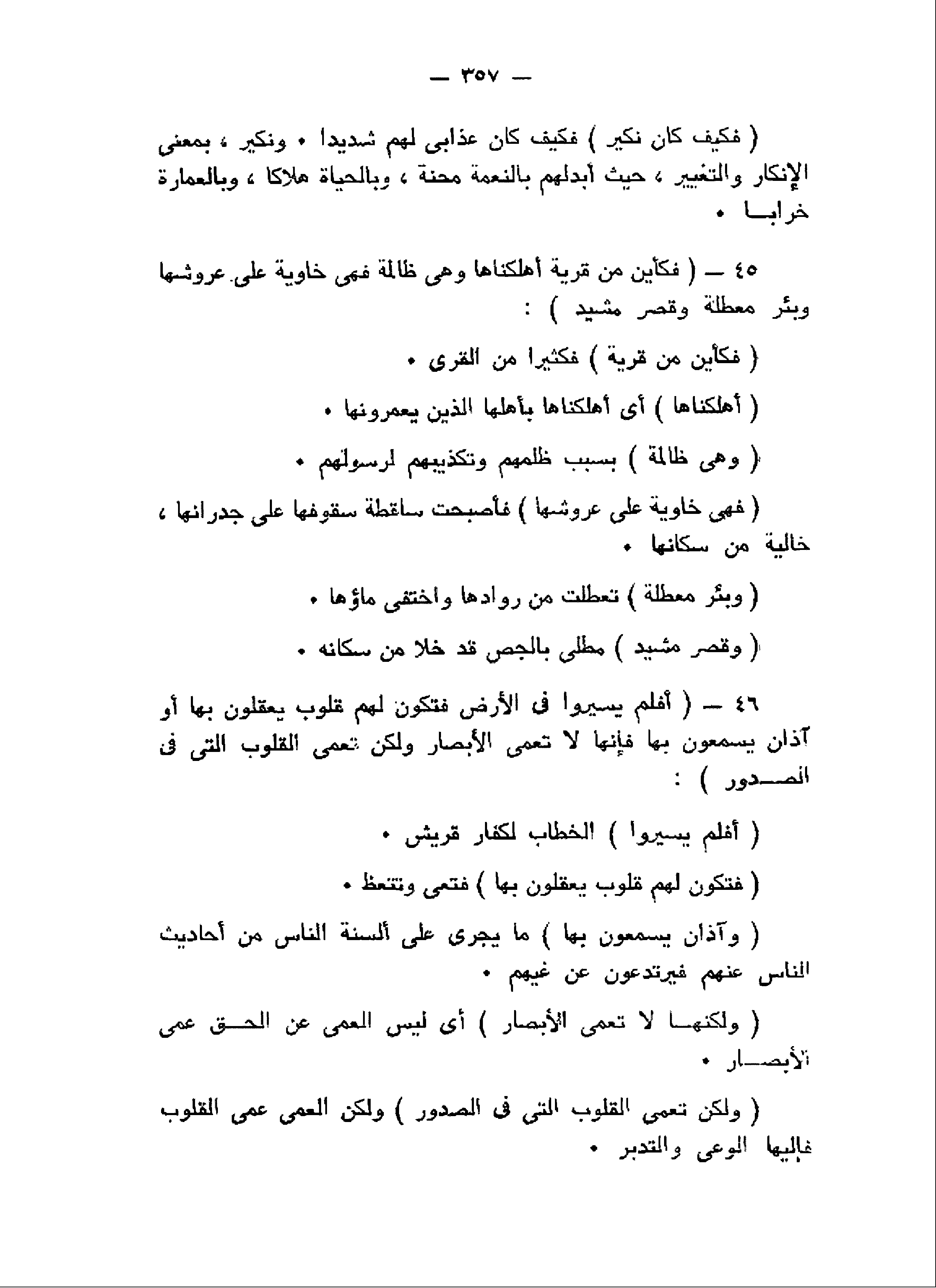 فَكَأَيِّنْ مِنْ قَرْيَةٍ أَهْلَكْناها وَهِيَ ظالِمَةٌ فَهِيَ خاوِيَةٌ عَلى عُرُوشِها وَبِئْرٍ مُعَطَّلَةٍ وَقَصْرٍ مَشِيدٍ (45) أَفَلَمْ يَسِيرُوا فِي الْأَرْضِ فَتَكُونَ لَهُمْ قُلُوبٌ يَعْقِلُونَ بِها أَوْ آذانٌ يَسْمَعُونَ بِها فَإِنَّها لا تَعْمَى الْأَبْصارُ وَلكِنْ تَعْمَى الْقُلُوبُ الَّتِي فِي الصُّدُورِ (46)