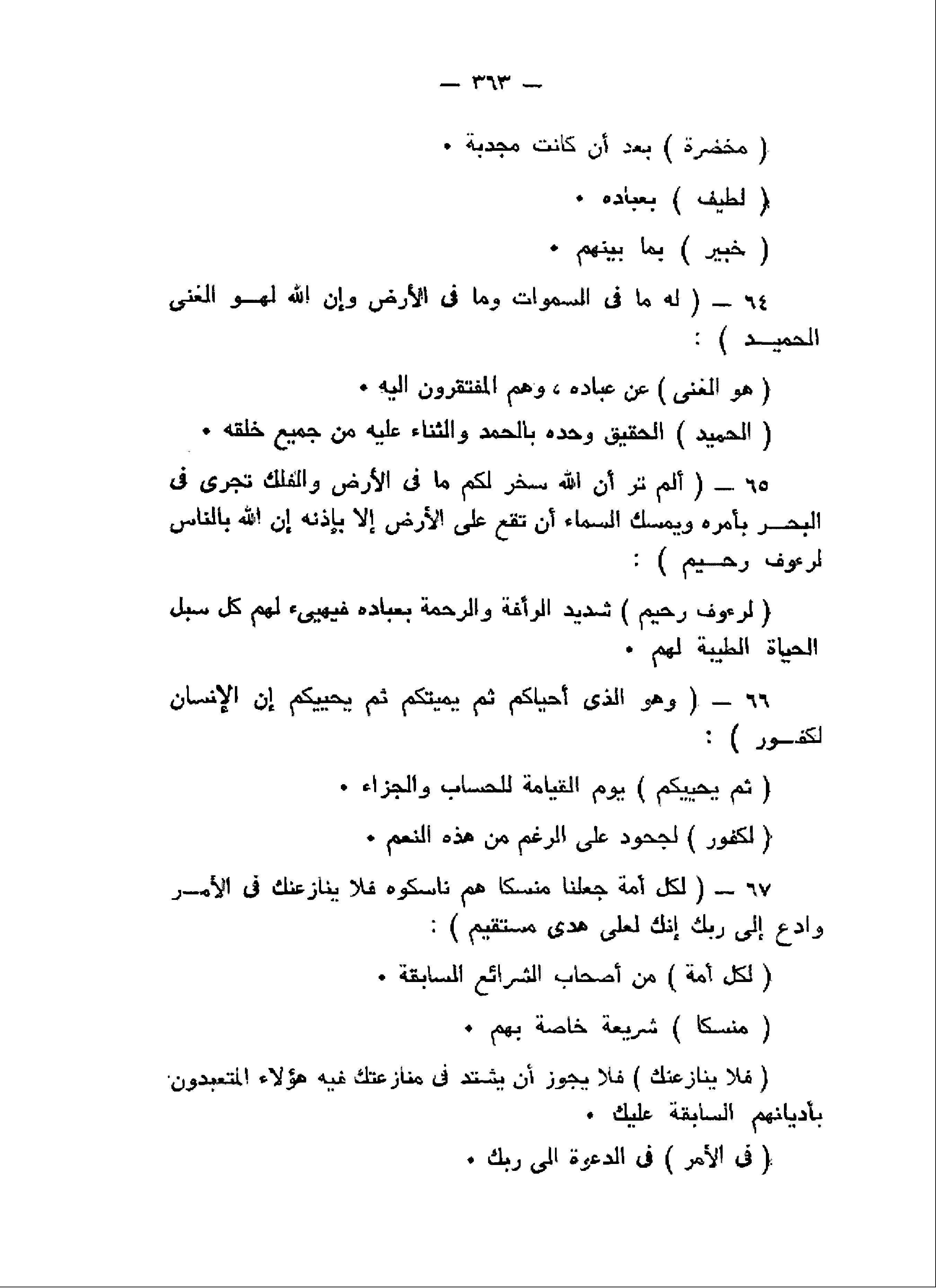 لَهُ ما فِي السَّماواتِ وَما فِي الْأَرْضِ وَإِنَّ اللَّهَ لَهُوَ الْغَنِيُّ الْحَمِيدُ (64) أَلَمْ تَرَ أَنَّ اللَّهَ سَخَّرَ لَكُمْ ما فِي الْأَرْضِ وَالْفُلْكَ تَجْرِي فِي الْبَحْرِ بِأَمْرِهِ وَيُمْسِكُ السَّماءَ أَنْ تَقَعَ عَلَى الْأَرْضِ إِلاَّ بِإِذْنِهِ إِنَّ اللَّهَ بِالنَّاسِ لَرَؤُفٌ رَحِيمٌ (65) وَهُوَ الَّذِي أَحْياكُمْ ثُمَّ يُمِيتُكُمْ ثُمَّ يُحْيِيكُمْ إِنَّ الْإِنْسانَ لَكَفُورٌ (66) لِكُلِّ أُمَّةٍ جَعَلْنا مَنْسَكاً هُمْ ناسِكُوهُ فَلا يُنازِعُنَّكَ فِي الْأَمْرِ وَادْعُ إِلى رَبِّكَ إِنَّكَ لَعَلى هُدىً مُسْتَقِيمٍ (67)