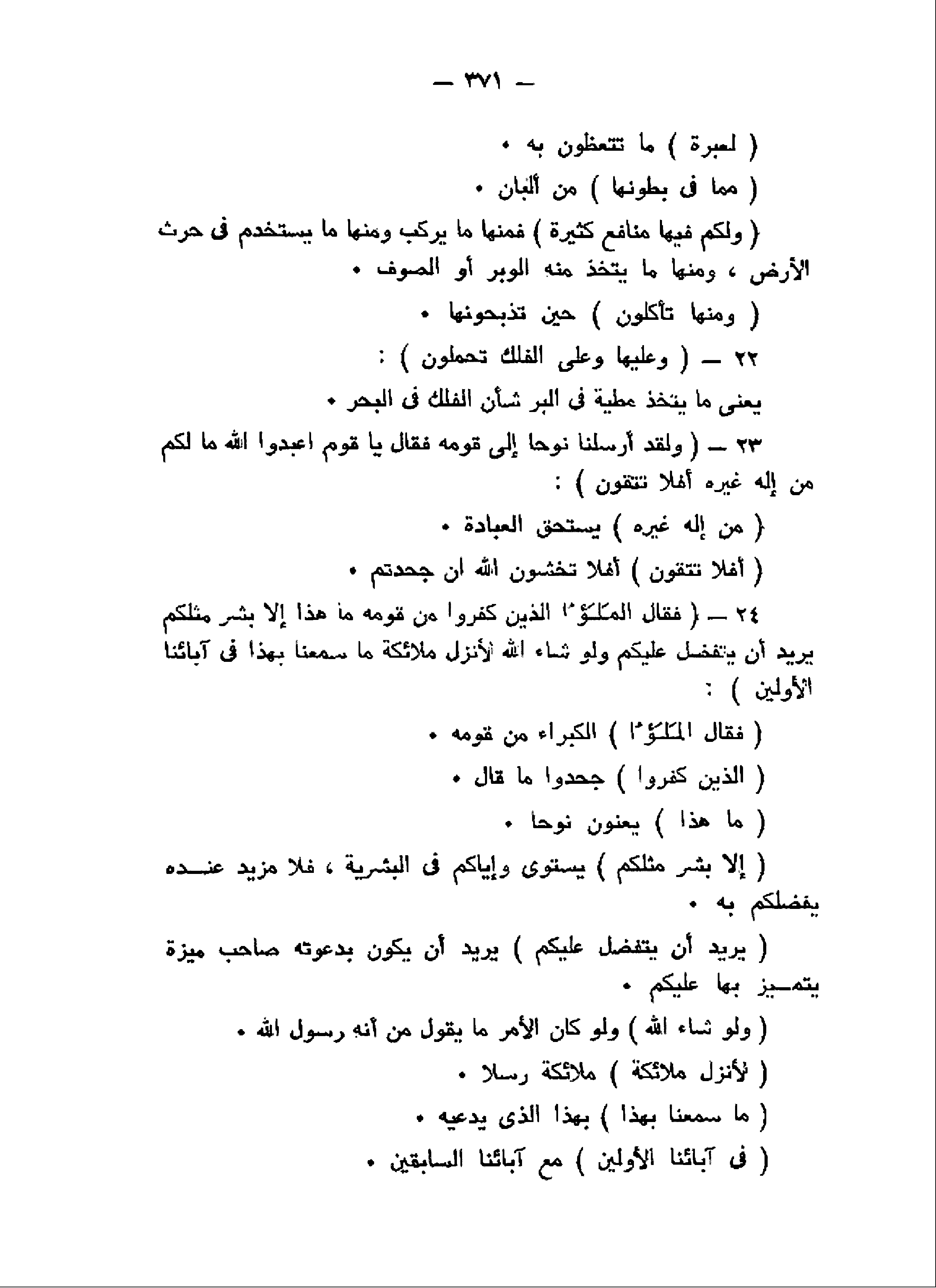 وَعَلَيْها وَعَلَى الْفُلْكِ تُحْمَلُونَ (22) وَلَقَدْ أَرْسَلْنا نُوحاً إِلى قَوْمِهِ فَقالَ يا قَوْمِ اعْبُدُوا اللَّهَ ما لَكُمْ مِنْ إِلهٍ غَيْرُهُ أَفَلا تَتَّقُونَ (23) فَقالَ الْمَلَأُ الَّذِينَ كَفَرُوا مِنْ قَوْمِهِ ما هذا إِلاَّ بَشَرٌ مِثْلُكُمْ يُرِيدُ أَنْ يَتَفَضَّلَ عَلَيْكُمْ وَلَوْ شاءَ اللَّهُ لَأَنْزَلَ مَلائِكَةً ما سَمِعْنا بِهذا فِي آبائِنَا الْأَوَّلِينَ (24)