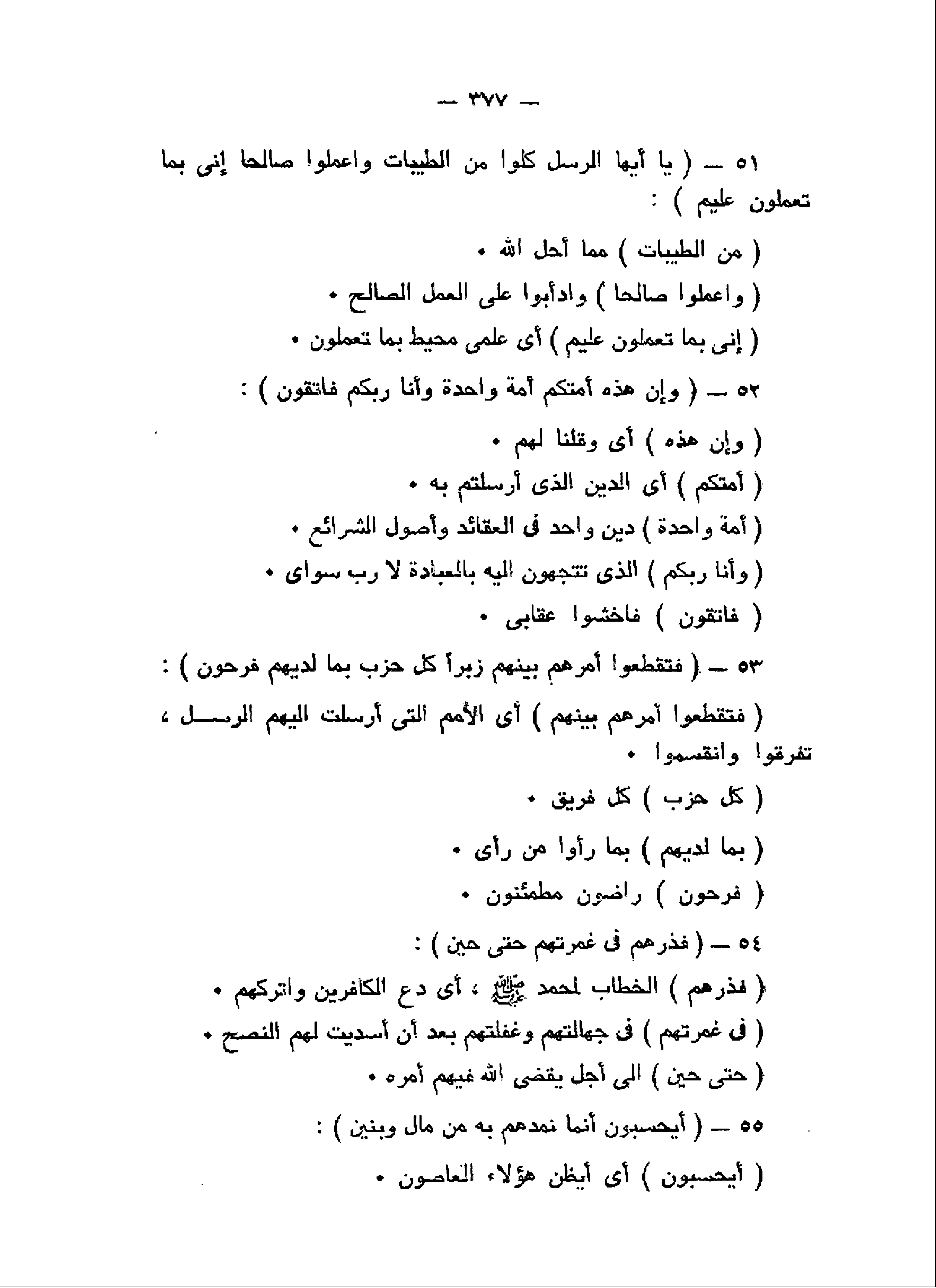 يا أَيُّهَا الرُّسُلُ كُلُوا مِنَ الطَّيِّباتِ وَاعْمَلُوا صالِحاً إِنِّي بِما تَعْمَلُونَ عَلِيمٌ (51) وَإِنَّ هذِهِ أُمَّتُكُمْ أُمَّةً واحِدَةً وَأَنَا رَبُّكُمْ فَاتَّقُونِ (52) فَتَقَطَّعُوا أَمْرَهُمْ بَيْنَهُمْ زُبُراً كُلُّ حِزْبٍ بِما لَدَيْهِمْ فَرِحُونَ (53) فَذَرْهُمْ فِي غَمْرَتِهِمْ حَتَّى حِينٍ (54) أَيَحْسَبُونَ أَنَّما نُمِدُّهُمْ بِهِ مِنْ مالٍ وَبَنِينَ (55)