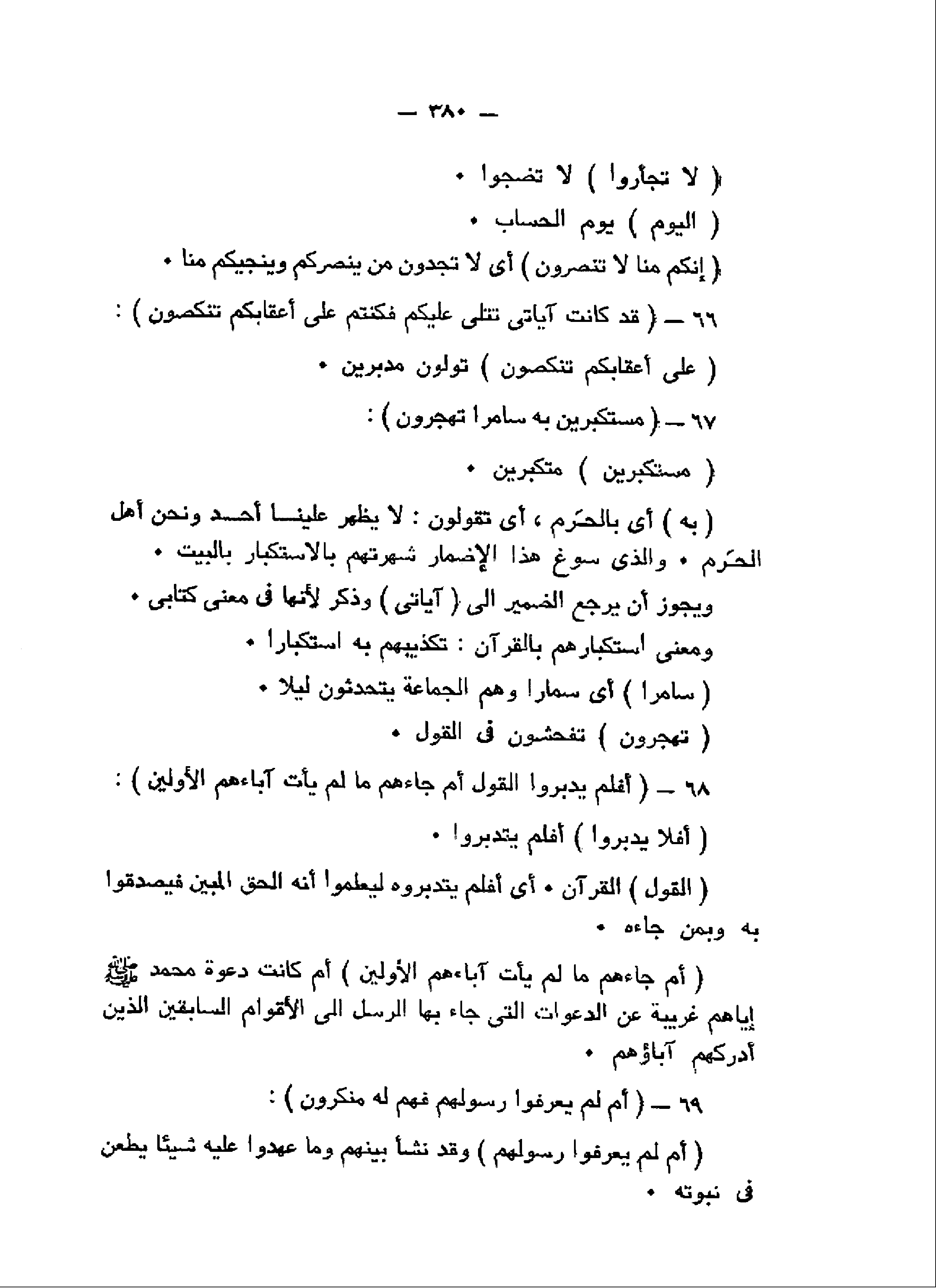 قَدْ كانَتْ آياتِي تُتْلى عَلَيْكُمْ فَكُنْتُمْ عَلى أَعْقابِكُمْ تَنْكِصُونَ (66) مُسْتَكْبِرِينَ بِهِ سامِراً تَهْجُرُونَ (67) أَفَلَمْ يَدَّبَّرُوا الْقَوْلَ أَمْ جاءَهُمْ ما لَمْ يَأْتِ آباءَهُمُ الْأَوَّلِينَ (68) أَمْ لَمْ يَعْرِفُوا رَسُولَهُمْ فَهُمْ لَهُ مُنْكِرُونَ (69)
