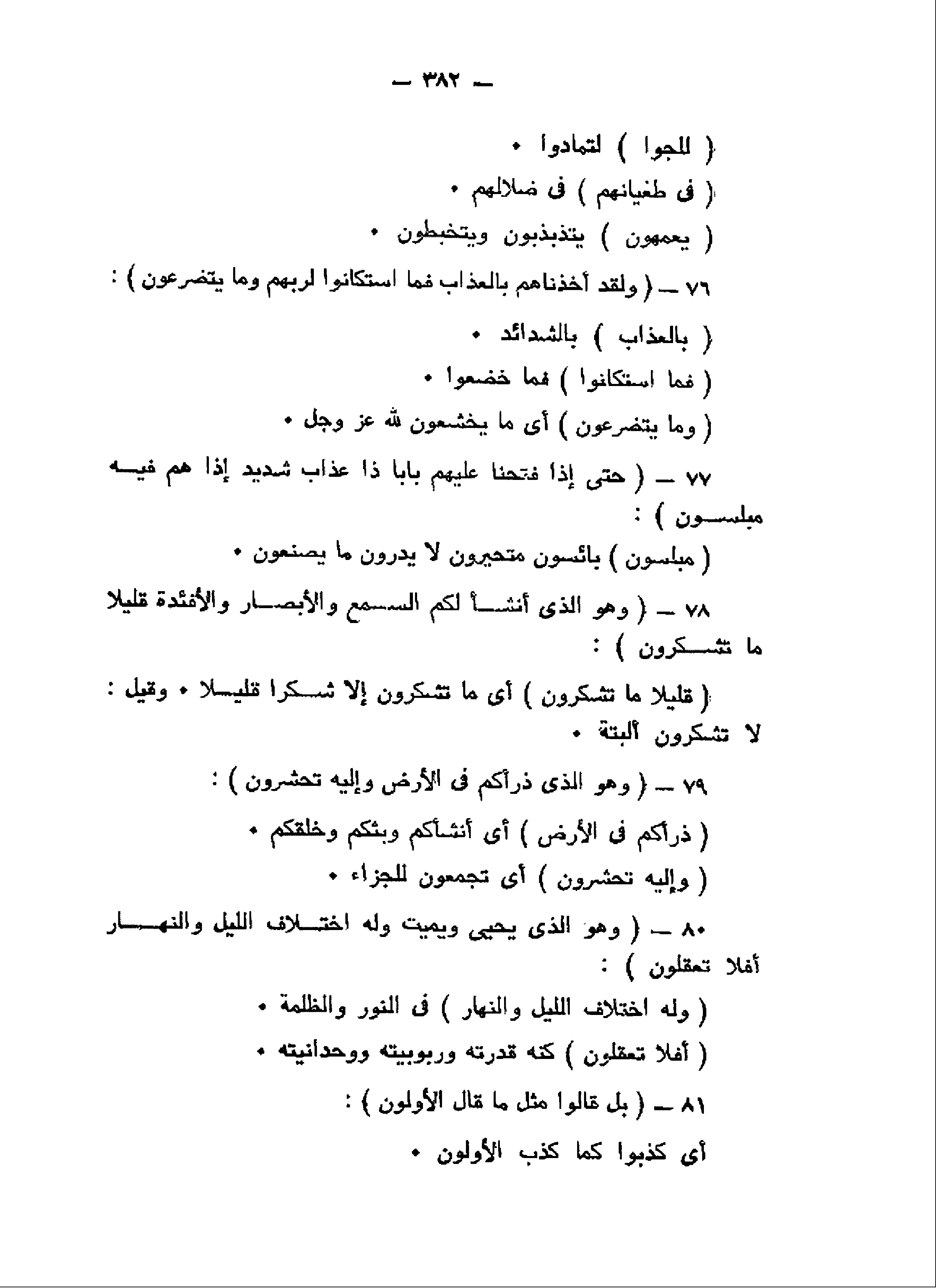 وَلَقَدْ أَخَذْناهُمْ بِالْعَذابِ فَمَا اسْتَكانُوا لِرَبِّهِمْ وَما يَتَضَرَّعُونَ (76) حَتَّى إِذا فَتَحْنا عَلَيْهِمْ باباً ذا عَذابٍ شَدِيدٍ إِذا هُمْ فِيهِ مُبْلِسُونَ (77) وَهُوَ الَّذِي أَنْشَأَ لَكُمُ السَّمْعَ وَالْأَبْصارَ وَالْأَفْئِدَةَ قَلِيلاً ما تَشْكُرُونَ (78) وَهُوَ الَّذِي ذَرَأَكُمْ فِي الْأَرْضِ وَإِلَيْهِ تُحْشَرُونَ (79) وَهُوَ الَّذِي يُحْيِي وَيُمِيتُ وَلَهُ اخْتِلافُ اللَّيْلِ وَالنَّهارِ أَفَلا تَعْقِلُونَ (80)
