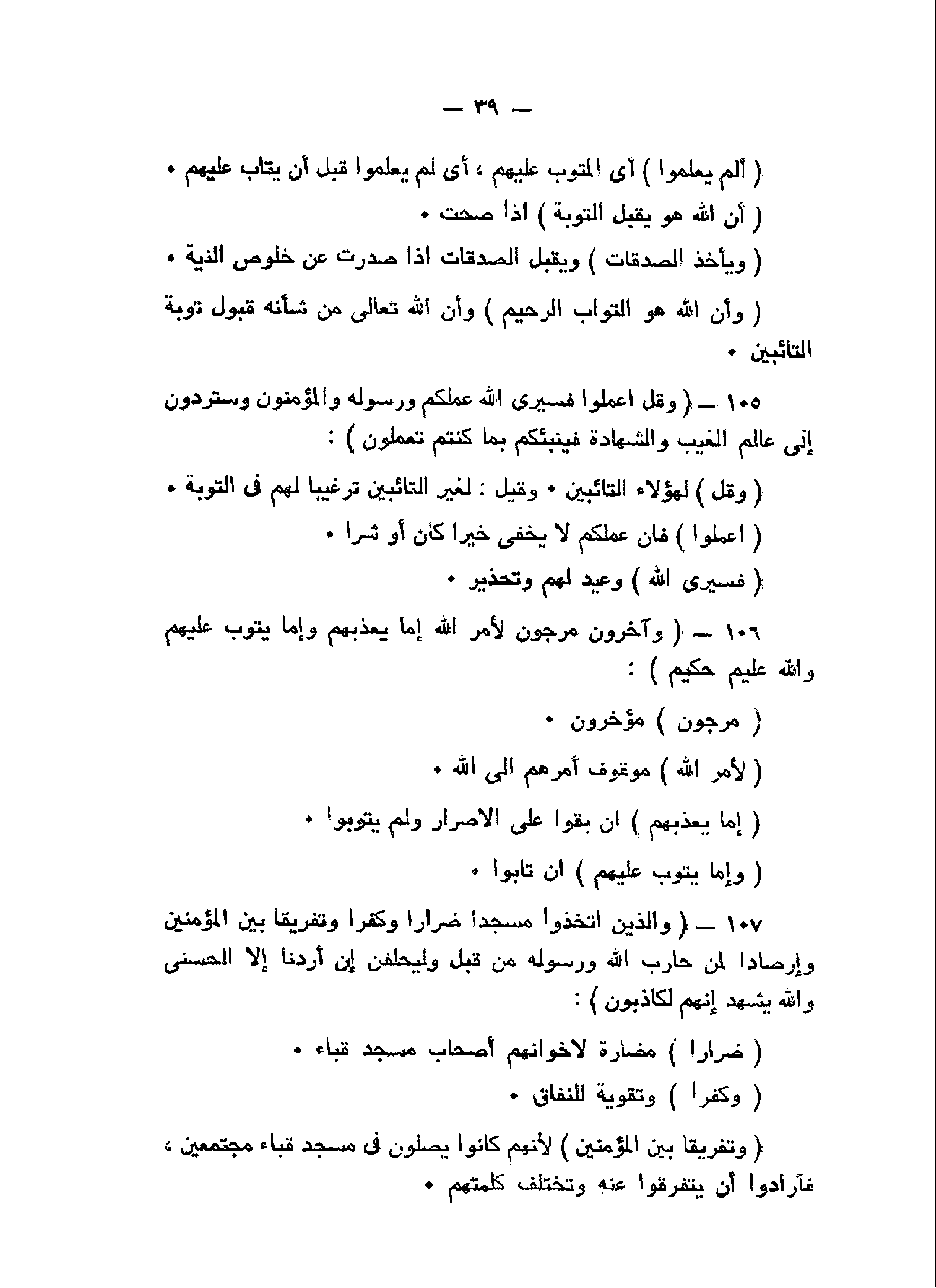 وَقُلِ اعْمَلُوا فَسَيَرَى اللَّهُ عَمَلَكُمْ وَرَسُولُهُ وَالْمُؤْمِنُونَ وَسَتُرَدُّونَ إِلى عالِمِ الْغَيْبِ وَالشَّهادَةِ فَيُنَبِّئُكُمْ بِما كُنْتُمْ تَعْمَلُونَ (105) وَآخَرُونَ مُرْجَوْنَ لِأَمْرِ اللَّهِ إِمَّا يُعَذِّبُهُمْ وَإِمَّا يَتُوبُ عَلَيْهِمْ وَاللَّهُ عَلِيمٌ حَكِيمٌ (106) وَالَّذِينَ اتَّخَذُوا مَسْجِداً ضِراراً وَكُفْراً وَتَفْرِيقاً بَيْنَ الْمُؤْمِنِينَ وَإِرْصاداً لِمَنْ حارَبَ اللَّهَ وَرَسُولَهُ مِنْ قَبْلُ وَلَيَحْلِفُنَّ إِنْ أَرَدْنا إِلاَّ الْحُسْنى وَاللَّهُ يَشْهَدُ إِنَّهُمْ لَكاذِبُونَ (107)