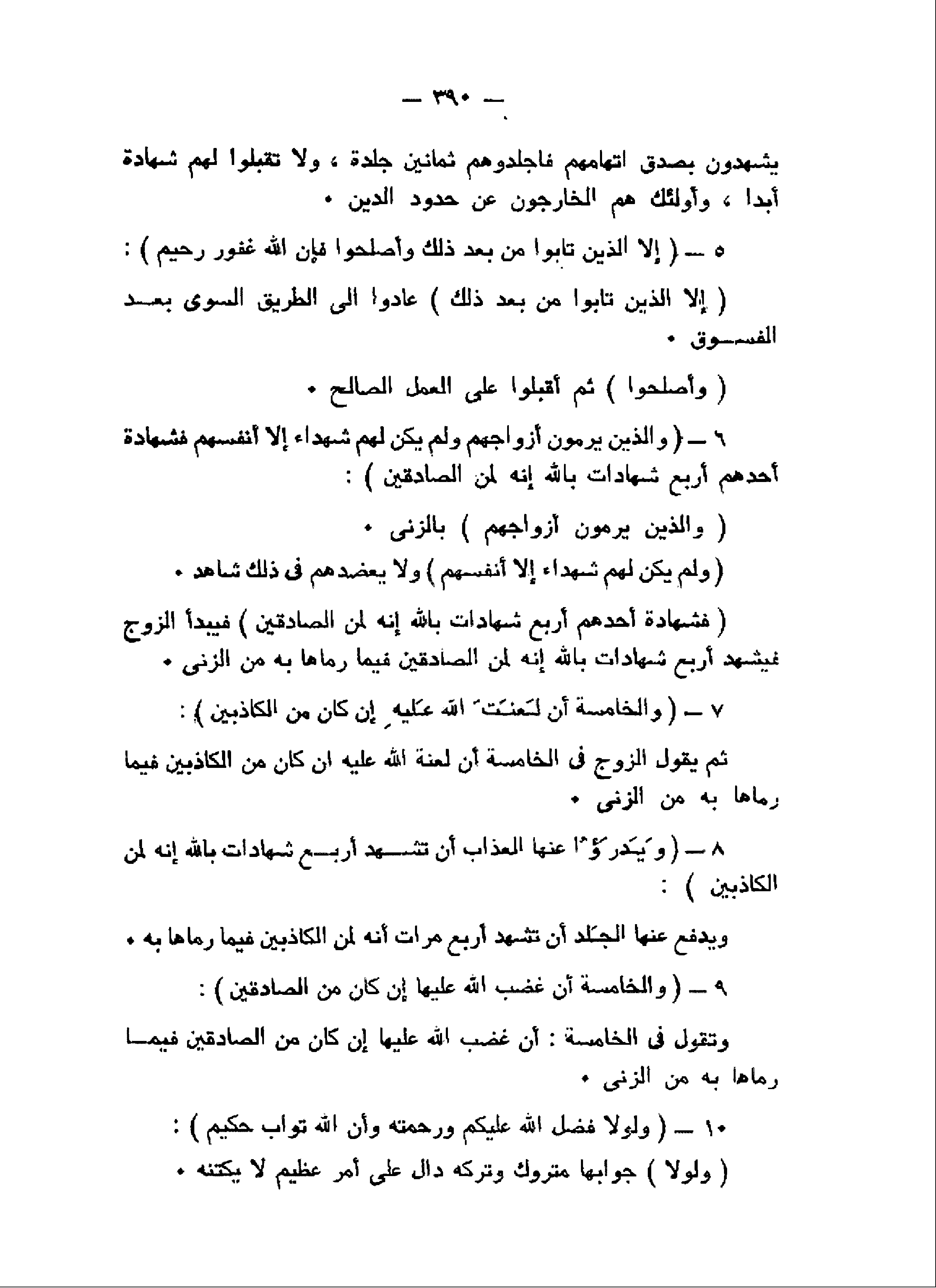 إِلاَّ الَّذِينَ تابُوا مِنْ بَعْدِ ذلِكَ وَأَصْلَحُوا فَإِنَّ اللَّهَ غَفُورٌ رَحِيمٌ (5) وَالَّذِينَ يَرْمُونَ أَزْواجَهُمْ وَلَمْ يَكُنْ لَهُمْ شُهَداءُ إِلاَّ أَنْفُسُهُمْ فَشَهادَةُ أَحَدِهِمْ أَرْبَعُ شَهاداتٍ بِاللَّهِ إِنَّهُ لَمِنَ الصَّادِقِينَ (6) وَالْخامِسَةُ أَنَّ لَعْنَتَ اللَّهِ عَلَيْهِ إِنْ كانَ مِنَ الْكاذِبِينَ (7) وَيَدْرَؤُا عَنْهَا الْعَذابَ أَنْ تَشْهَدَ أَرْبَعَ شَهاداتٍ بِاللَّهِ إِنَّهُ لَمِنَ الْكاذِبِينَ (8) وَالْخامِسَةَ أَنَّ غَضَبَ اللَّهِ عَلَيْها إِنْ كانَ مِنَ الصَّادِقِينَ (9)