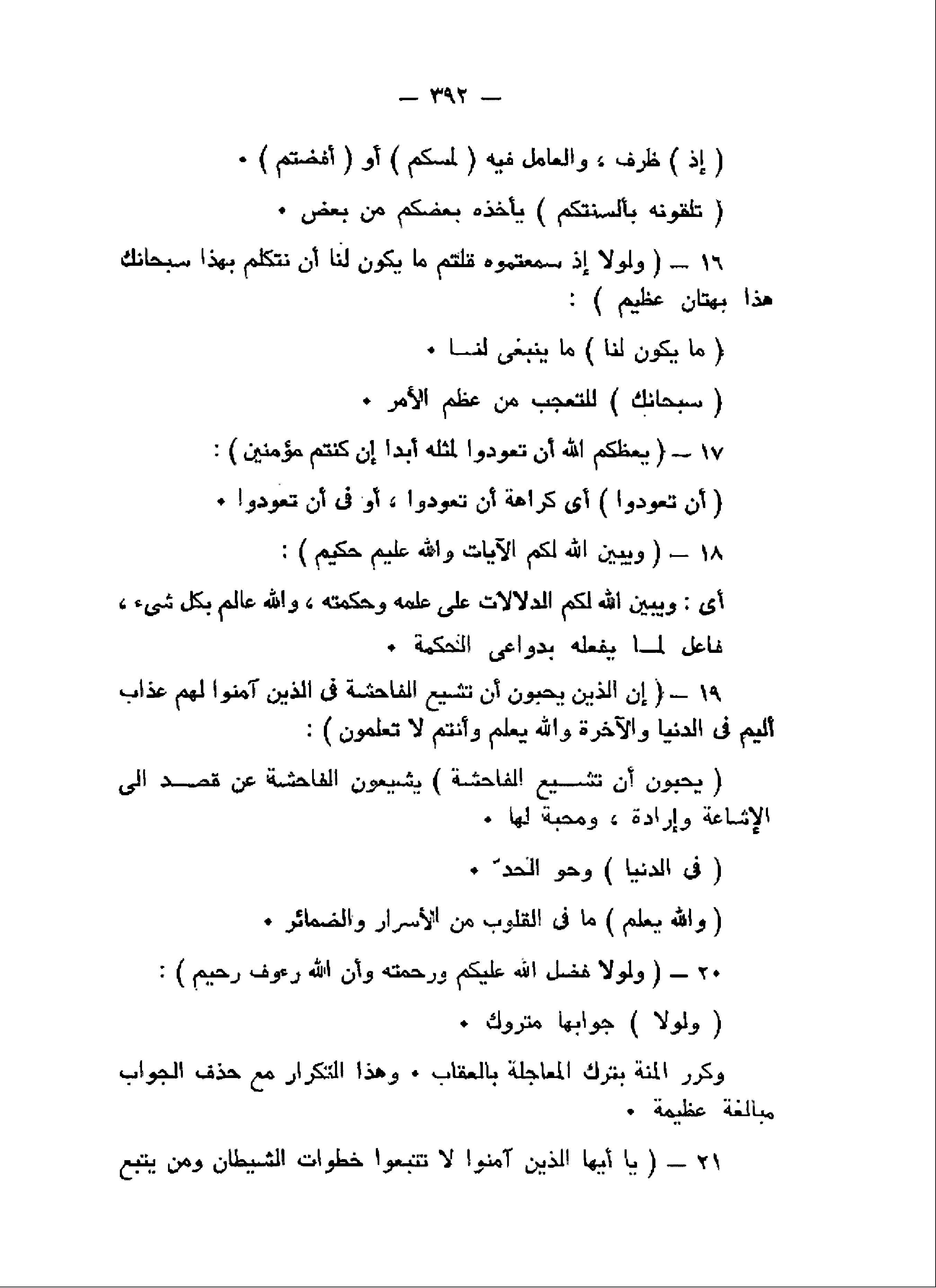 وَلَوْلا إِذْ سَمِعْتُمُوهُ قُلْتُمْ ما يَكُونُ لَنا أَنْ نَتَكَلَّمَ بِهذا سُبْحانَكَ هذا بُهْتانٌ عَظِيمٌ (16) يَعِظُكُمُ اللَّهُ أَنْ تَعُودُوا لِمِثْلِهِ أَبَداً إِنْ كُنْتُمْ مُؤْمِنِينَ (17) وَيُبَيِّنُ اللَّهُ لَكُمُ الْآياتِ وَاللَّهُ عَلِيمٌ حَكِيمٌ (18) إِنَّ الَّذِينَ يُحِبُّونَ أَنْ تَشِيعَ الْفاحِشَةُ فِي الَّذِينَ آمَنُوا لَهُمْ عَذابٌ أَلِيمٌ فِي الدُّنْيا وَالْآخِرَةِ وَاللَّهُ يَعْلَمُ وَأَنْتُمْ لا تَعْلَمُونَ (19) وَلَوْلا فَضْلُ اللَّهِ عَلَيْكُمْ وَرَحْمَتُهُ وَأَنَّ اللَّهَ رَؤُفٌ رَحِيمٌ (20)