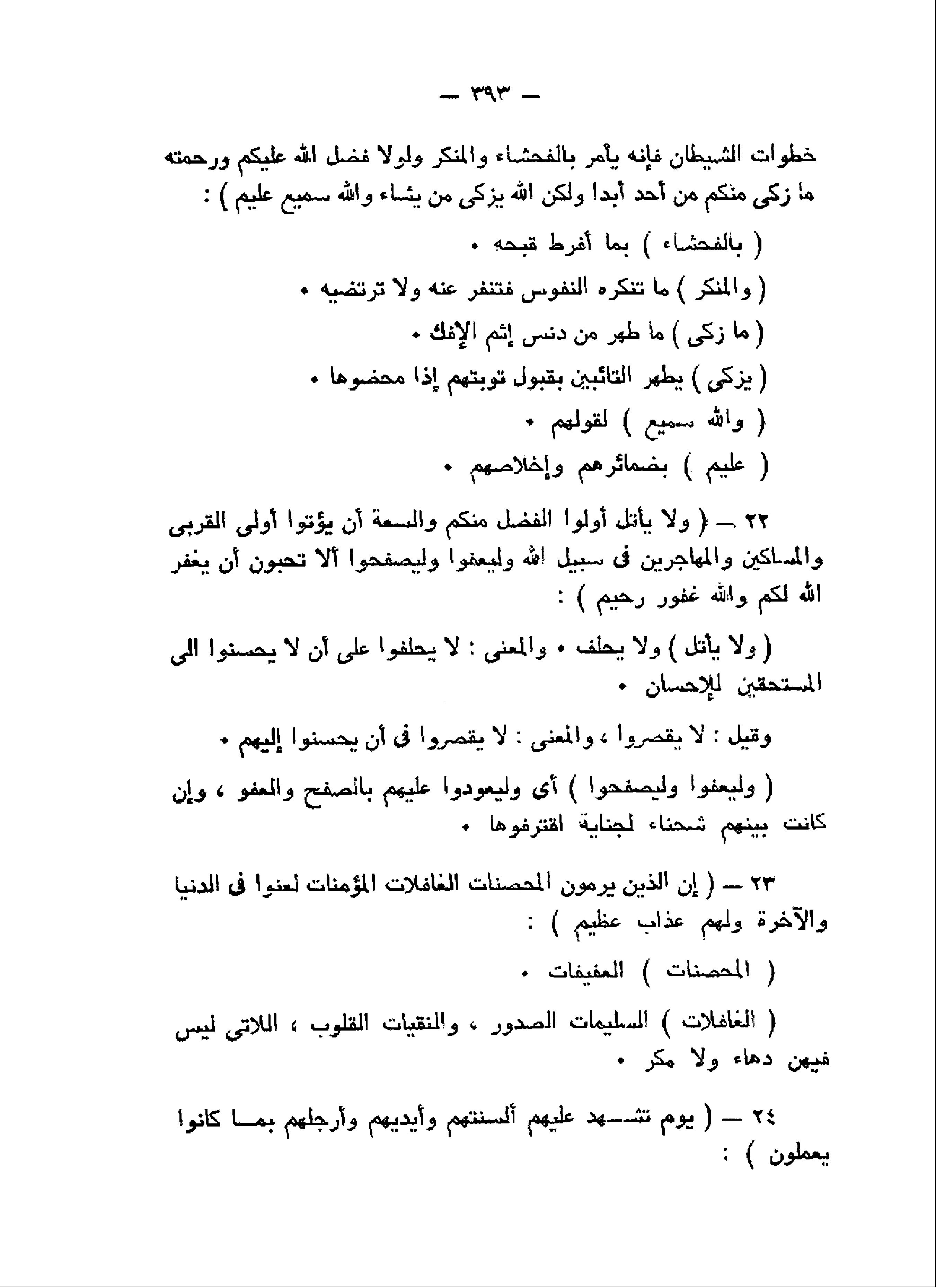 وَلا يَأْتَلِ أُولُوا الْفَضْلِ مِنْكُمْ وَالسَّعَةِ أَنْ يُؤْتُوا أُولِي الْقُرْبى وَالْمَساكِينَ وَالْمُهاجِرِينَ فِي سَبِيلِ اللَّهِ وَلْيَعْفُوا وَلْيَصْفَحُوا أَلا تُحِبُّونَ أَنْ يَغْفِرَ اللَّهُ لَكُمْ وَاللَّهُ غَفُورٌ رَحِيمٌ (22) إِنَّ الَّذِينَ يَرْمُونَ الْمُحْصَناتِ الْغافِلاتِ الْمُؤْمِناتِ لُعِنُوا فِي الدُّنْيا وَالْآخِرَةِ وَلَهُمْ عَذابٌ عَظِيمٌ (23) يَوْمَ تَشْهَدُ عَلَيْهِمْ أَلْسِنَتُهُمْ وَأَيْدِيهِمْ وَأَرْجُلُهُمْ بِما كانُوا يَعْمَلُونَ (24)