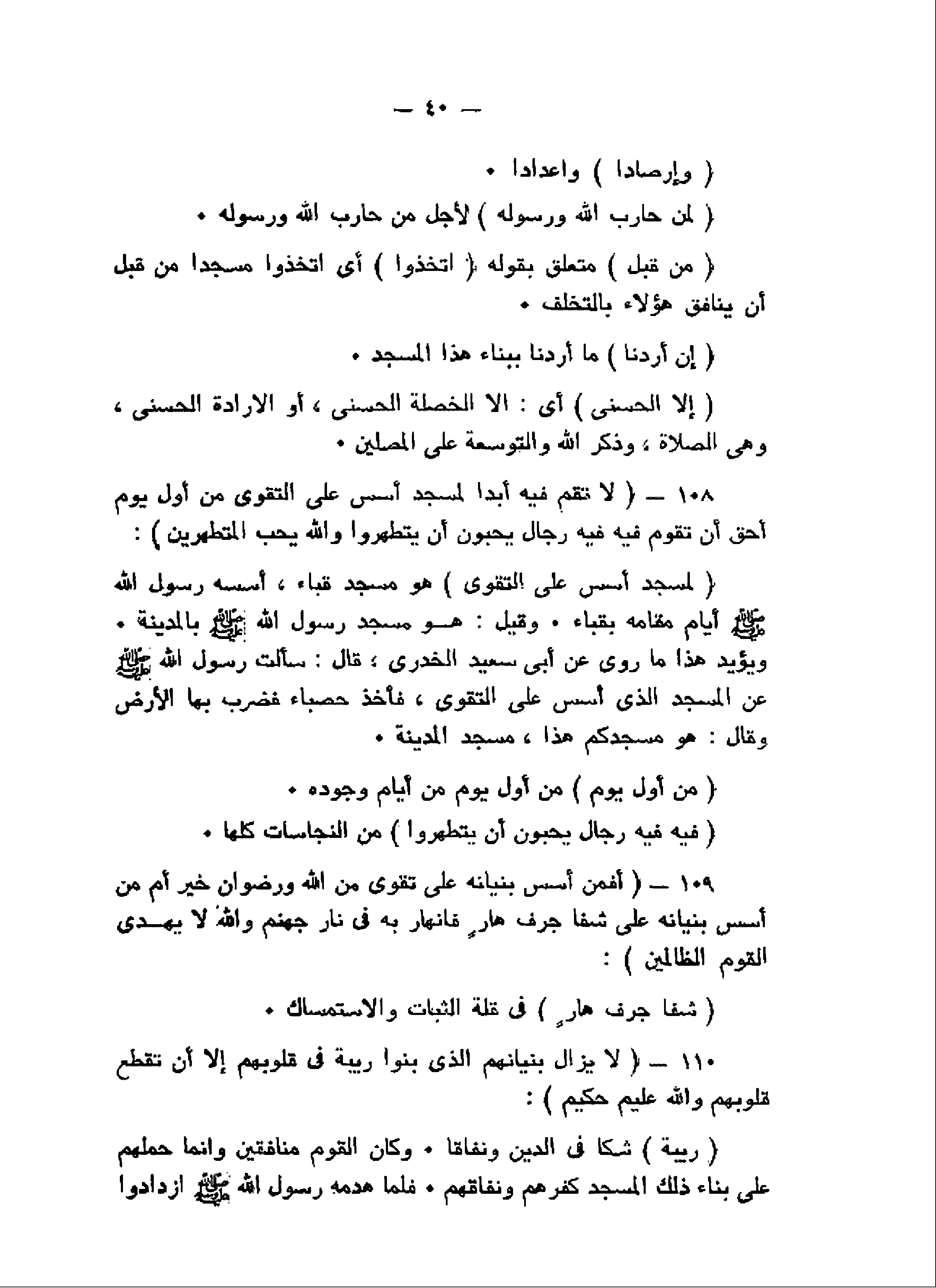 لا تَقُمْ فِيهِ أَبَداً لَمَسْجِدٌ أُسِّسَ عَلَى التَّقْوى مِنْ أَوَّلِ يَوْمٍ أَحَقُّ أَنْ تَقُومَ فِيهِ فِيهِ رِجالٌ يُحِبُّونَ أَنْ يَتَطَهَّرُوا وَاللَّهُ يُحِبُّ الْمُطَّهِّرِينَ (108) أَفَمَنْ أَسَّسَ بُنْيانَهُ عَلى تَقْوى مِنَ اللَّهِ وَرِضْوانٍ خَيْرٌ أَمْ مَنْ أَسَّسَ بُنْيانَهُ عَلى شَفا جُرُفٍ هارٍ فَانْهارَ بِهِ فِي نارِ جَهَنَّمَ وَاللَّهُ لا يَهْدِي الْقَوْمَ الظَّالِمِينَ (109) لا يَزالُ بُنْيانُهُمُ الَّذِي بَنَوْا رِيبَةً فِي قُلُوبِهِمْ إِلاَّ أَنْ تَقَطَّعَ قُلُوبُهُمْ وَاللَّهُ عَلِيمٌ حَكِيمٌ (110)