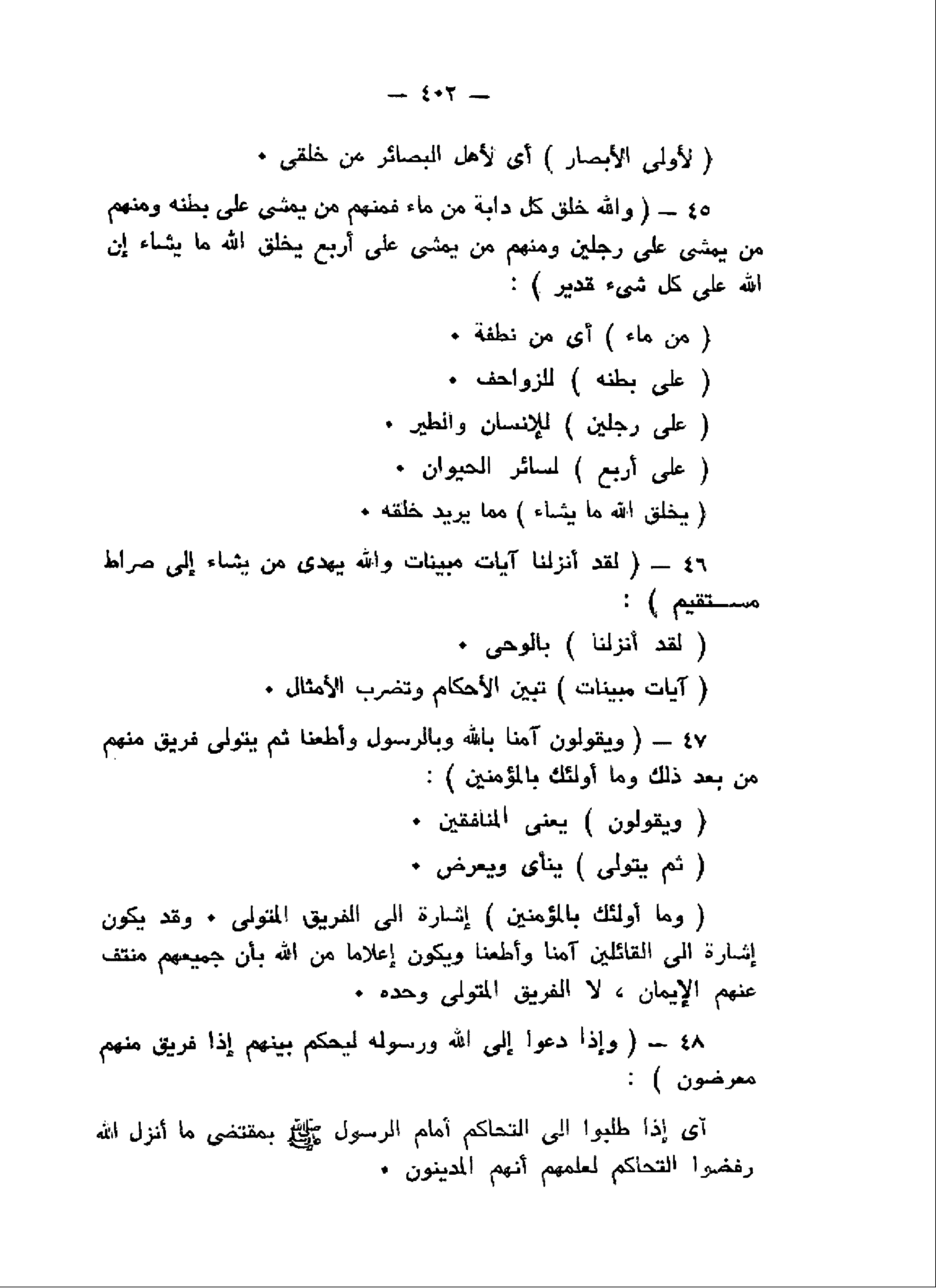 وَاللَّهُ خَلَقَ كُلَّ دَابَّةٍ مِنْ ماءٍ فَمِنْهُمْ مَنْ يَمْشِي عَلى بَطْنِهِ وَمِنْهُمْ مَنْ يَمْشِي عَلى رِجْلَيْنِ وَمِنْهُمْ مَنْ يَمْشِي عَلى أَرْبَعٍ يَخْلُقُ اللَّهُ ما يَشاءُ إِنَّ اللَّهَ عَلى كُلِّ شَيْءٍ قَدِيرٌ (45) لَقَدْ أَنْزَلْنا آياتٍ مُبَيِّناتٍ وَاللَّهُ يَهْدِي مَنْ يَشاءُ إِلى صِراطٍ مُسْتَقِيمٍ (46) وَيَقُولُونَ آمَنَّا بِاللَّهِ وَبِالرَّسُولِ وَأَطَعْنا ثُمَّ يَتَوَلَّى فَرِيقٌ مِنْهُمْ مِنْ بَعْدِ ذلِكَ وَما أُولئِكَ بِالْمُؤْمِنِينَ (47) وَإِذا دُعُوا إِلَى اللَّهِ وَرَسُولِهِ لِيَحْكُمَ بَيْنَهُمْ إِذا فَرِيقٌ مِنْهُمْ مُعْرِضُونَ (48)