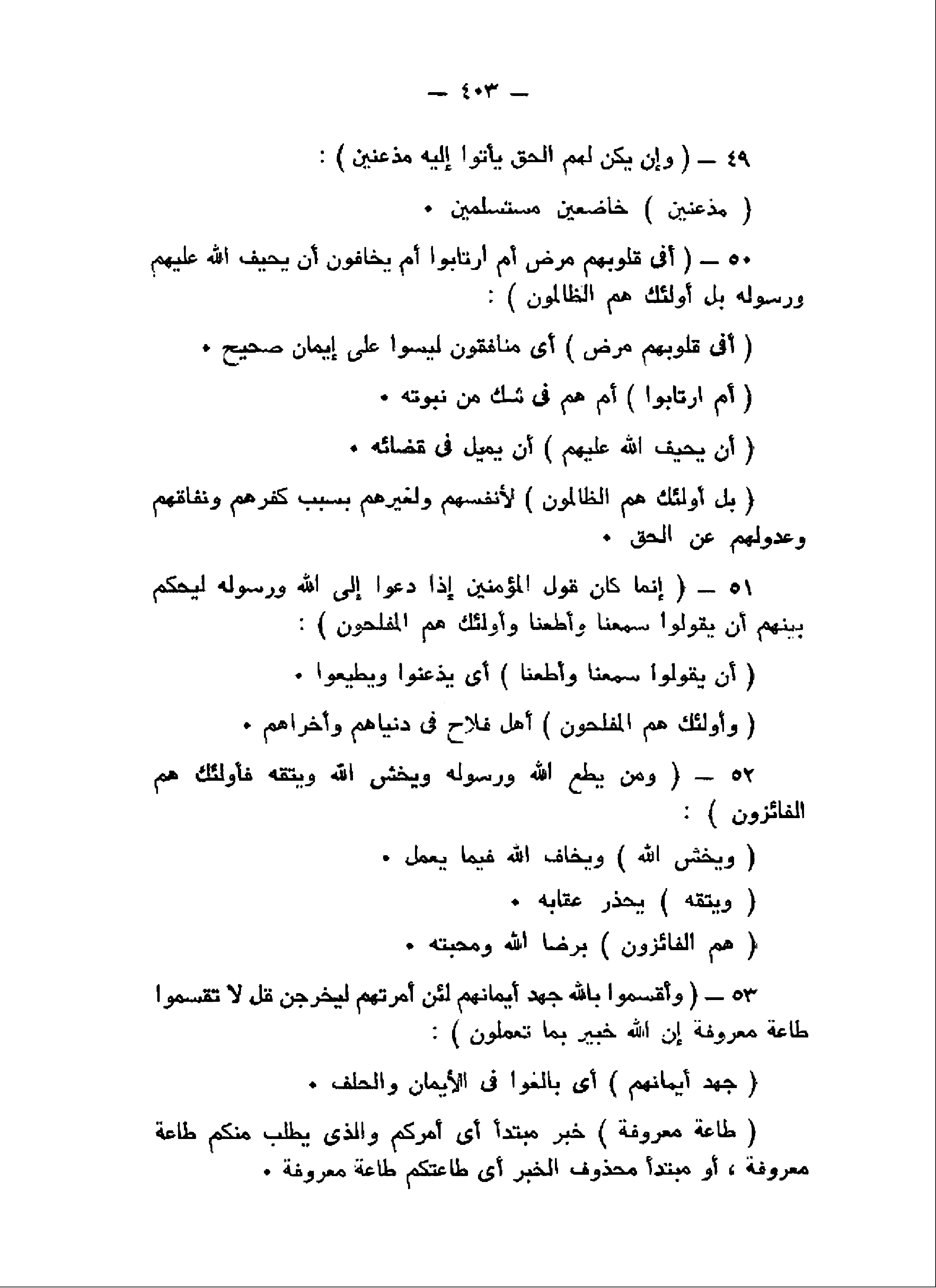 وَإِنْ يَكُنْ لَهُمُ الْحَقُّ يَأْتُوا إِلَيْهِ مُذْعِنِينَ (49) أَفِي قُلُوبِهِمْ مَرَضٌ أَمِ ارْتابُوا أَمْ يَخافُونَ أَنْ يَحِيفَ اللَّهُ عَلَيْهِمْ وَرَسُولُهُ بَلْ أُولئِكَ هُمُ الظَّالِمُونَ (50) إِنَّما كانَ قَوْلَ الْمُؤْمِنِينَ إِذا دُعُوا إِلَى اللَّهِ وَرَسُولِهِ لِيَحْكُمَ بَيْنَهُمْ أَنْ يَقُولُوا سَمِعْنا وَأَطَعْنا وَأُولئِكَ هُمُ الْمُفْلِحُونَ (51) وَمَنْ يُطِعِ اللَّهَ وَرَسُولَهُ وَيَخْشَ اللَّهَ وَيَتَّقْهِ فَأُولئِكَ هُمُ الْفائِزُونَ (52) وَأَقْسَمُوا بِاللَّهِ جَهْدَ أَيْمانِهِمْ لَئِنْ أَمَرْتَهُمْ لَيَخْرُجُنَّ قُلْ لا تُقْسِمُوا طاعَةٌ مَعْرُوفَةٌ إِنَّ اللَّهَ خَبِيرٌ بِما تَعْمَلُونَ (53)