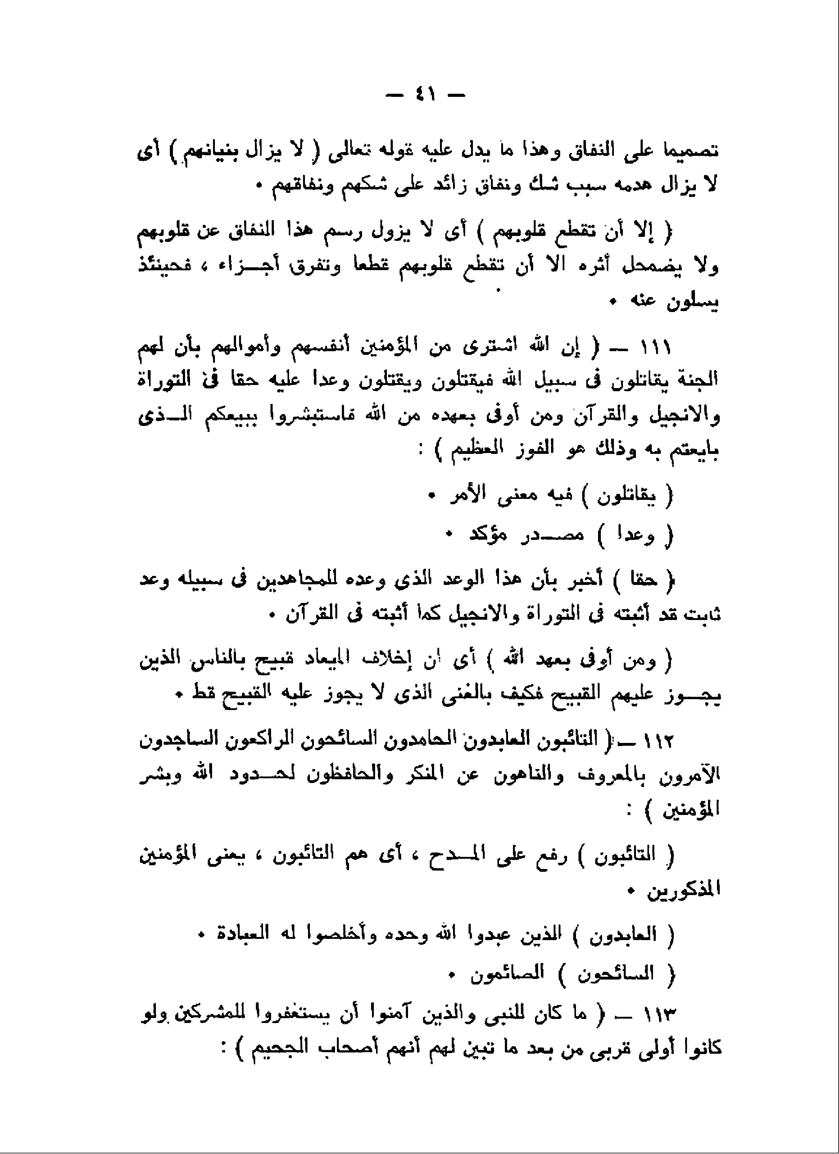 إِنَّ اللَّهَ اشْتَرى مِنَ الْمُؤْمِنِينَ أَنْفُسَهُمْ وَأَمْوالَهُمْ بِأَنَّ لَهُمُ الْجَنَّةَ يُقاتِلُونَ فِي سَبِيلِ اللَّهِ فَيَقْتُلُونَ وَيُقْتَلُونَ وَعْداً عَلَيْهِ حَقًّا فِي التَّوْراةِ وَالْإِنْجِيلِ وَالْقُرْآنِ وَمَنْ أَوْفى بِعَهْدِهِ مِنَ اللَّهِ فَاسْتَبْشِرُوا بِبَيْعِكُمُ الَّذِي بايَعْتُمْ بِهِ وَذلِكَ هُوَ الْفَوْزُ الْعَظِيمُ (111) التَّائِبُونَ الْعابِدُونَ الْحامِدُونَ السَّائِحُونَ الرَّاكِعُونَ السَّاجِدُونَ الْآمِرُونَ بِالْمَعْرُوفِ وَالنَّاهُونَ عَنِ الْمُنْكَرِ وَالْحافِظُونَ لِحُدُودِ اللَّهِ وَبَشِّرِ الْمُؤْمِنِينَ (112) ما كانَ لِلنَّبِيِّ وَالَّذِينَ آمَنُوا أَنْ يَسْتَغْفِرُوا لِلْمُشْرِكِينَ وَلَوْ كانُوا أُولِي قُرْبى مِنْ بَعْدِ ما تَبَيَّنَ لَهُمْ أَنَّهُمْ أَصْحابُ الْجَحِيمِ (113)