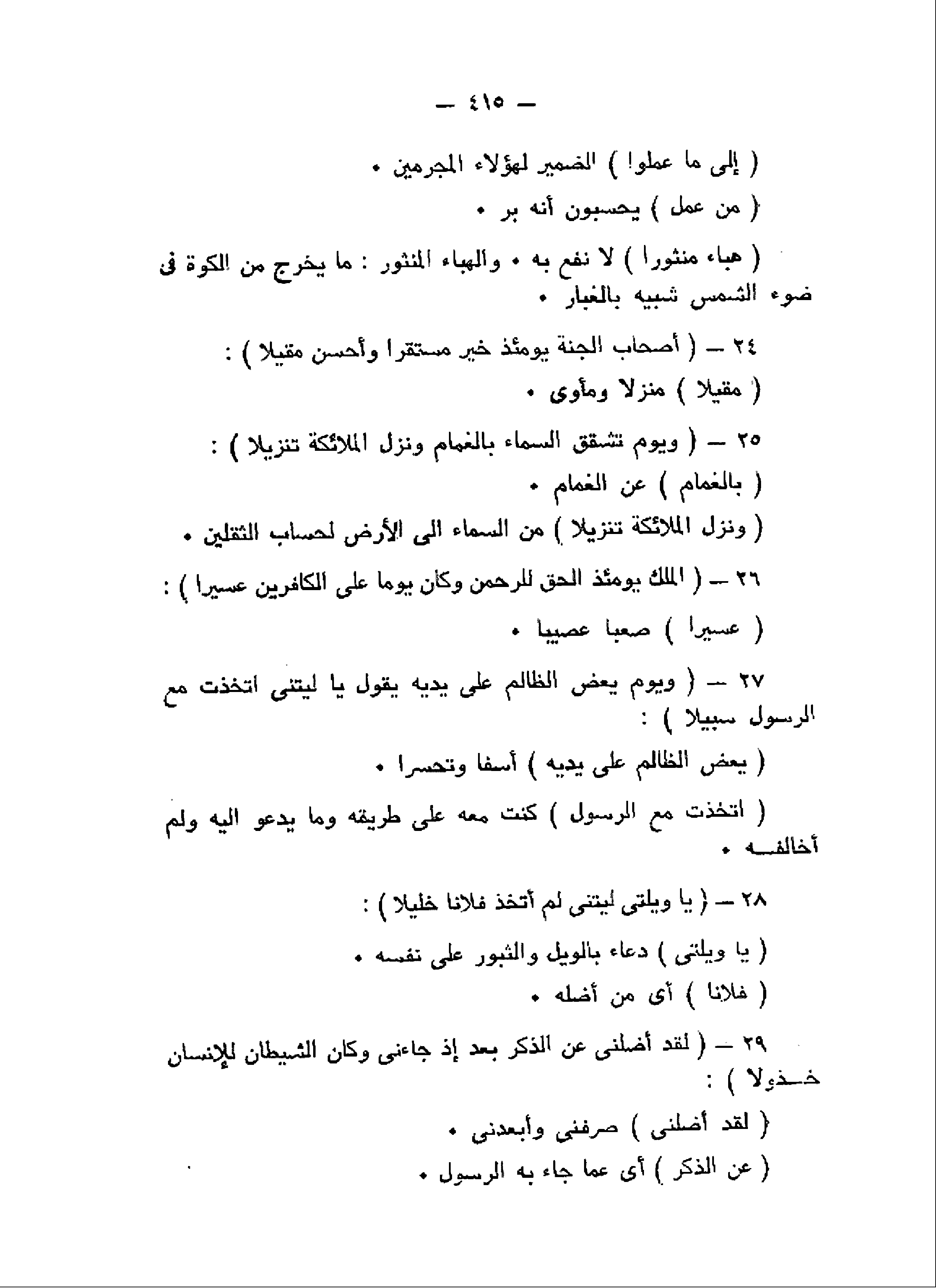 أَصْحابُ الْجَنَّةِ يَوْمَئِذٍ خَيْرٌ مُسْتَقَرًّا وَأَحْسَنُ مَقِيلاً (24) وَيَوْمَ تَشَقَّقُ السَّماءُ بِالْغَمامِ وَنُزِّلَ الْمَلائِكَةُ تَنْزِيلاً (25) الْمُلْكُ يَوْمَئِذٍ الْحَقُّ لِلرَّحْمنِ وَكانَ يَوْماً عَلَى الْكافِرِينَ عَسِيراً (26) وَيَوْمَ يَعَضُّ الظَّالِمُ عَلى يَدَيْهِ يَقُولُ يا لَيْتَنِي اتَّخَذْتُ مَعَ الرَّسُولِ سَبِيلاً (27) يا وَيْلَتى لَيْتَنِي لَمْ أَتَّخِذْ فُلاناً خَلِيلاً (28)