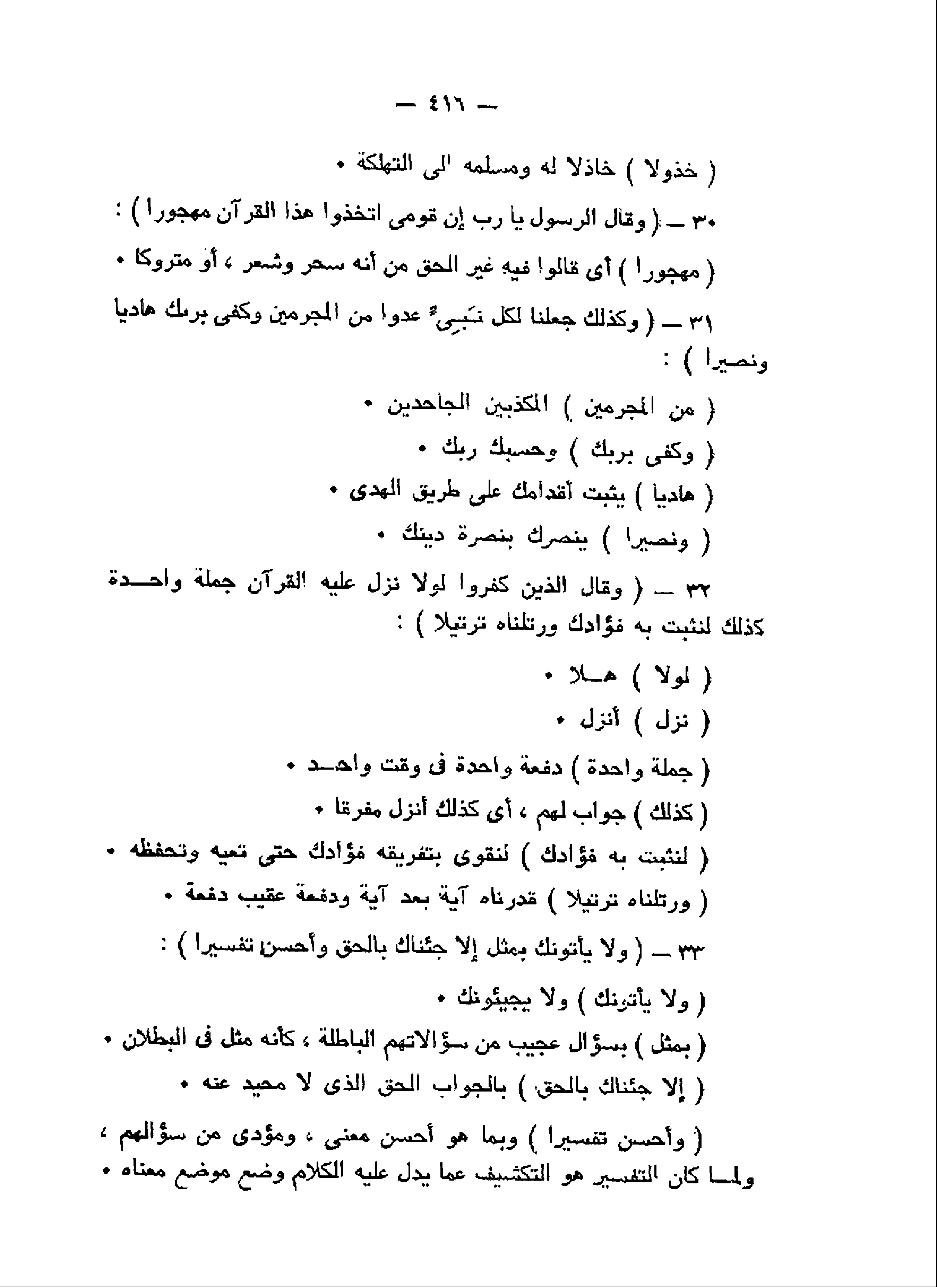 وَقالَ الرَّسُولُ يا رَبِّ إِنَّ قَوْمِي اتَّخَذُوا هذَا الْقُرْآنَ مَهْجُوراً (30) وَكَذلِكَ جَعَلْنا لِكُلِّ نَبِيٍّ عَدُوًّا مِنَ الْمُجْرِمِينَ وَكَفى بِرَبِّكَ هادِياً وَنَصِيراً (31) وَقالَ الَّذِينَ كَفَرُوا لَوْلا نُزِّلَ عَلَيْهِ الْقُرْآنُ جُمْلَةً واحِدَةً كَذلِكَ لِنُثَبِّتَ بِهِ فُؤادَكَ وَرَتَّلْناهُ تَرْتِيلاً (32) وَلا يَأْتُونَكَ بِمَثَلٍ إِلاَّ جِئْناكَ بِالْحَقِّ وَأَحْسَنَ تَفْسِيراً (33)