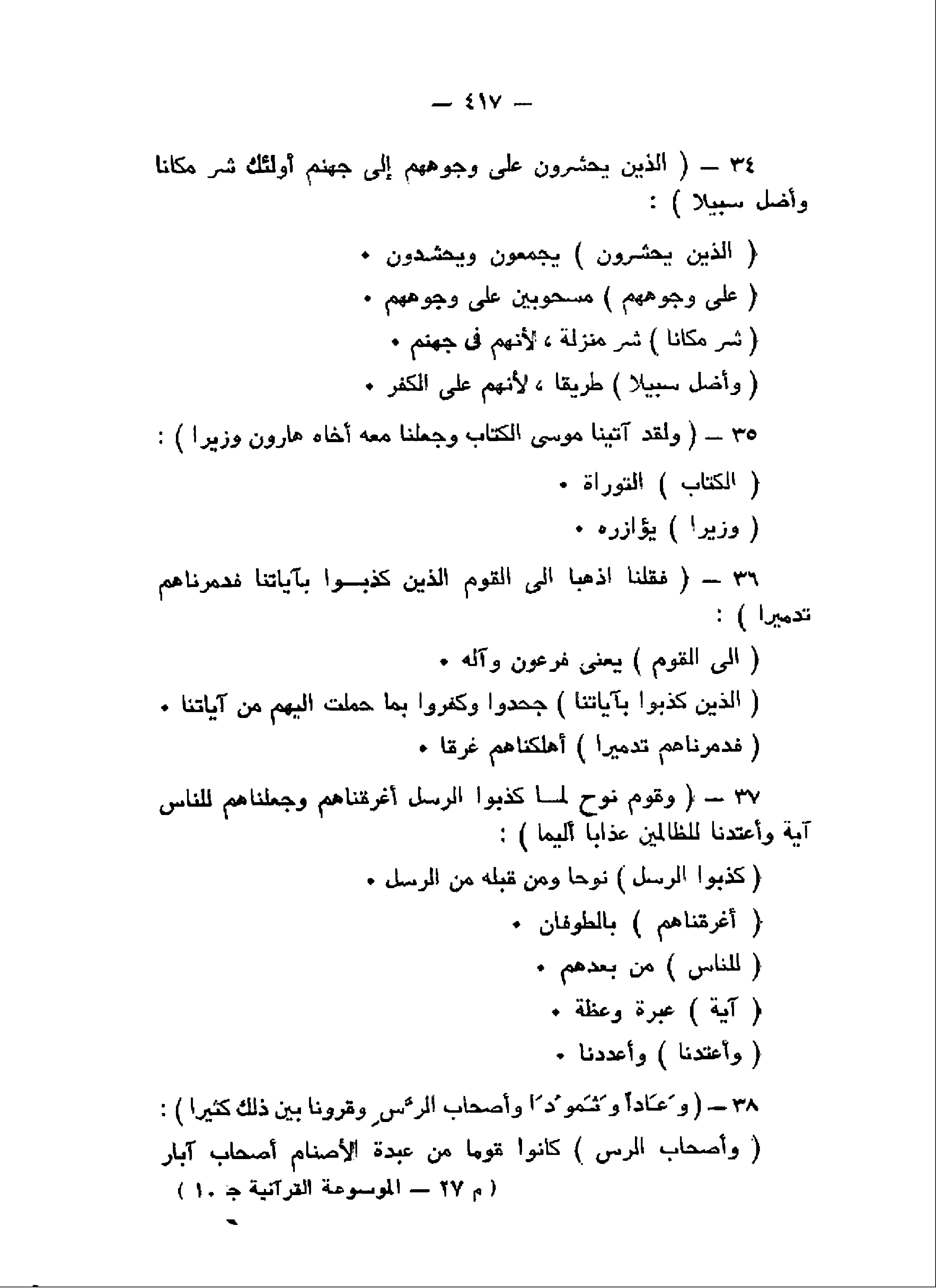 الَّذِينَ يُحْشَرُونَ عَلى وُجُوهِهِمْ إِلى جَهَنَّمَ أُوْلئِكَ شَرٌّ مَكاناً وَأَضَلُّ سَبِيلاً (34) وَلَقَدْ آتَيْنا مُوسَى الْكِتابَ وَجَعَلْنا مَعَهُ أَخاهُ هارُونَ وَزِيراً (35) فَقُلْنَا اذْهَبا إِلَى الْقَوْمِ الَّذِينَ كَذَّبُوا بِآياتِنا فَدَمَّرْناهُمْ تَدْمِيراً (36) وَقَوْمَ نُوحٍ لَمَّا كَذَّبُوا الرُّسُلَ أَغْرَقْناهُمْ وَجَعَلْناهُمْ لِلنَّاسِ آيَةً وَأَعْتَدْنا لِلظَّالِمِينَ عَذاباً أَلِيماً (37) وَعاداً وَثَمُودَ وَأَصْحابَ الرَّسِّ وَقُرُوناً بَيْنَ ذلِكَ كَثِيراً (38)