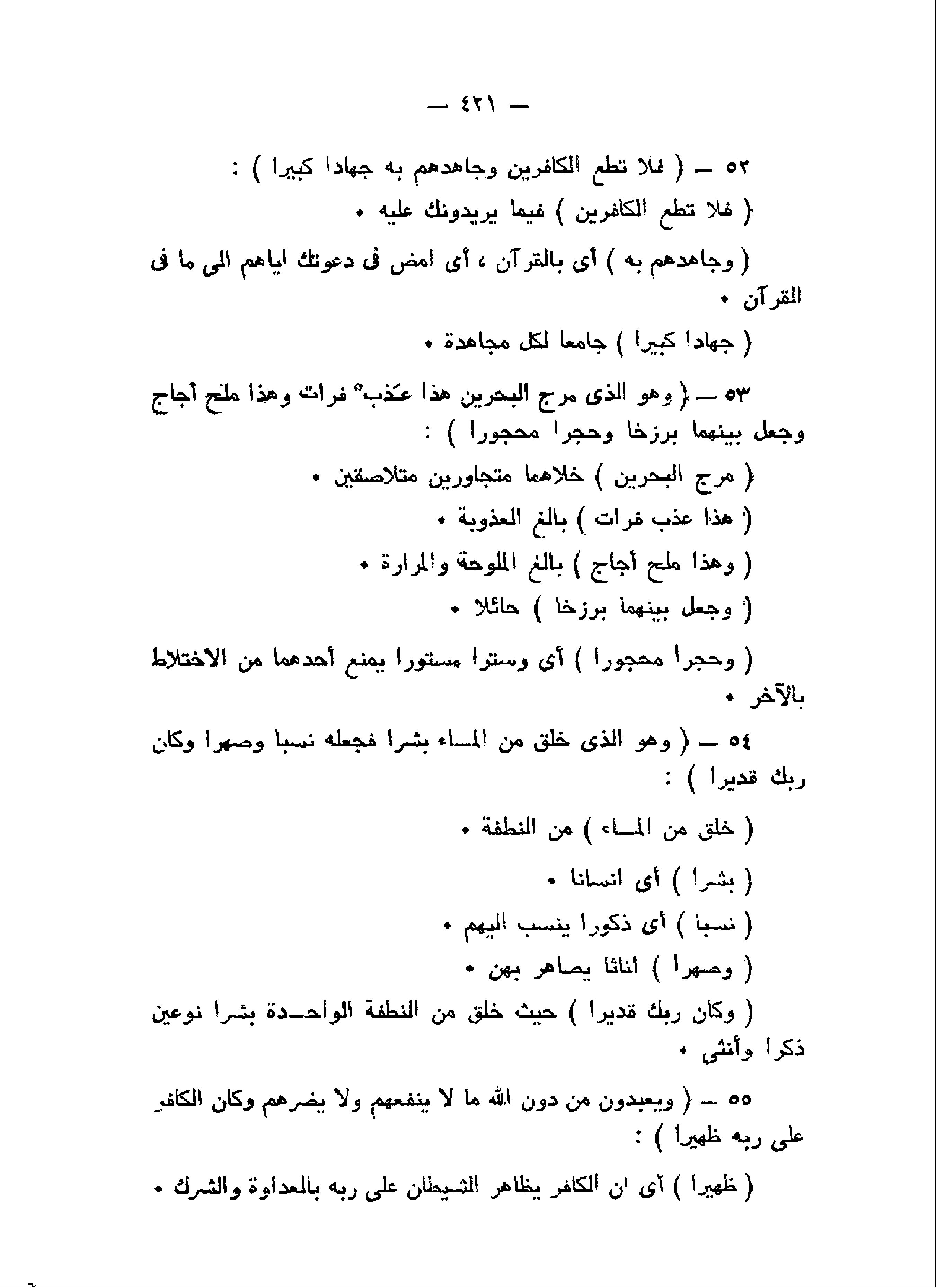 فَلا تُطِعِ الْكافِرِينَ وَجاهِدْهُمْ بِهِ جِهاداً كَبِيراً (52) وَهُوَ الَّذِي مَرَجَ الْبَحْرَيْنِ هذا عَذْبٌ فُراتٌ وَهذا مِلْحٌ أُجاجٌ وَجَعَلَ بَيْنَهُما بَرْزَخاً وَحِجْراً مَحْجُوراً (53) وَهُوَ الَّذِي خَلَقَ مِنَ الْماءِ بَشَراً فَجَعَلَهُ نَسَباً وَصِهْراً وَكانَ رَبُّكَ قَدِيراً (54) وَيَعْبُدُونَ مِنْ دُونِ اللَّهِ ما لا يَنْفَعُهُمْ وَلا يَضُرُّهُمْ وَكانَ الْكافِرُ عَلى رَبِّهِ ظَهِيراً (55)