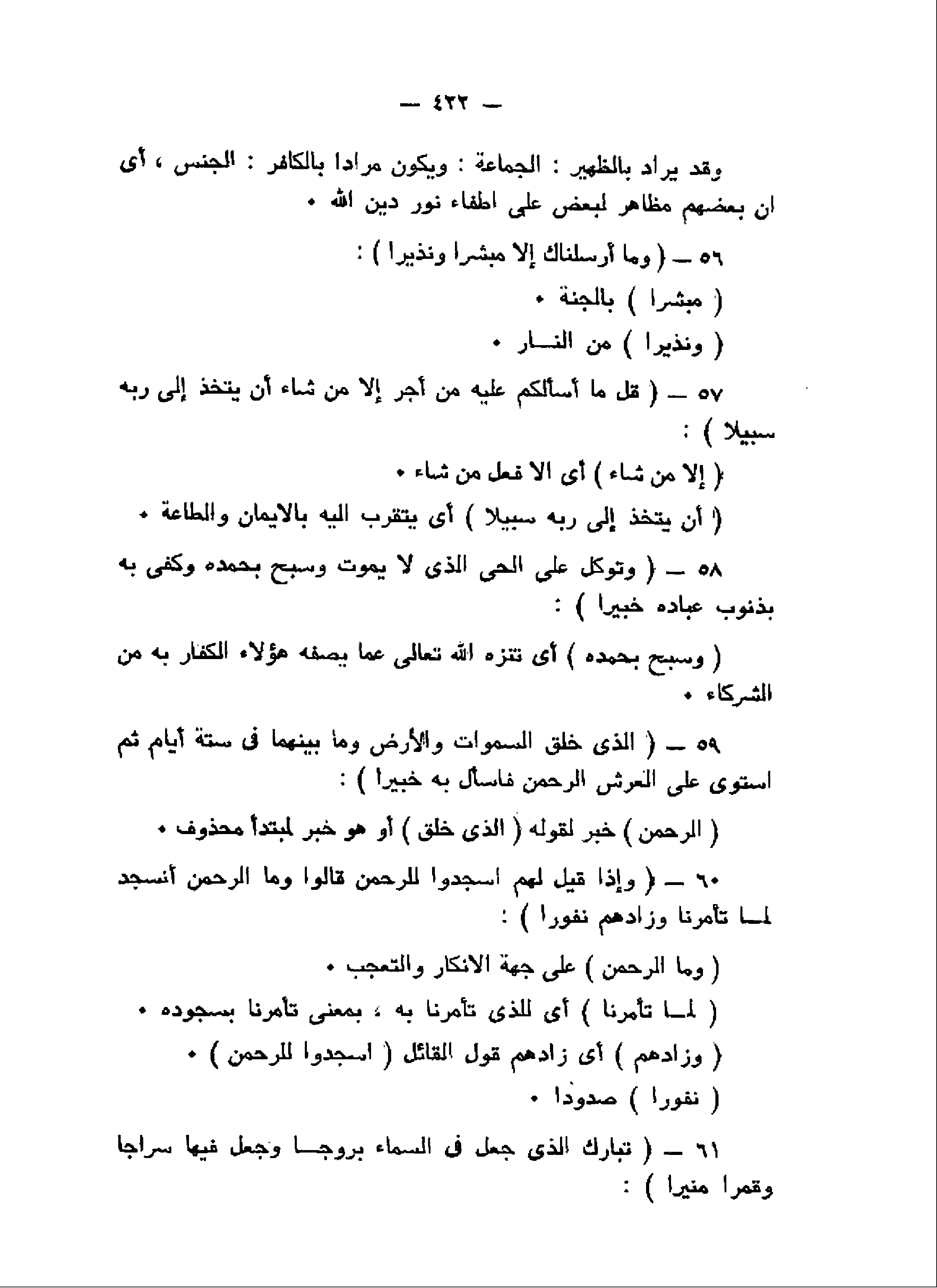 وَما أَرْسَلْناكَ إِلاَّ مُبَشِّراً وَنَذِيراً (56) قُلْ ما أَسْئَلُكُمْ عَلَيْهِ مِنْ أَجْرٍ إِلاَّ مَنْ شاءَ أَنْ يَتَّخِذَ إِلى رَبِّهِ سَبِيلاً (57) وَتَوَكَّلْ عَلَى الْحَيِّ الَّذِي لا يَمُوتُ وَسَبِّحْ بِحَمْدِهِ وَكَفى بِهِ بِذُنُوبِ عِبادِهِ خَبِيراً (58) الَّذِي خَلَقَ السَّماواتِ وَالْأَرْضَ وَما بَيْنَهُما فِي سِتَّةِ أَيَّامٍ ثُمَّ اسْتَوى عَلَى الْعَرْشِ الرَّحْمنُ فَسْئَلْ بِهِ خَبِيراً (59) وَإِذا قِيلَ لَهُمُ اسْجُدُوا لِلرَّحْمنِ قالُوا وَمَا الرَّحْمنُ أَنَسْجُدُ لِما تَأْمُرُنا وَزادَهُمْ نُفُوراً (60)