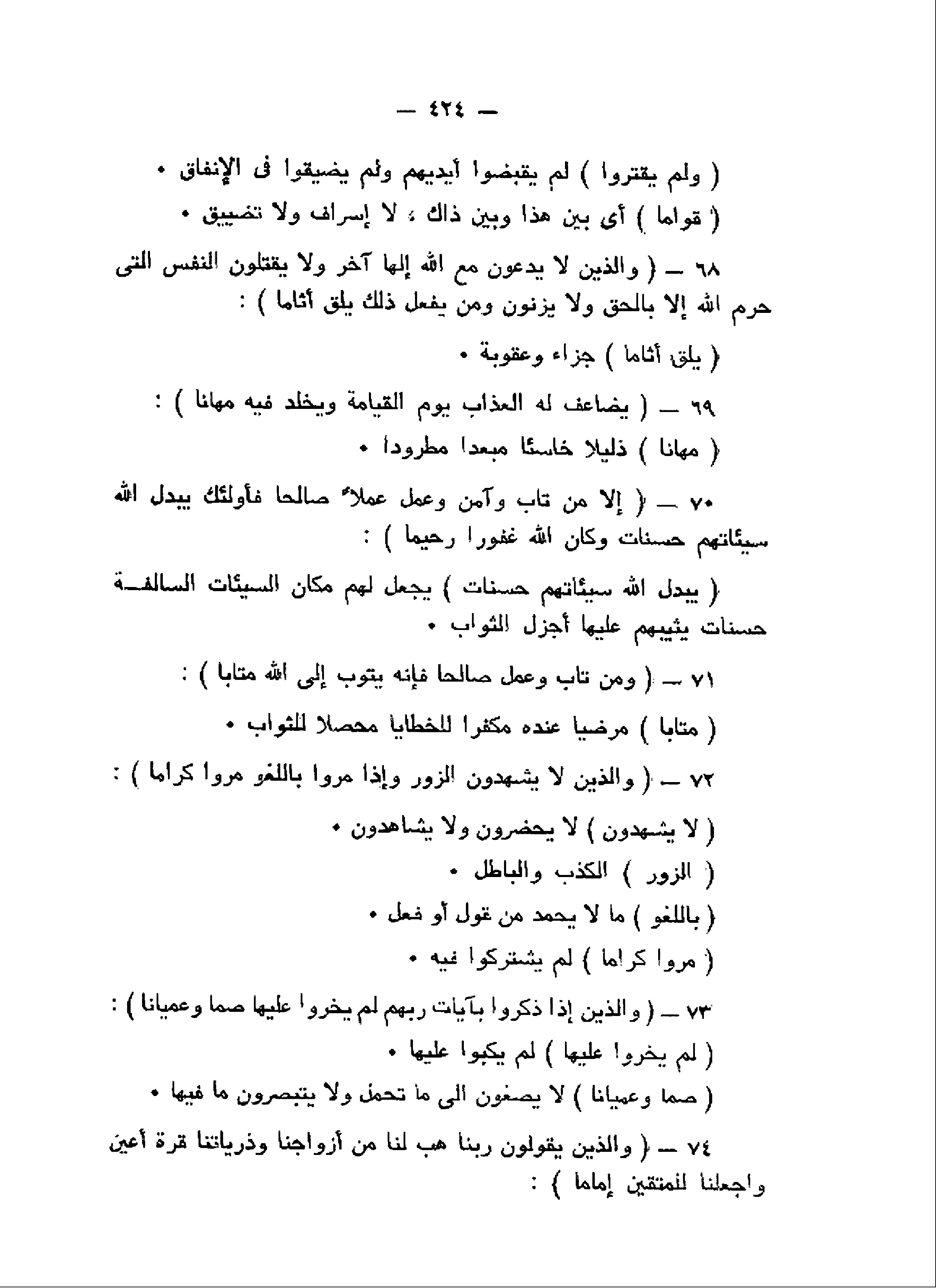 وَالَّذِينَ لا يَدْعُونَ مَعَ اللَّهِ إِلهاً آخَرَ وَلا يَقْتُلُونَ النَّفْسَ الَّتِي حَرَّمَ اللَّهُ إِلاَّ بِالْحَقِّ وَلا يَزْنُونَ وَمَنْ يَفْعَلْ ذلِكَ يَلْقَ أَثاماً (68) يُضاعَفْ لَهُ الْعَذابُ يَوْمَ الْقِيامَةِ وَيَخْلُدْ فِيهِ مُهاناً (69) إِلاَّ مَنْ تابَ وَآمَنَ وَعَمِلَ عَمَلاً صالِحاً فَأُوْلئِكَ يُبَدِّلُ اللَّهُ سَيِّئاتِهِمْ حَسَناتٍ وَكانَ اللَّهُ غَفُوراً رَحِيماً (70) وَمَنْ تابَ وَعَمِلَ صالِحاً فَإِنَّهُ يَتُوبُ إِلَى اللَّهِ مَتاباً (71) وَالَّذِينَ لا يَشْهَدُونَ الزُّورَ وَإِذا مَرُّوا بِاللَّغْوِ مَرُّوا كِراماً (72)