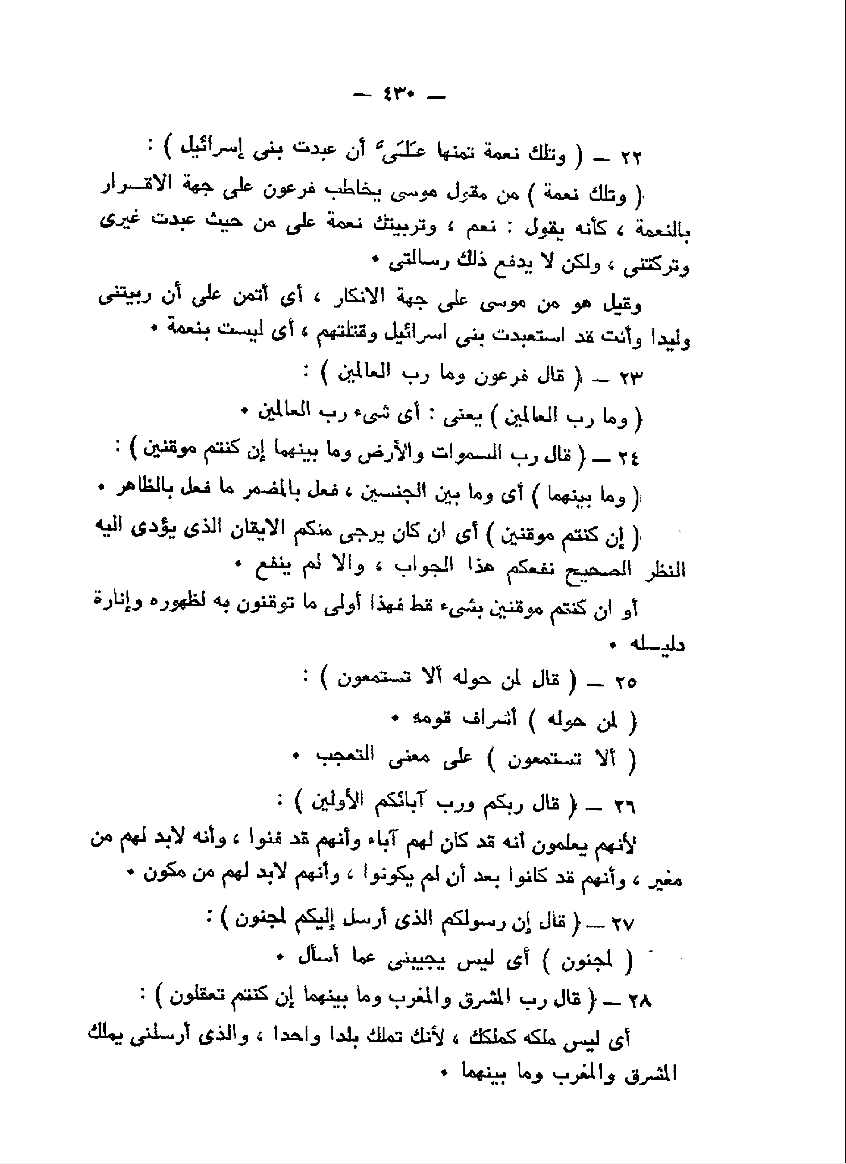 وَتِلْكَ نِعْمَةٌ تَمُنُّها عَلَيَّ أَنْ عَبَّدْتَ بَنِي إِسْرائِيلَ (22) قالَ فِرْعَوْنُ وَما رَبُّ الْعالَمِينَ (23) قالَ رَبُّ السَّماواتِ وَالْأَرْضِ وَما بَيْنَهُمَا إِنْ كُنْتُمْ مُوقِنِينَ (24) قالَ لِمَنْ حَوْلَهُ أَلا تَسْتَمِعُونَ (25) قالَ رَبُّكُمْ وَرَبُّ آبائِكُمُ الْأَوَّلِينَ (26)