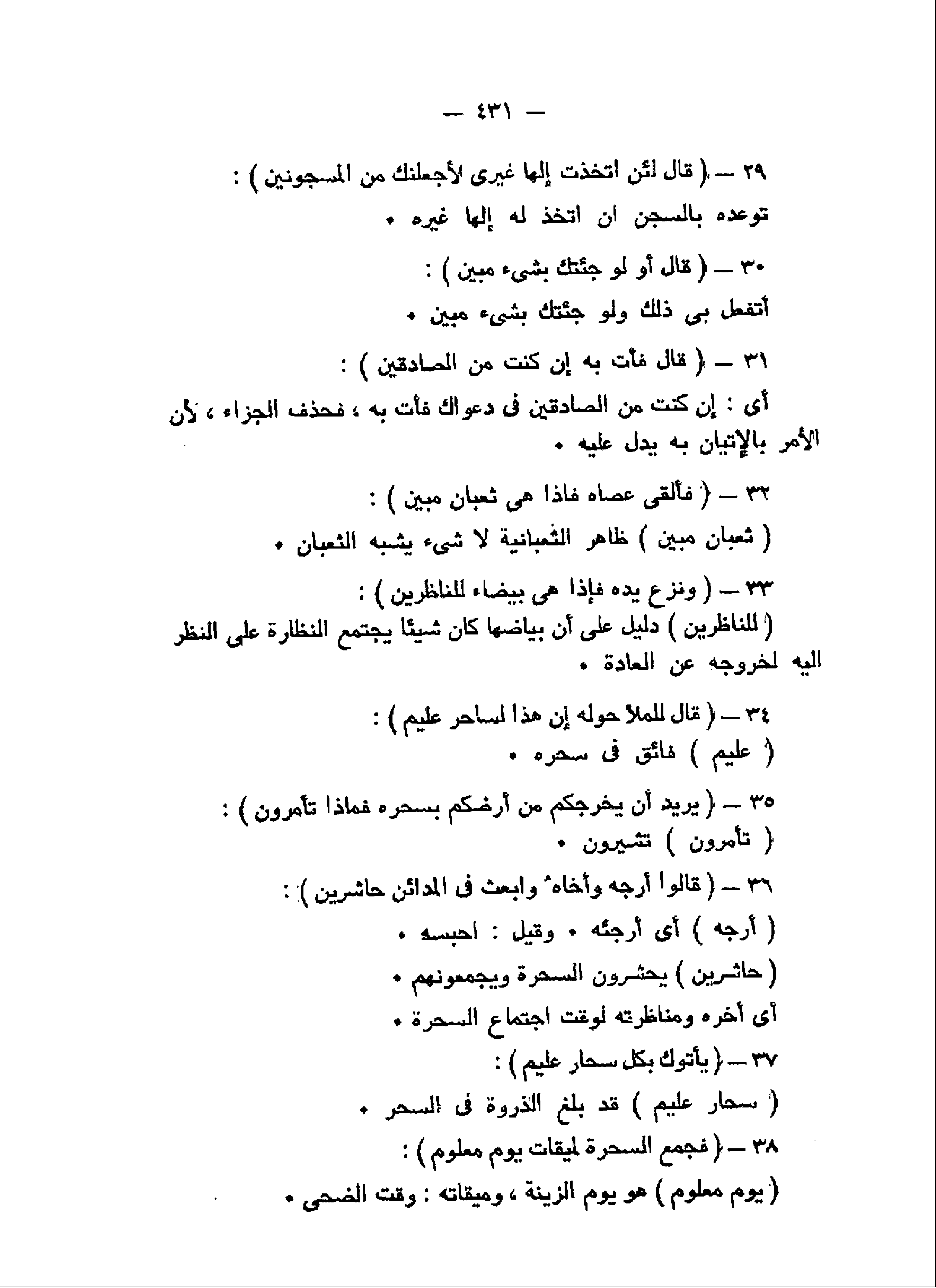 قالَ لَئِنِ اتَّخَذْتَ إِلهَاً غَيْرِي لَأَجْعَلَنَّكَ مِنَ الْمَسْجُونِينَ (29) قالَ أَوَلَوْ جِئْتُكَ بِشَيْءٍ مُبِينٍ (30) قالَ فَأْتِ بِهِ إِنْ كُنْتَ مِنَ الصَّادِقِينَ (31) فَأَلْقى عَصاهُ فَإِذا هِيَ ثُعْبانٌ مُبِينٌ (32) وَنَزَعَ يَدَهُ فَإِذا هِيَ بَيْضاءُ لِلنَّاظِرِينَ (33)