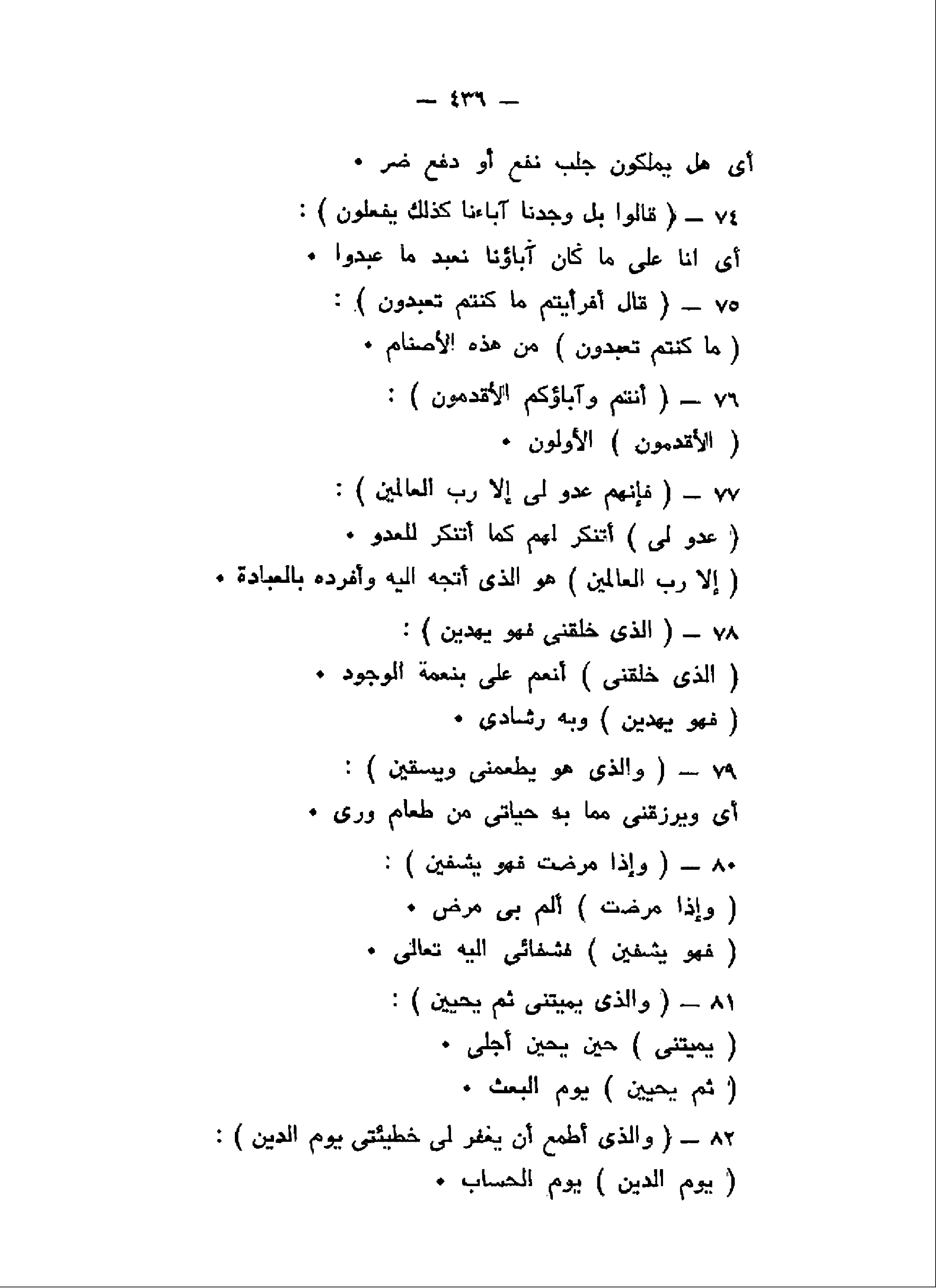 قالُوا بَلْ وَجَدْنا آباءَنا كَذلِكَ يَفْعَلُونَ (74) قالَ أَفَرَأَيْتُمْ ما كُنْتُمْ تَعْبُدُونَ (75) أَنْتُمْ وَآباؤُكُمُ الْأَقْدَمُونَ (76) فَإِنَّهُمْ عَدُوٌّ لِي إِلاَّ رَبَّ الْعالَمِينَ (77) الَّذِي خَلَقَنِي فَهُوَ يَهْدِينِ (78)