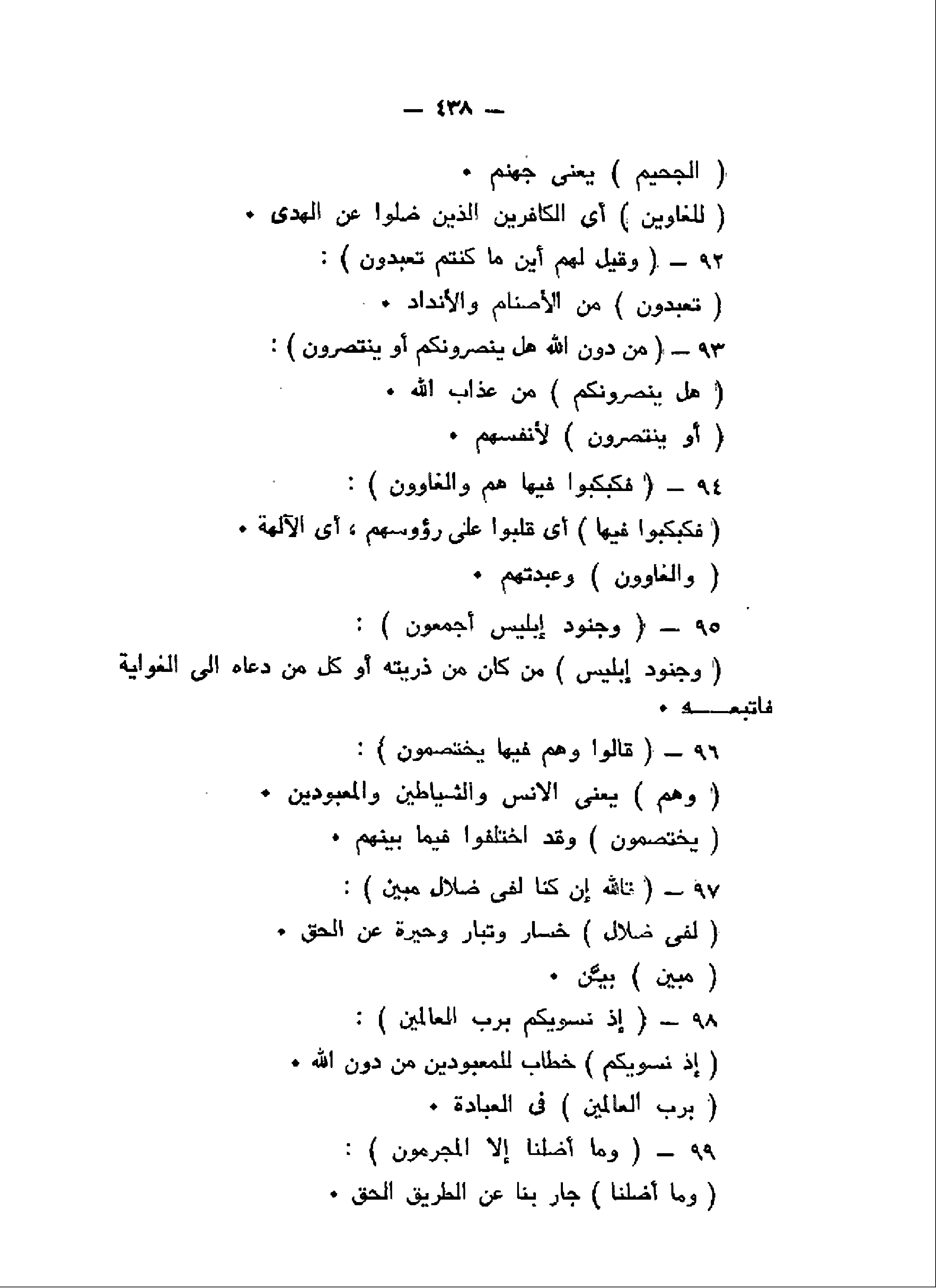 وَقِيلَ لَهُمْ أَيْنَ ما كُنْتُمْ تَعْبُدُونَ (92) مِنْ دُونِ اللَّهِ هَلْ يَنْصُرُونَكُمْ أَوْ يَنْتَصِرُونَ (93) فَكُبْكِبُوا فِيها هُمْ وَالْغاوُونَ (94) وَجُنُودُ إِبْلِيسَ أَجْمَعُونَ (95) قالُوا وَهُمْ فِيها يَخْتَصِمُونَ (96)